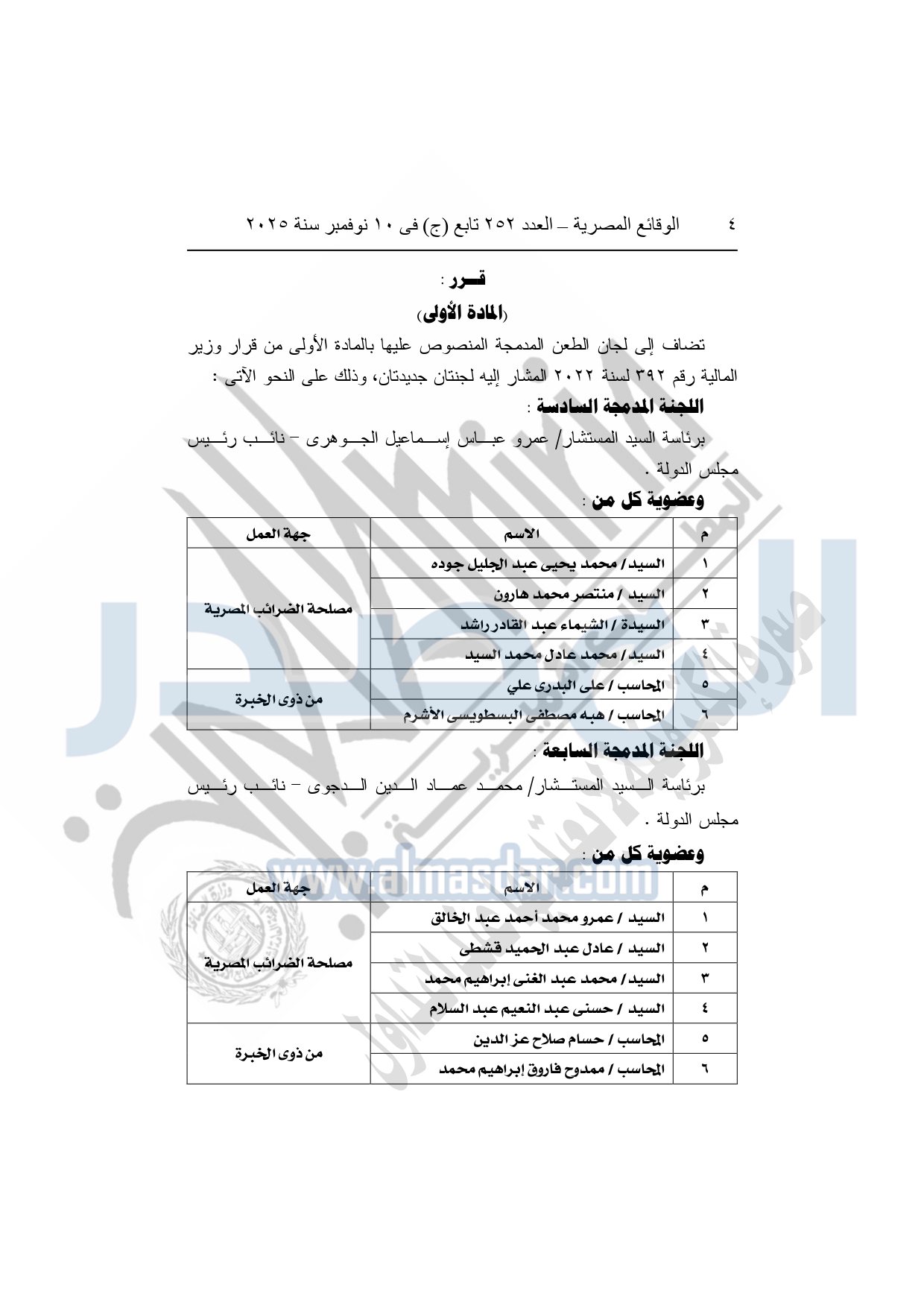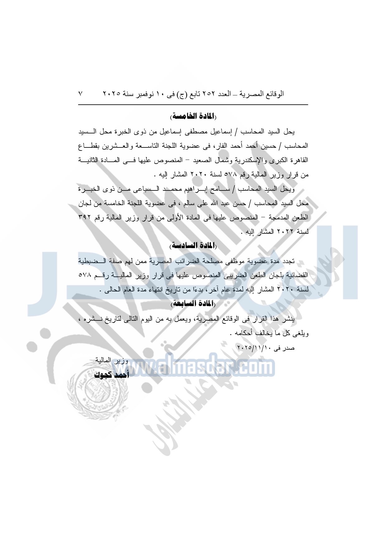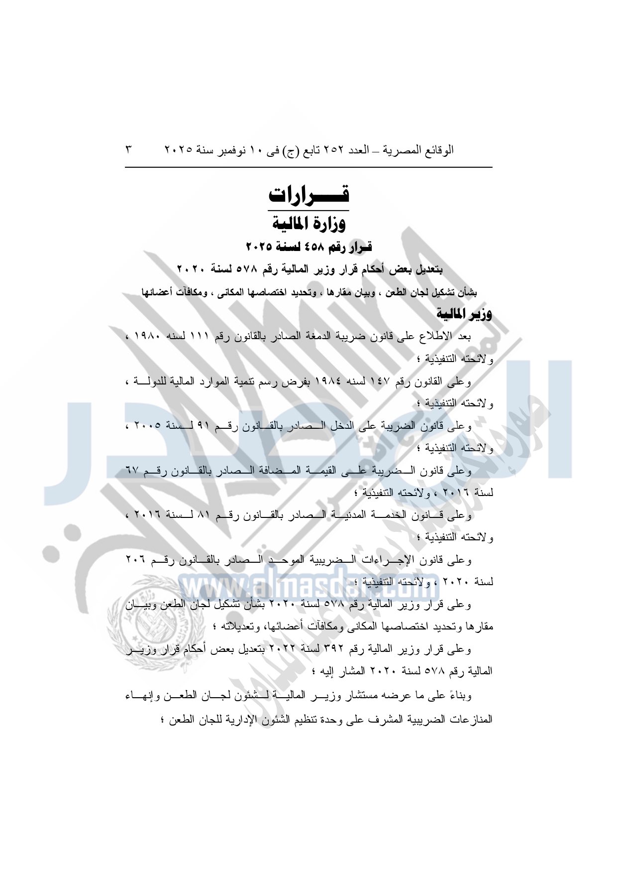 كما نشرت الوقائع المصرية في العدد 252 تابع "ج" الصادر في 10 نوفمبر سنة 2025، قرار وزارة المالية، رقم 458 لسنة 2025، بتعديل بعض أحكام قرار وزير المالية رقم 578 لسنة 2020، بشأن تشكيل لجان الطعن، وبيان مقارها، وتحديد اختصاصها المكاني، ومكافآت أعضائها.