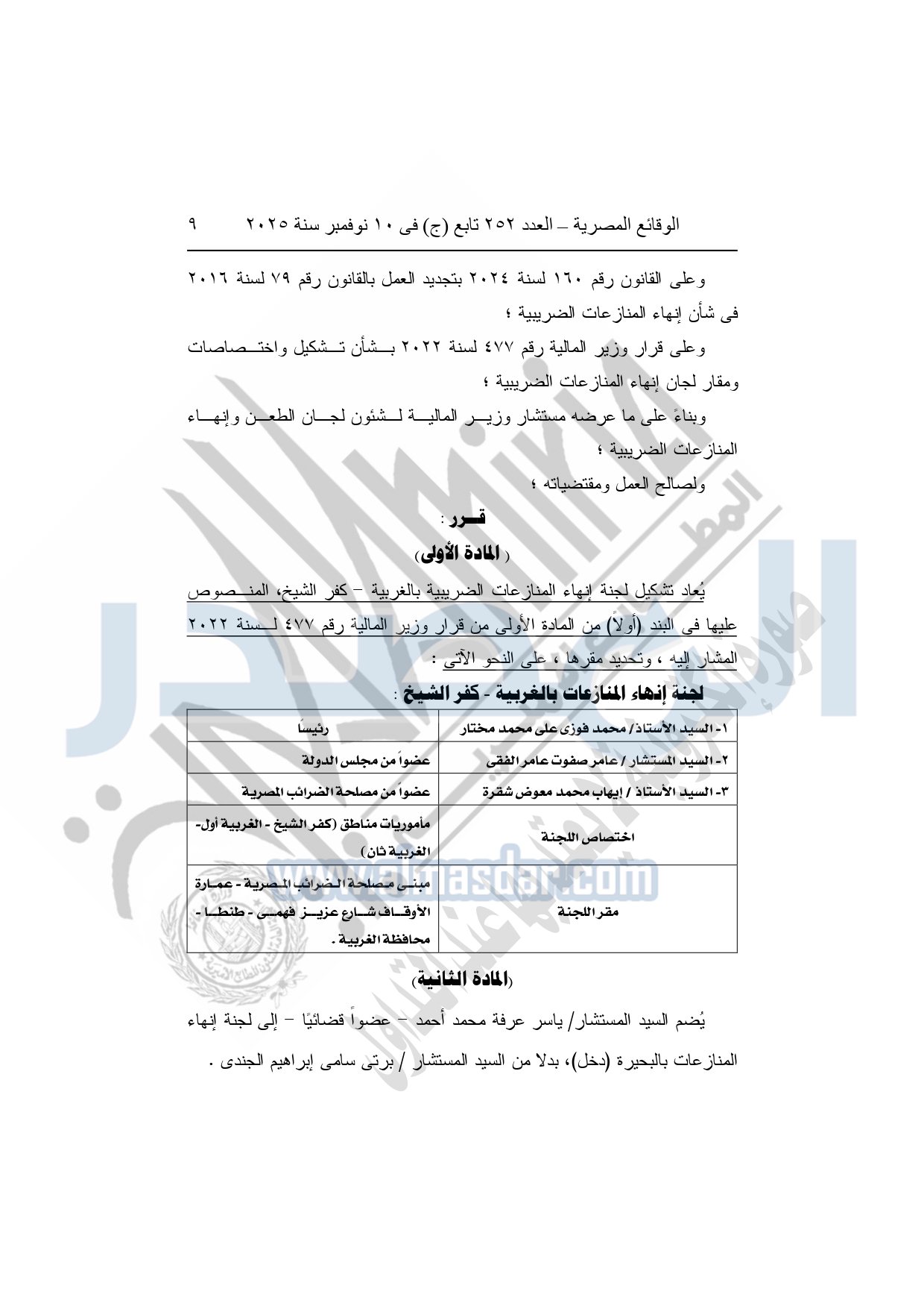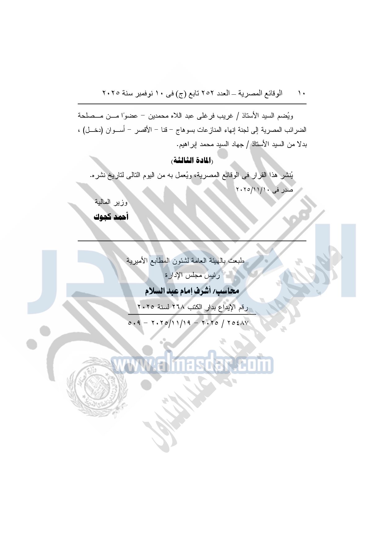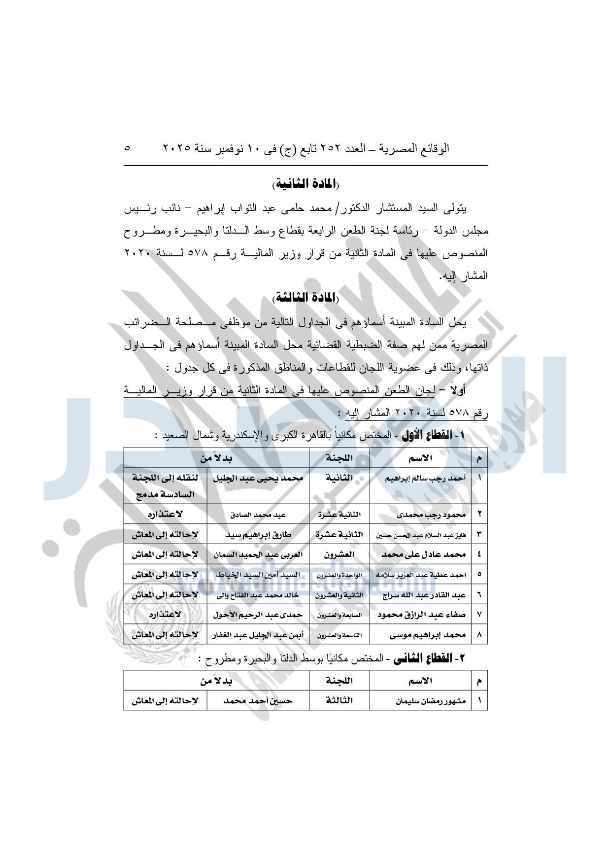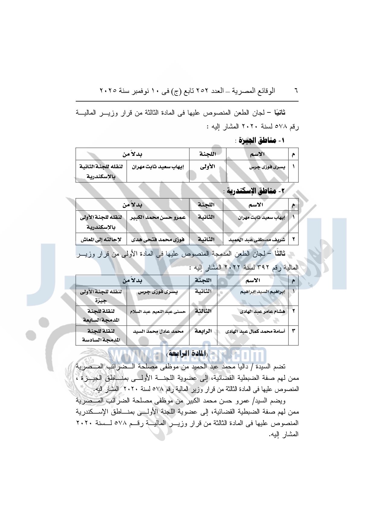 كما نشرت الوقائع المصرية في العدد 252 تابع "ج" الصادر في 10 نوفمبر سنة 2025، قرار وزارة المالية، رقم 458 لسنة 2025، بتعديل بعض أحكام قرار وزير المالية رقم 578 لسنة 2020، بشأن تشكيل لجان الطعن، وبيان مقارها، وتحديد اختصاصها المكاني، ومكافآت أعضائها.