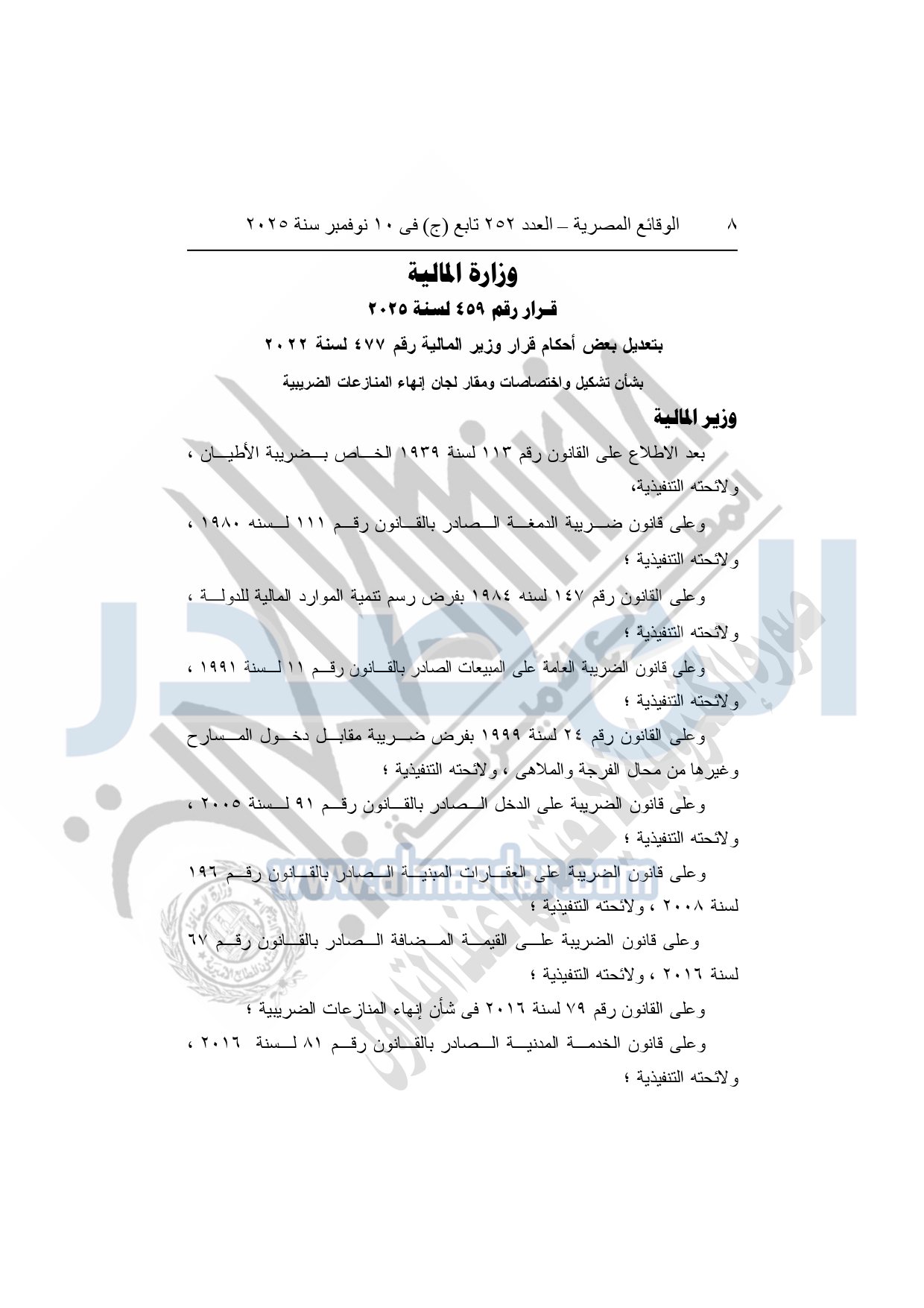 نشرت الوقائع المصرية في العدد 252 تابع "ج" الصادر في 10 نوفمبر سنة 2025، قرار وزارة المالية، رقم 459 لسنة 2025، بتعديل بعض أحكام قرار وزير المالية رقم 477 لسنة 2022، بشأن تشكيل واختصاصات ومقار لجان إنهاء المنازعات الضريبية.