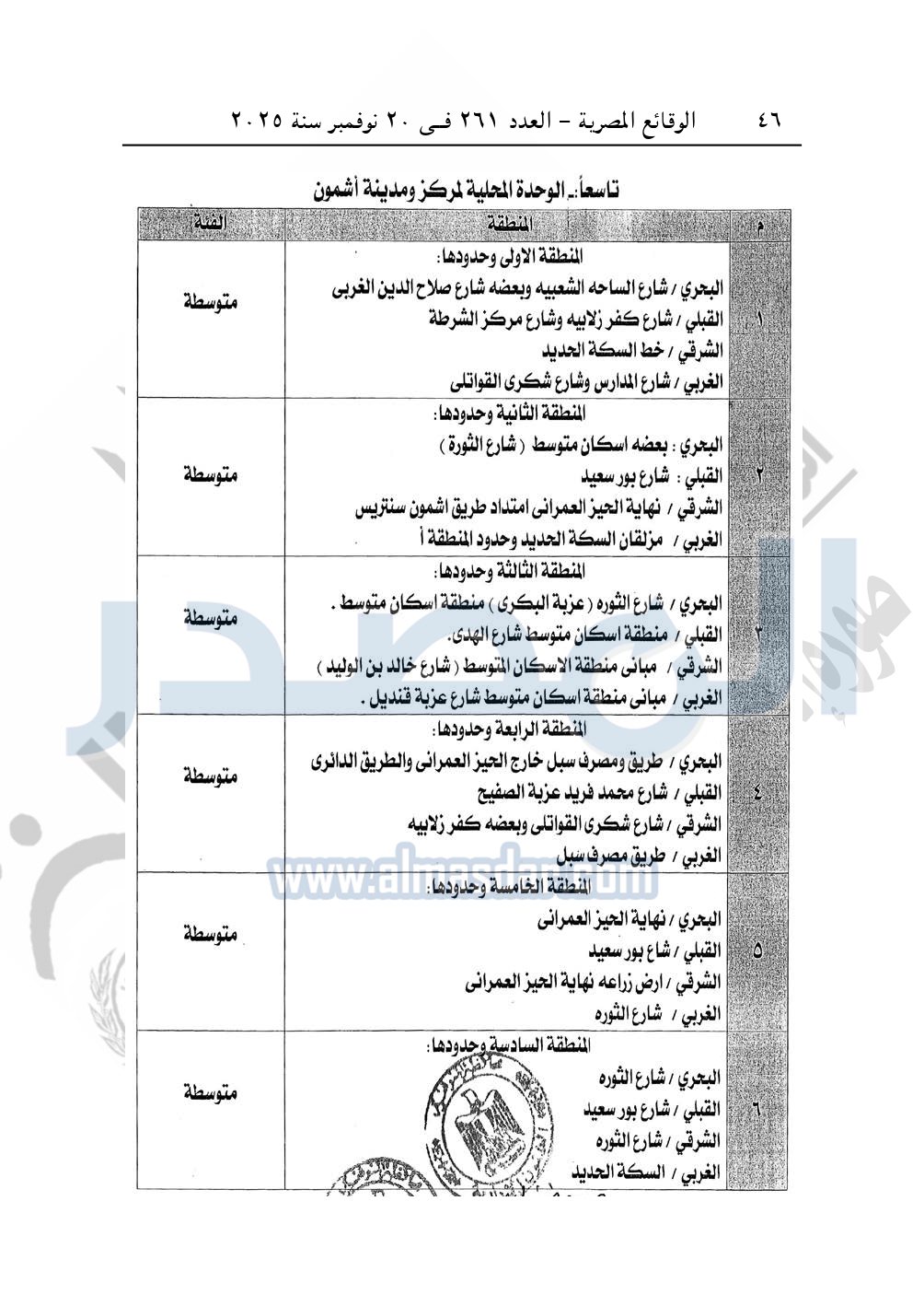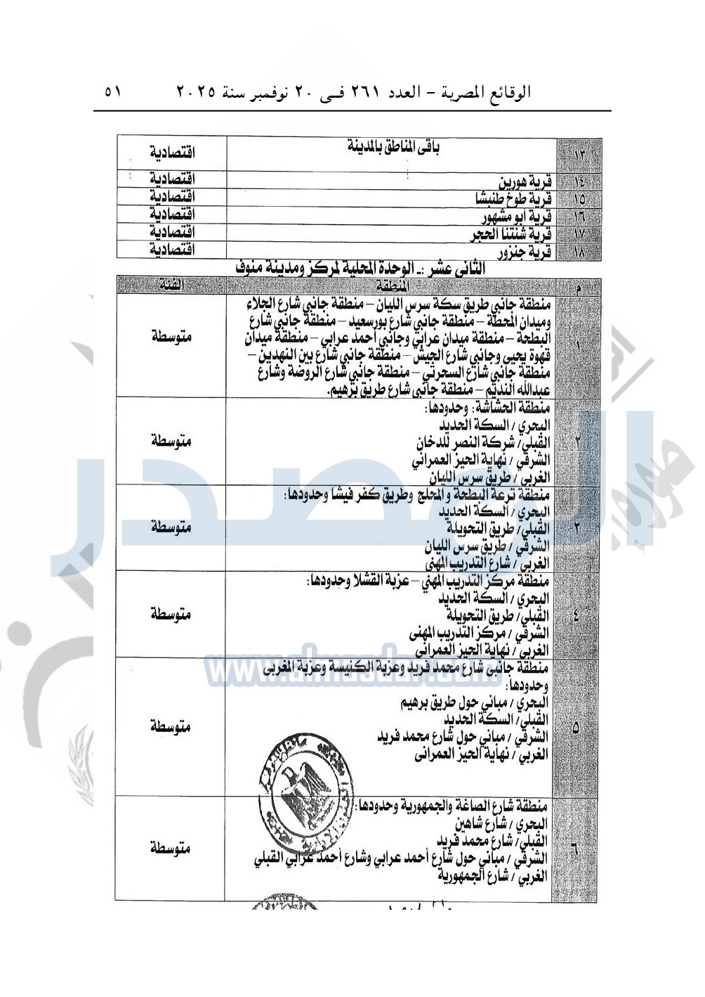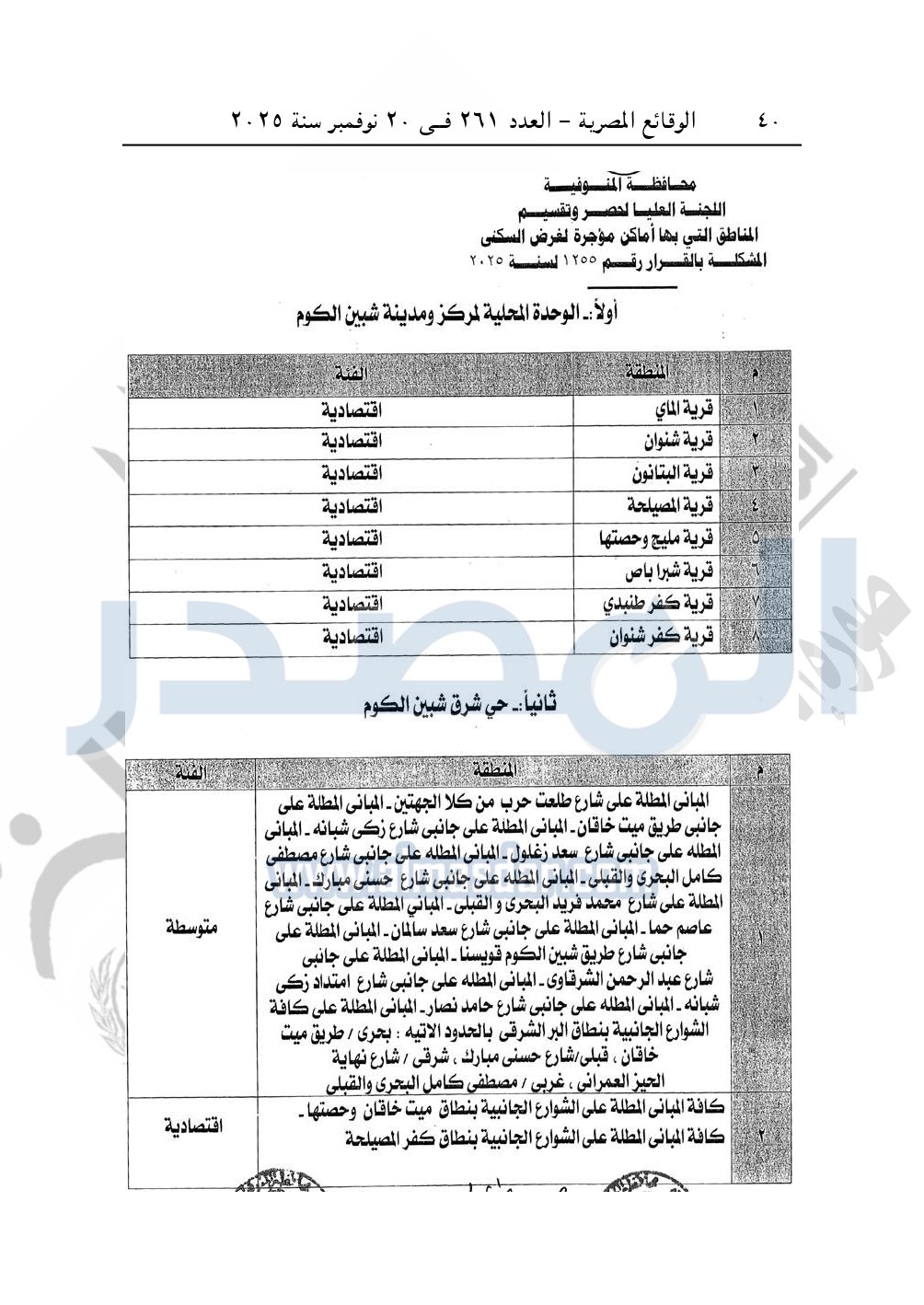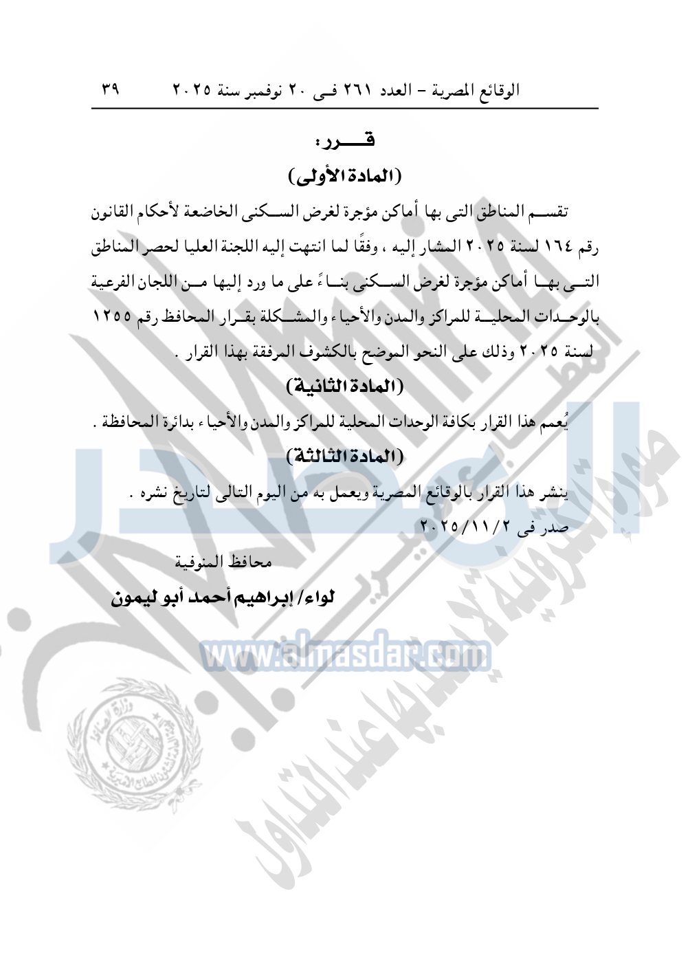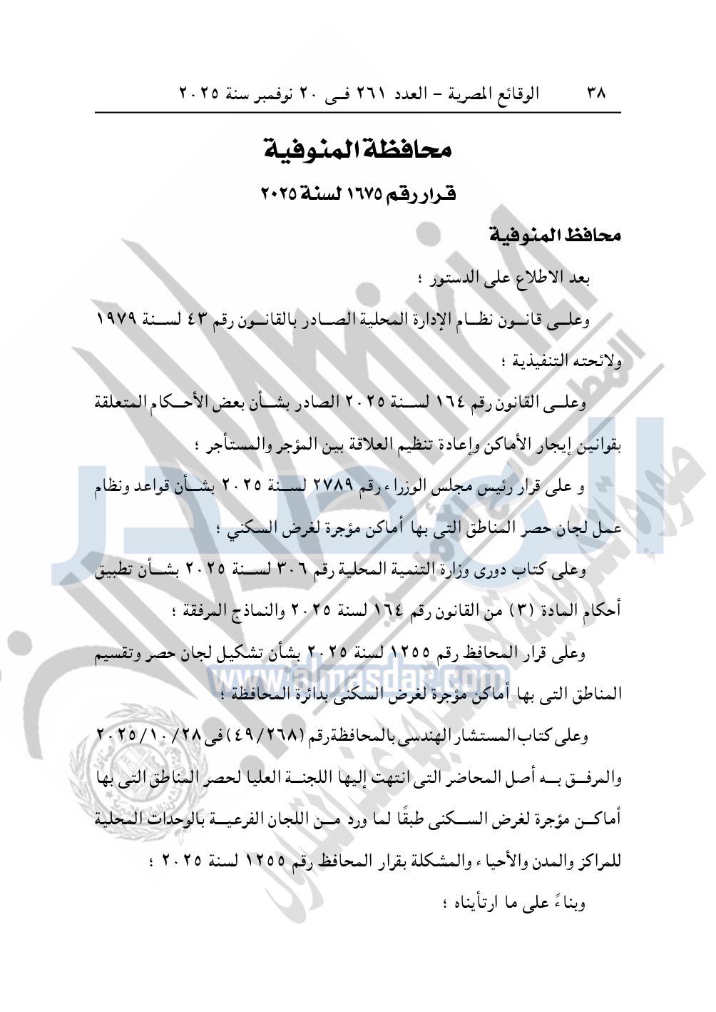 نشرت الوقائع المصرية في العدد 261، الصادر في 20 نوفمبر سنة 2025، محافظة المنوفية، قرار رقم 1675 لسنة 2025، بشأن تقسيم المناطق التي بها أماكن مؤجرة لغرض السكني بمحافظة المنوفية.