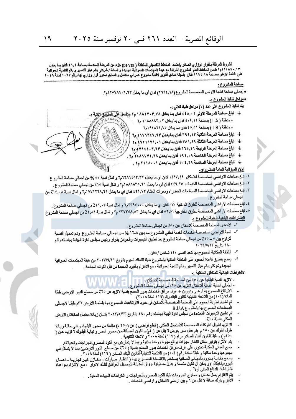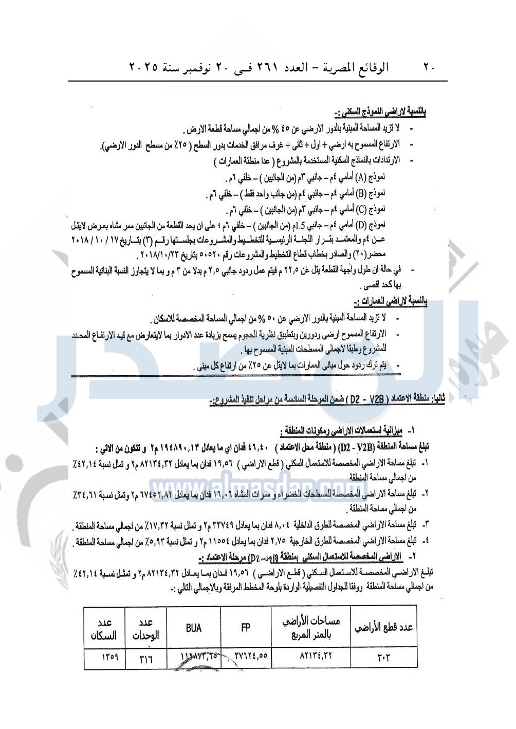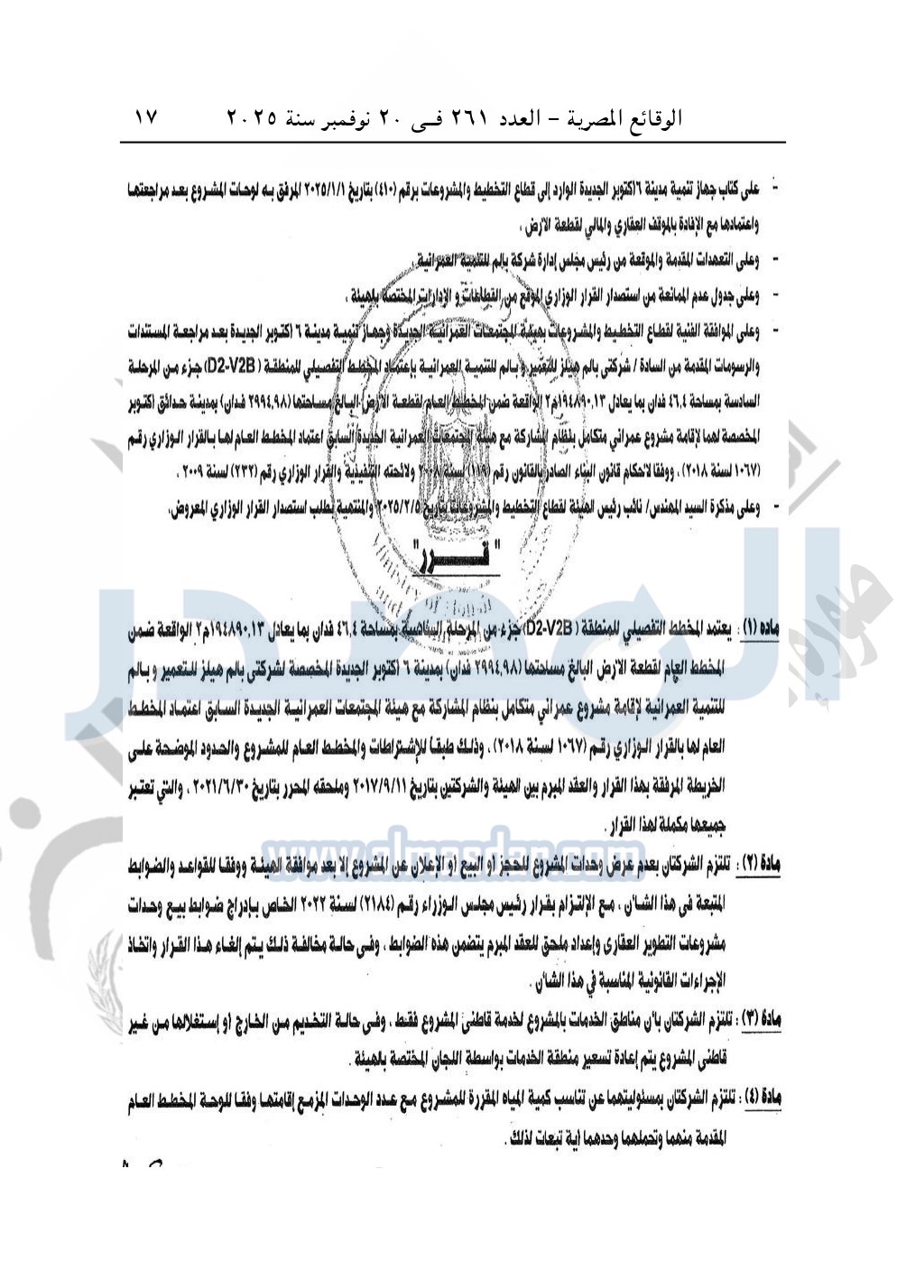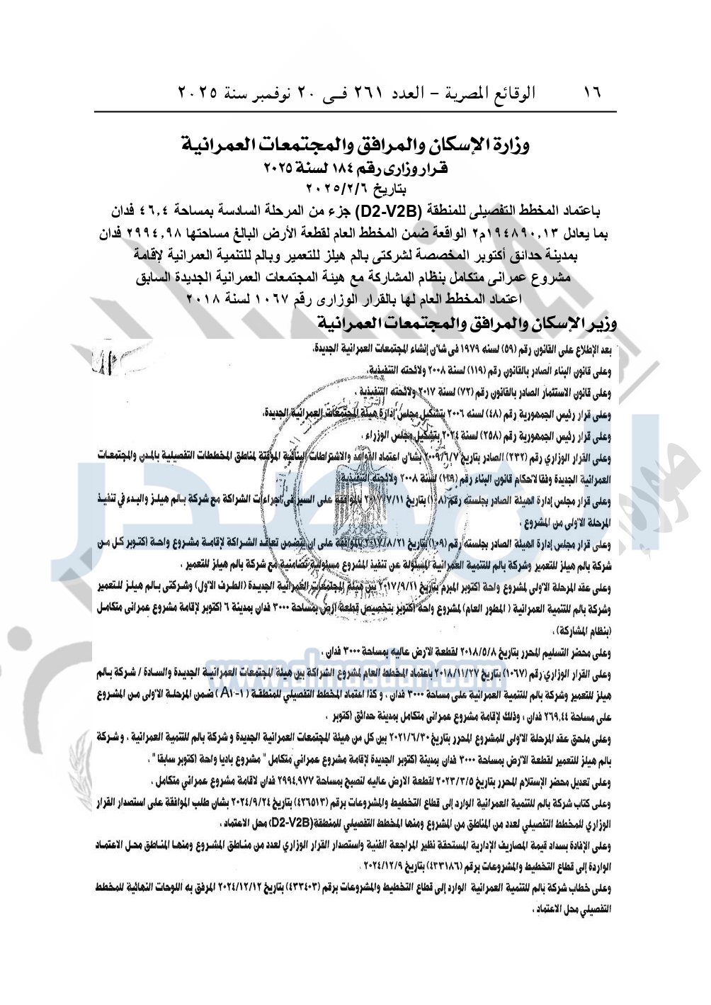 نشرت الوقائع المصرية في العدد 261، الصادر في 20 نوفمبر سنة 2025، وزارة الإسكان والمرافق والمجتمعات العمرانية، قرار رقم 184 لسنة 2025، بتاريخ 6-2-2025، بشأن اعتماد المخطط التفصيلي للمنطقة "D2 – V2B" جزء من المرحلة السادسة بمساحة 46.4 فدان الواقعة ضمن المخطط العام لقطعة الأرض البالغ مساحتها 2994.98 فدان بمدينة حدائق أكتوبر المخصصة لشركتى بالم هيلز للتعمير وبالم للتنمية العمرانية لإقامة مشروع عمراني متكامل بنظام المشاركة مع هيئة المجتمعات العمرانية الجديدة.