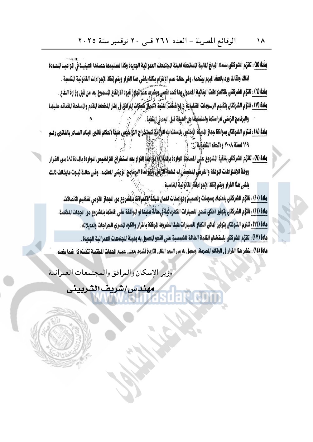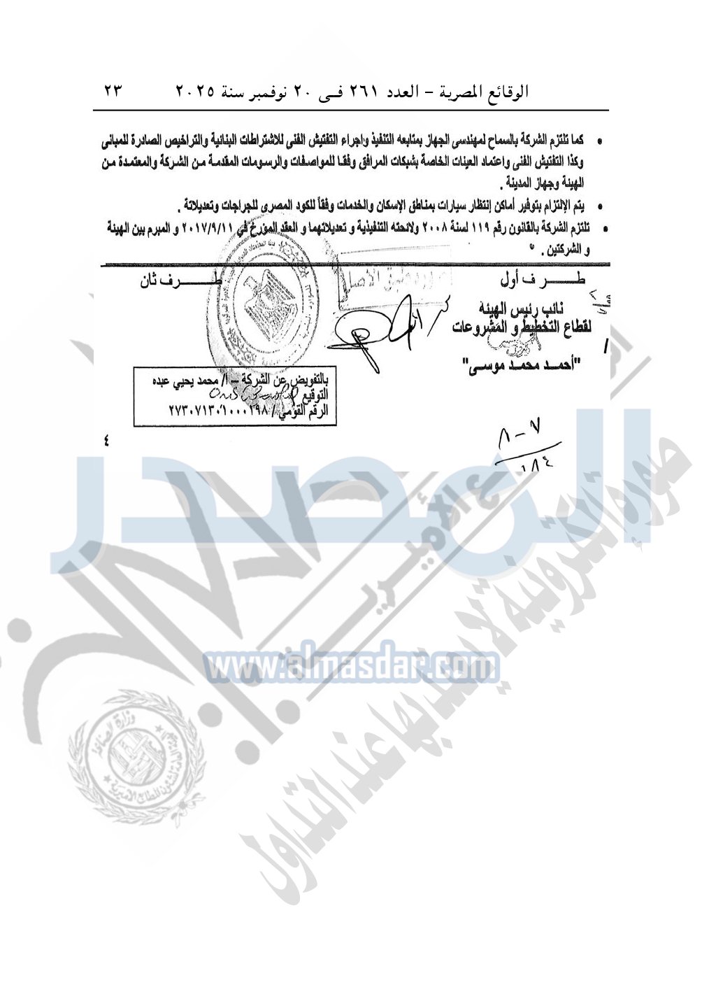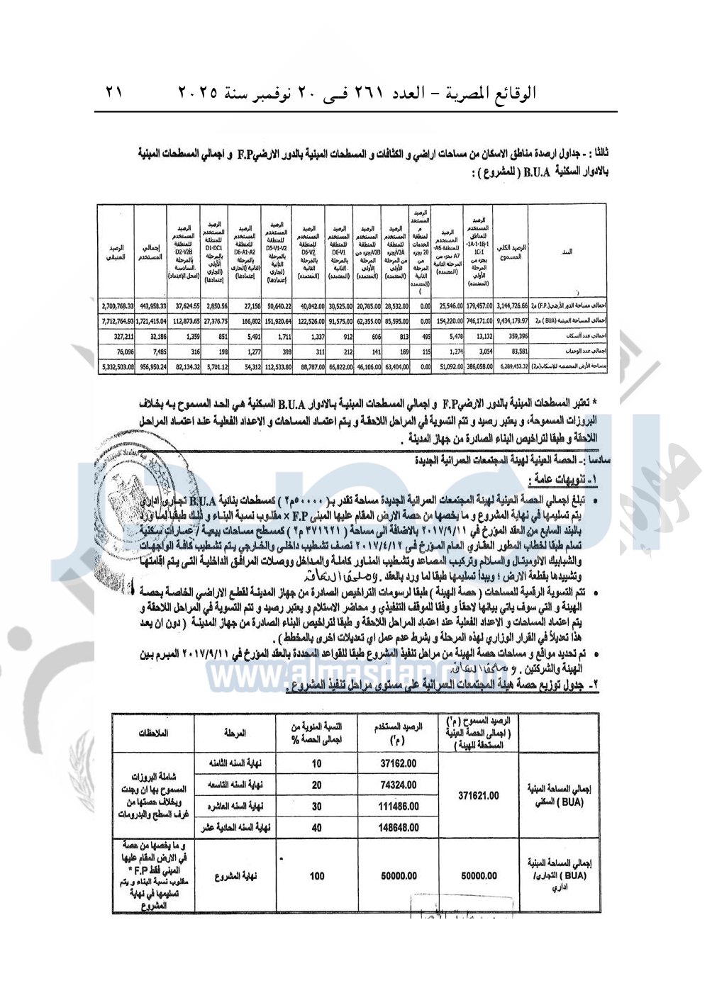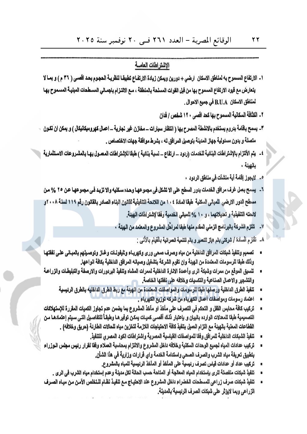 نشرت الوقائع المصرية في العدد 261، الصادر في 20 نوفمبر سنة 2025، وزارة الإسكان والمرافق والمجتمعات العمرانية، قرار رقم 184 لسنة 2025، بتاريخ 6-2-2025، بشأن اعتماد المخطط التفصيلي للمنطقة "D2 – V2B" جزء من المرحلة السادسة بمساحة 46.4 فدان الواقعة ضمن المخطط العام لقطعة الأرض البالغ مساحتها 2994.98 فدان بمدينة حدائق أكتوبر المخصصة لشركتى بالم هيلز للتعمير وبالم للتنمية العمرانية لإقامة مشروع عمراني متكامل بنظام المشاركة مع هيئة المجتمعات العمرانية الجديدة.