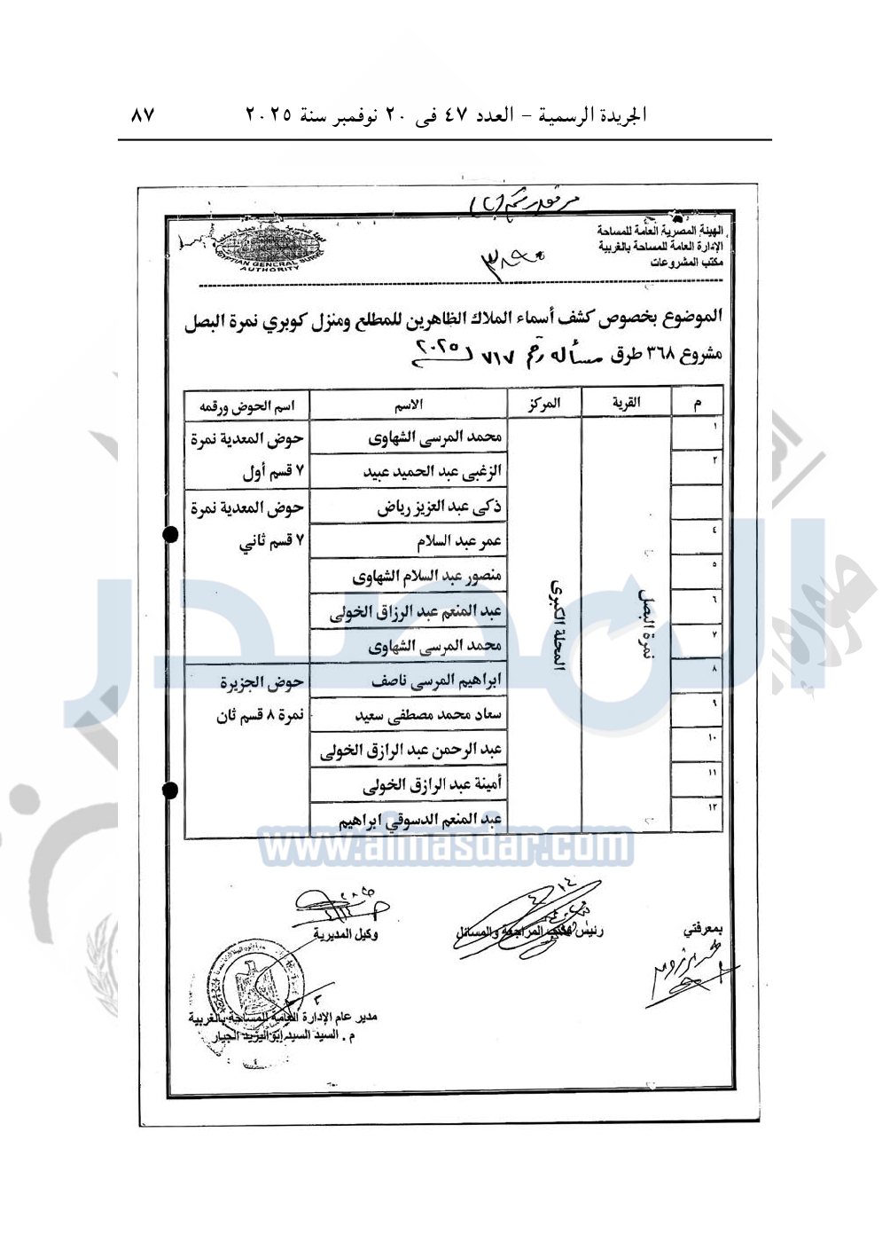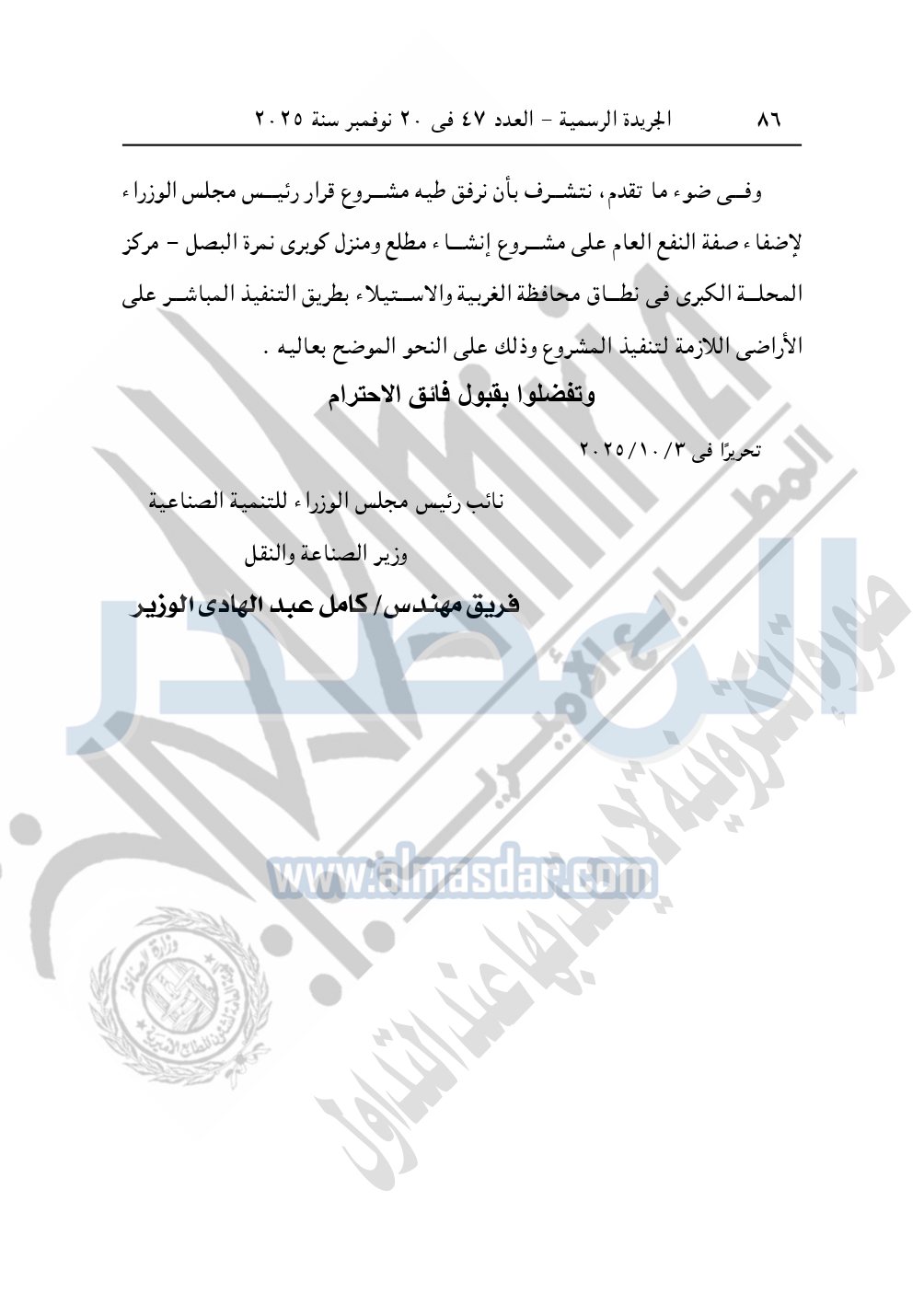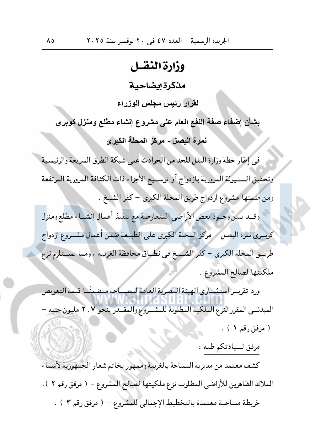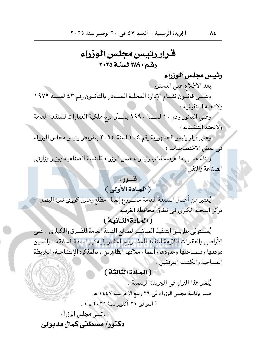 يُعتبر من أعمال المنفعة العامة مشروع إنشاء مطلع ومنزل كوبرى نمرة البصل – مركز المحلة الكبرى في نطاق محافظة الغربية.