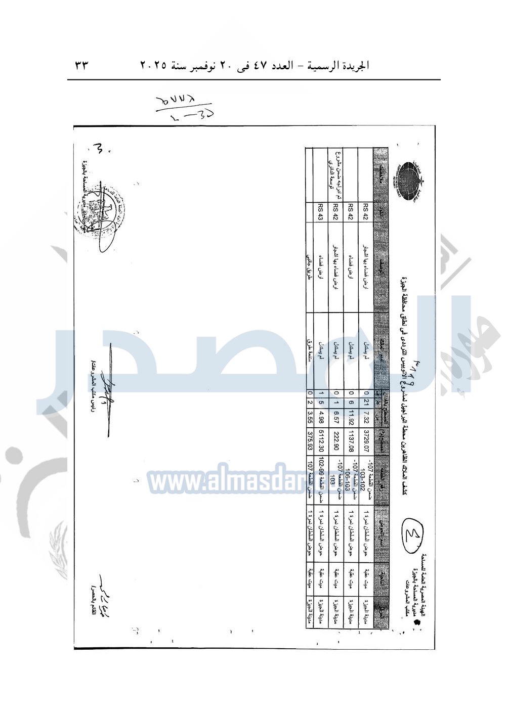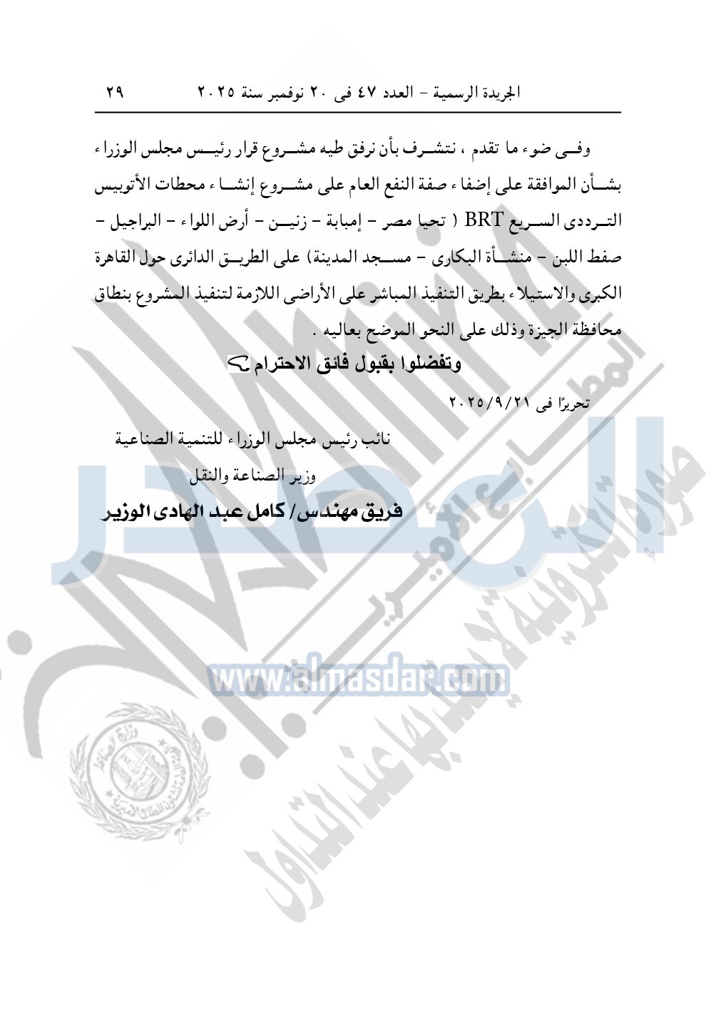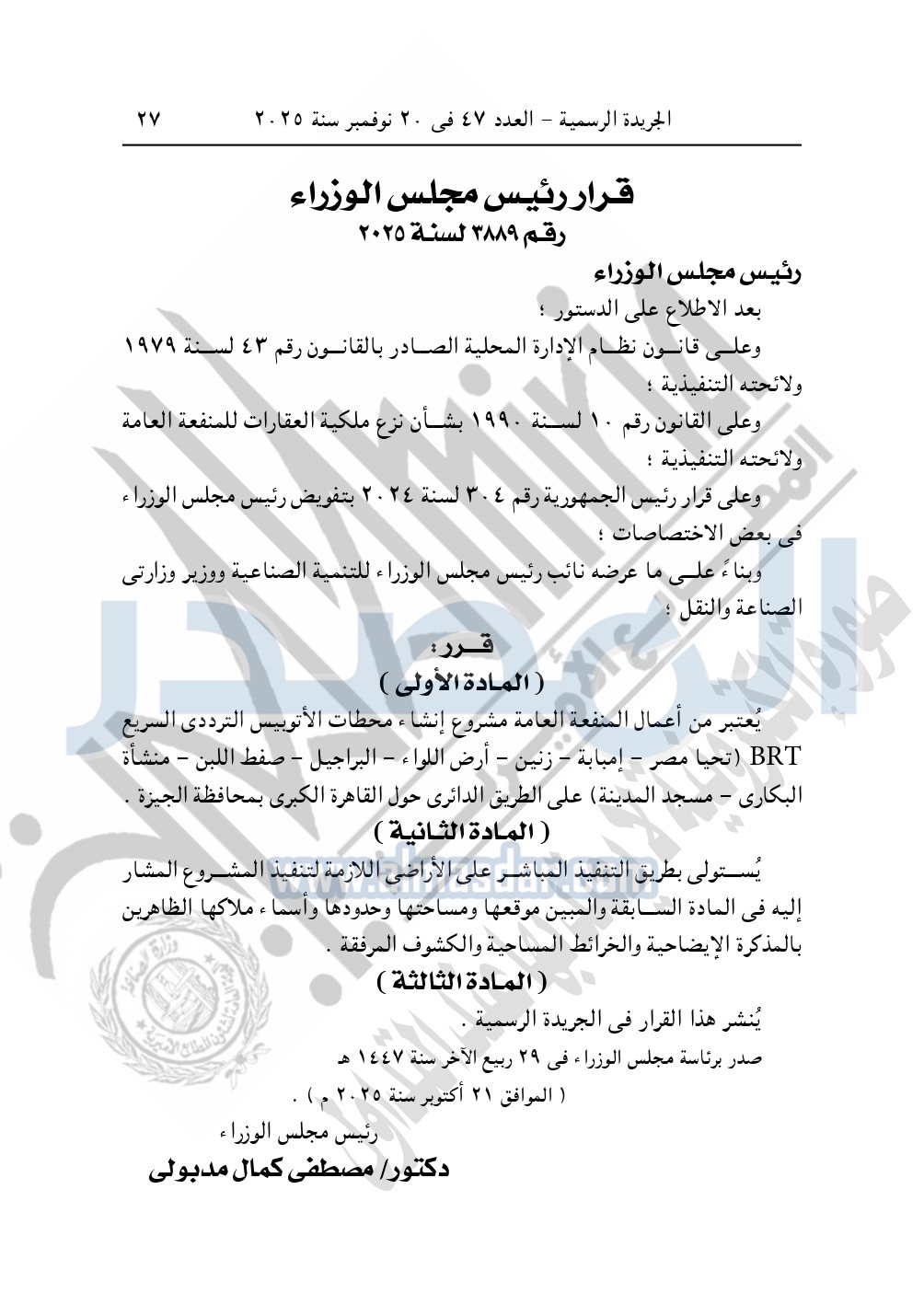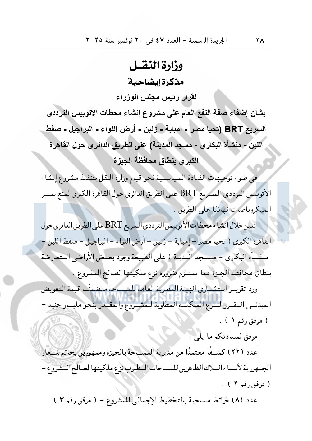 نشرت الجريدة الرسمية في العدد 47، بتاريخ 20 نوفمبر 2025، قرار رئيس مجلس الوزراء، رقم 3889 لسنة 2025، بشأن نزع ملكية قطع أراضي لإنشاء محطات الأتوبيس الترددي السريع على الطريق الدائري بمحافظة الجيزة.