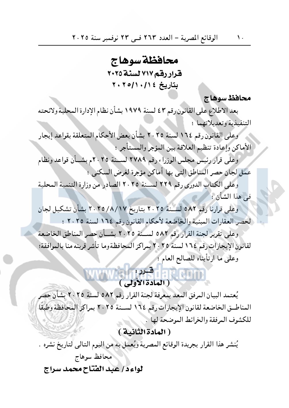 نشرت الوقائع المصرية، في العدد 263 في 23 نوفمبر سنة 2025، قرار محافظة سوهاج، رقم 717 لسنة 2025، بتاريخ 14-10-2025، بشأن لجان حصر «الإيجار القديم» تعلن الأماكن المؤجرة لغرض السكنى بمحافظة سوهاج.