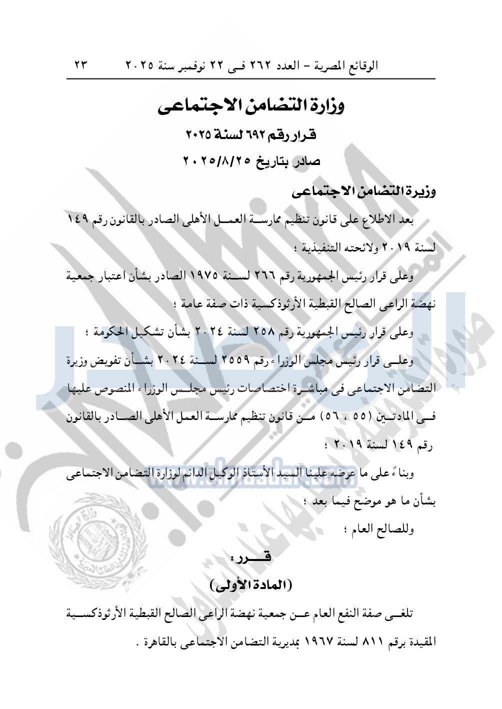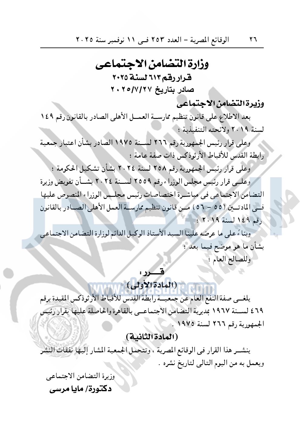 كما نشرت الوقائع المصرية في العدد 253 الصادر في 11 نوفمبر سنة 2025، قرار وزارة التضامن الاجتماعي، رقم 613 لسنة 2025، بتاريخ 27-7-2025، بشأن إلغاء صفة النفع العام على لجمعية رابطة القدس للأقباط الأرثوذكس في القاهرة.