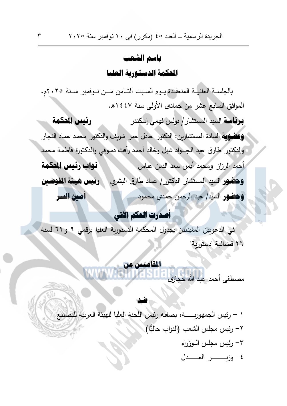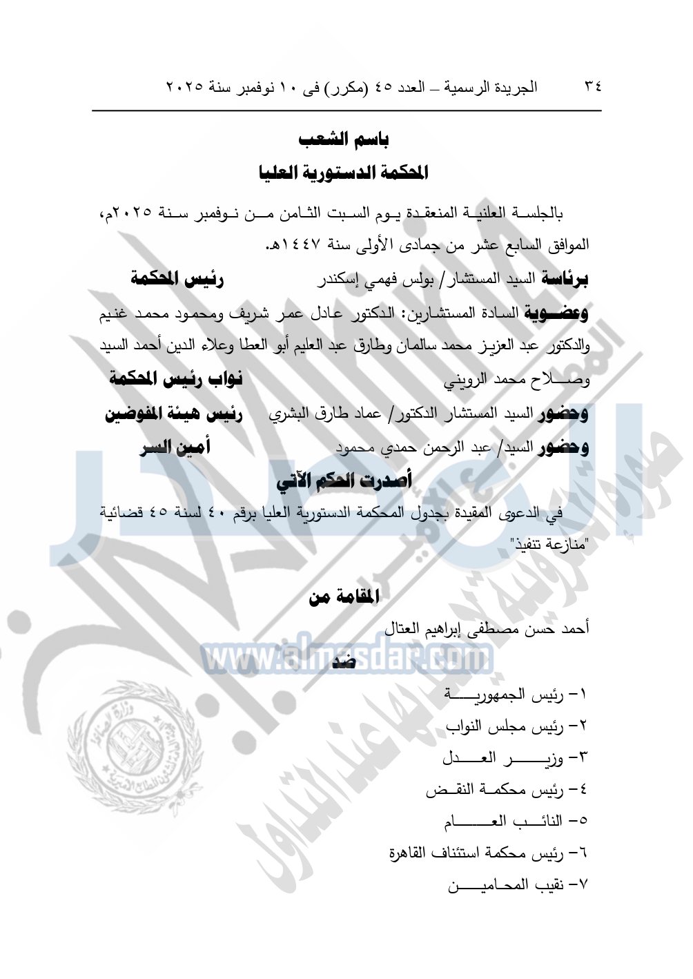 وأصدرت المحكمة الدستورية العليا حكمها في الدعوى المقامة من أحمد حسن مصطفى إبراهيم العتال ضد كل من: