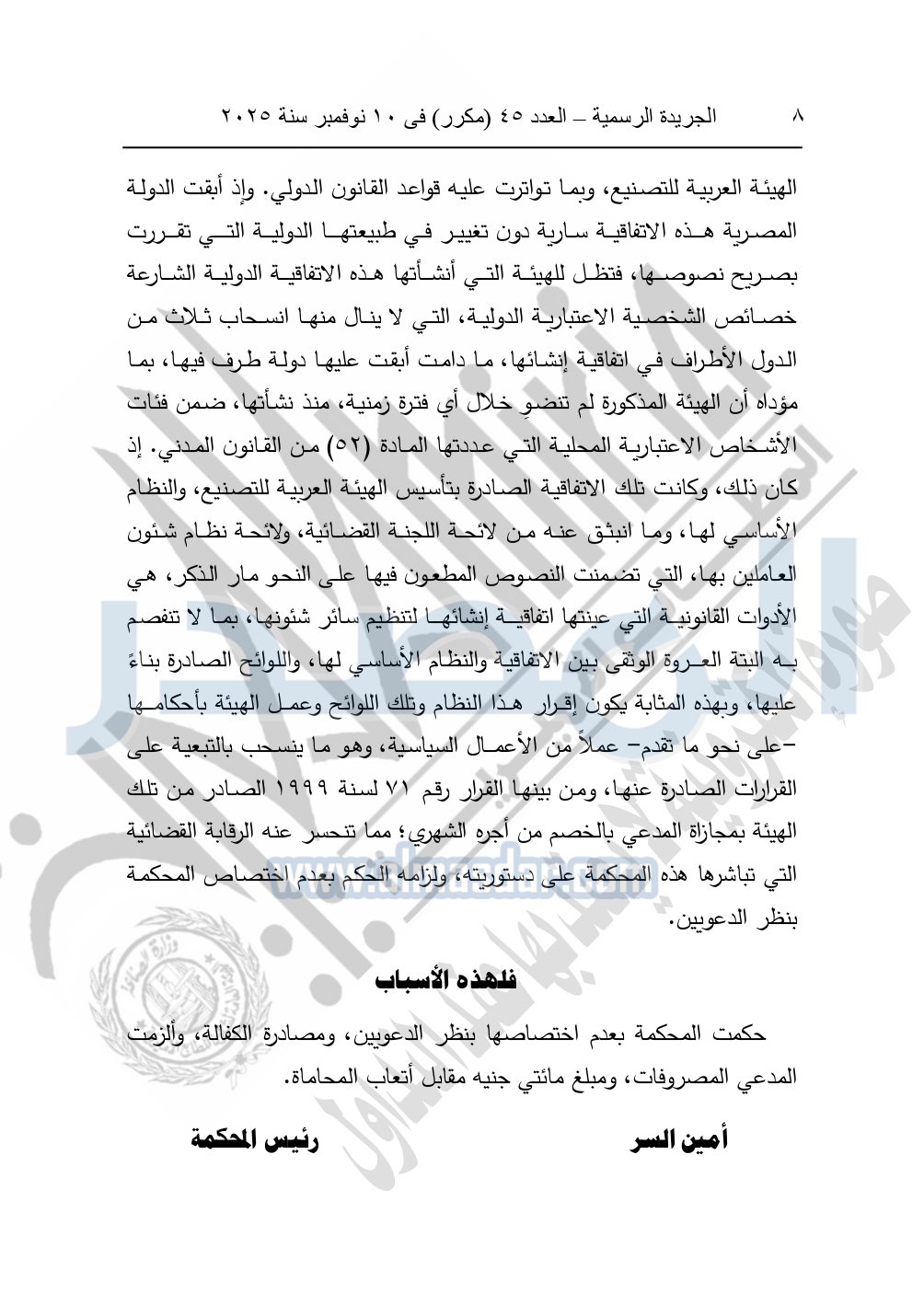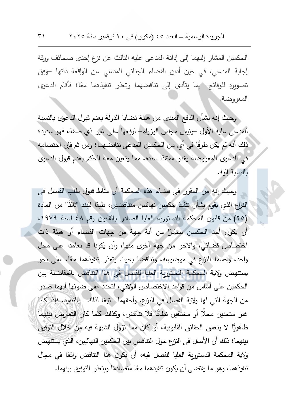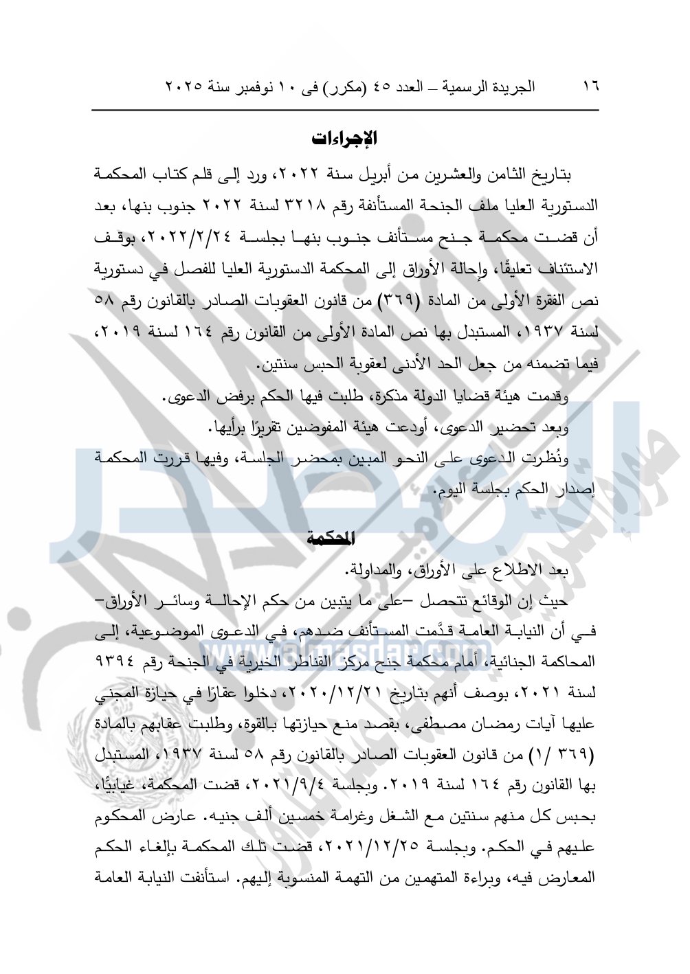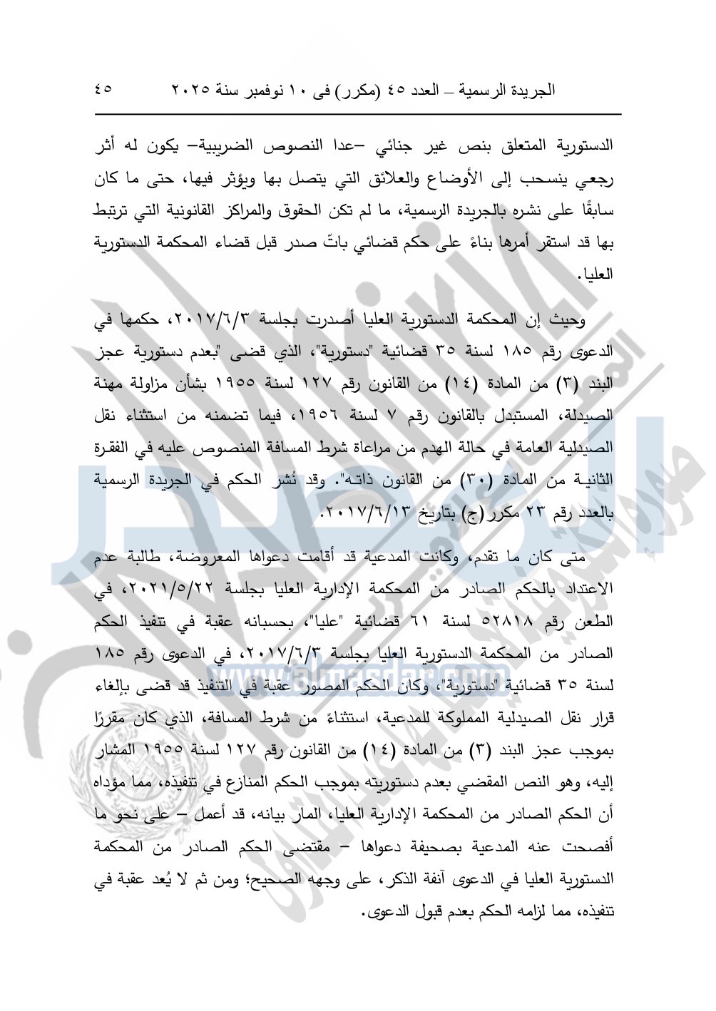 وأيضا نشرت الجريدة الرسمية في العدد 45 "مكرر"، في 10 نوفمبر سنة 2025، الأحكام الصادرة من المحكمة الدستورية العليا في عدد من الدعاوي القضائية بجلسة 8 نوفمبر 2025.