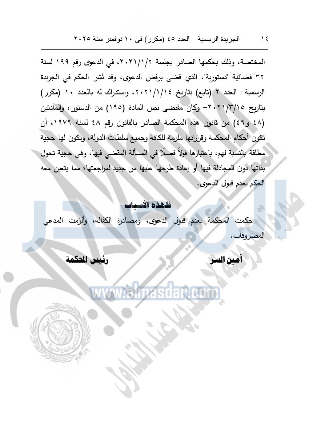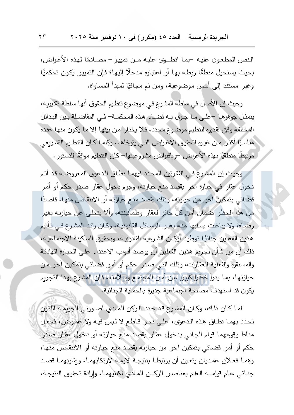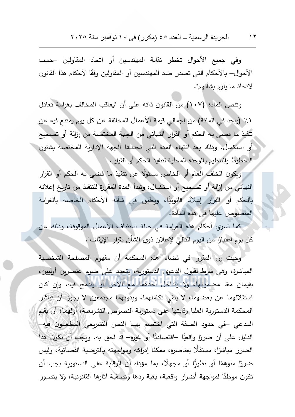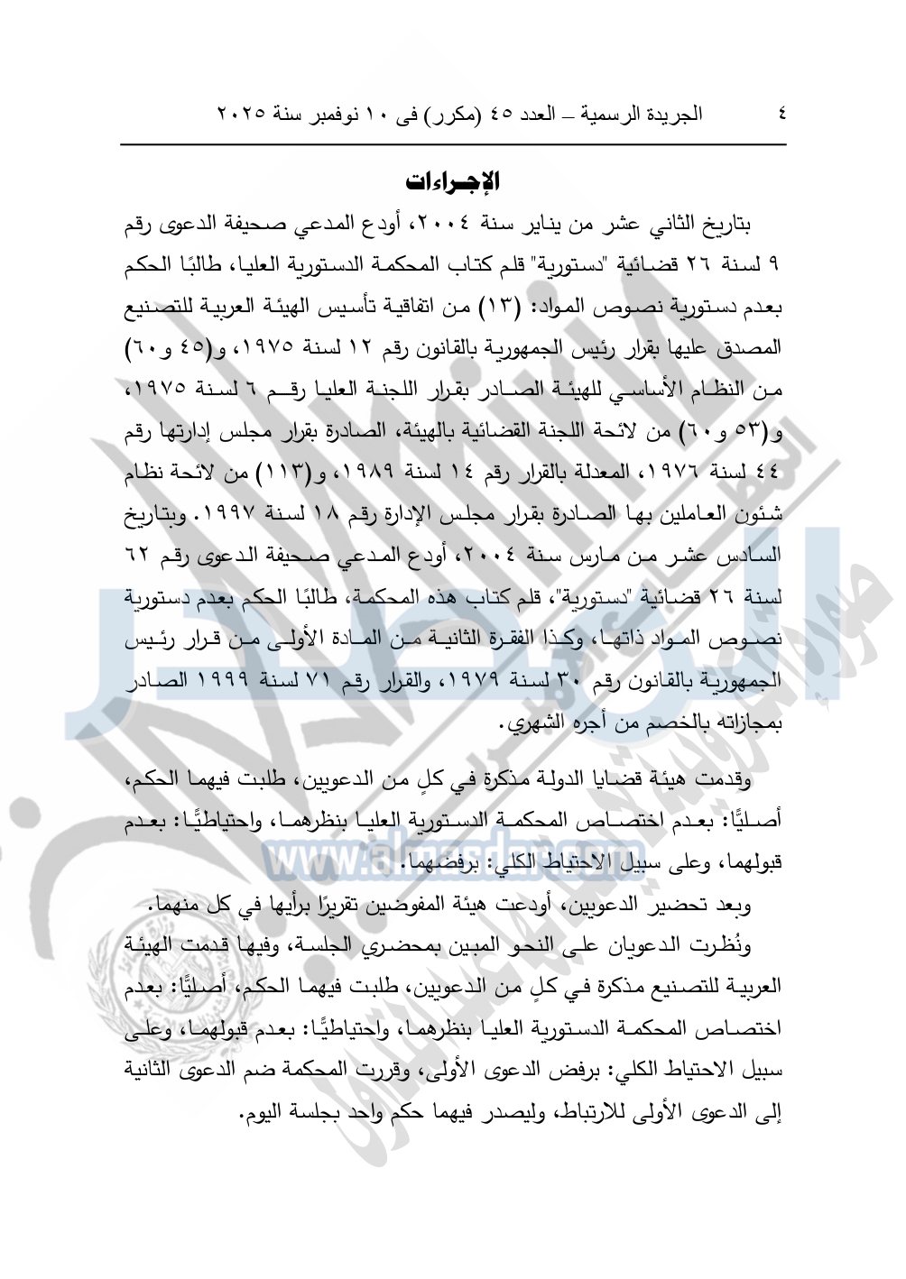 وأيضا نشرت الجريدة الرسمية في العدد 45 "مكرر"، في 10 نوفمبر سنة 2025، الأحكام الصادرة من المحكمة الدستورية العليا في عدد من الدعاوي القضائية بجلسة 8 نوفمبر 2025.