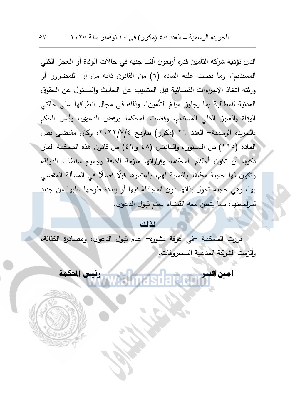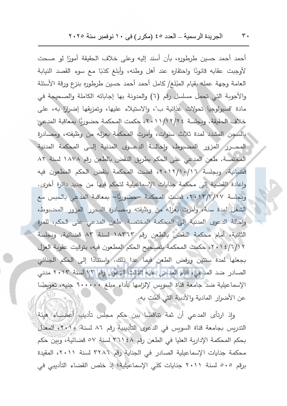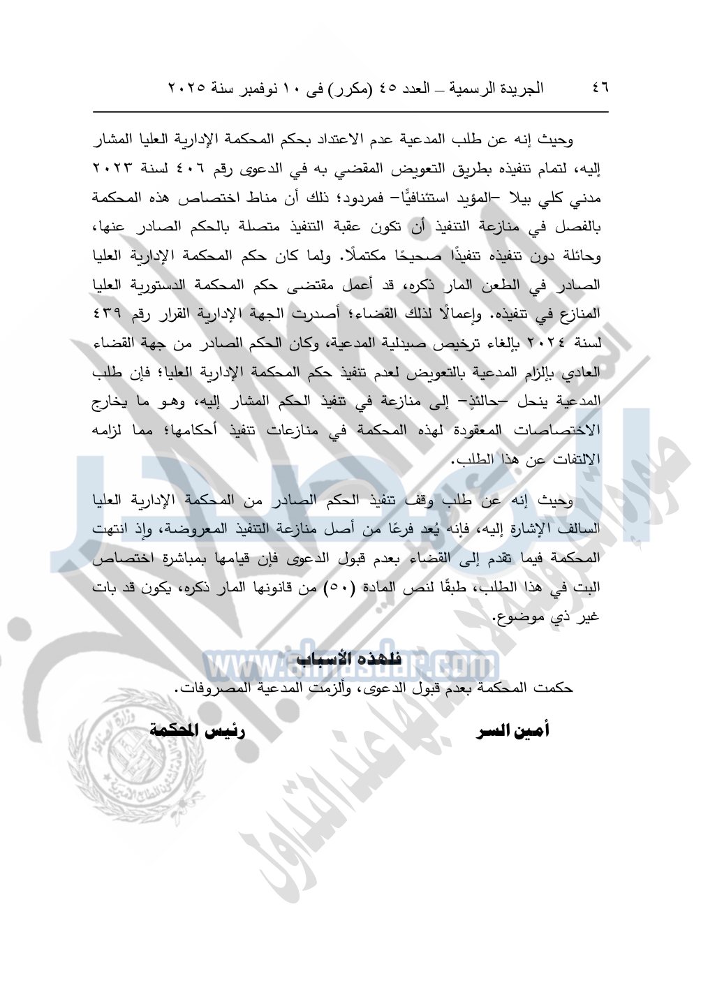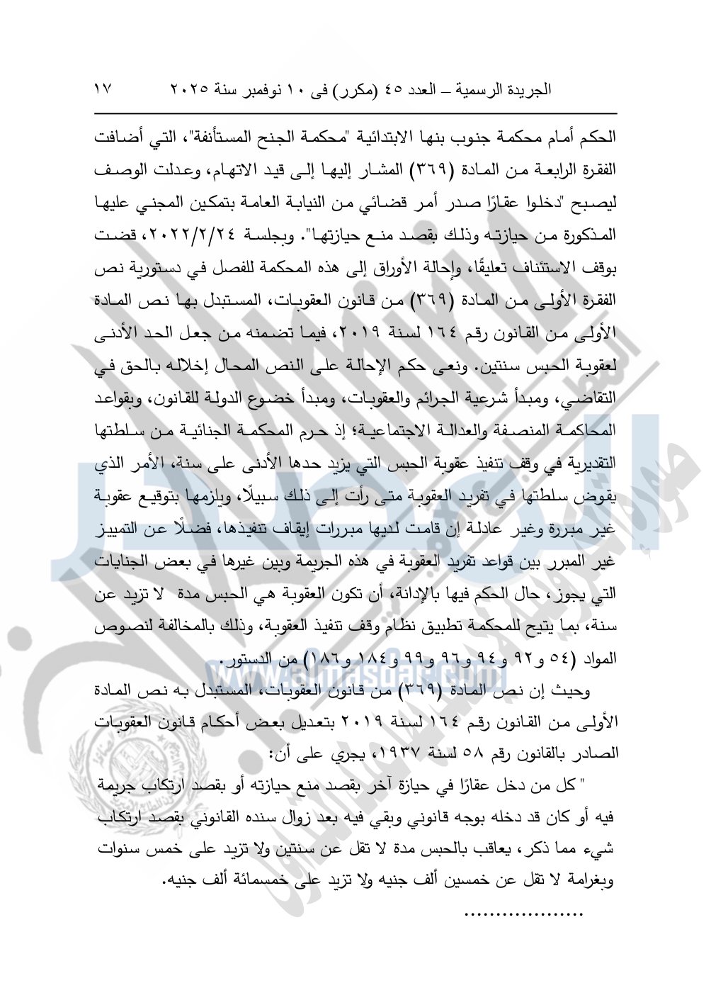 وأيضا نشرت الجريدة الرسمية في العدد 45 "مكرر"، في 10 نوفمبر سنة 2025، الأحكام الصادرة من المحكمة الدستورية العليا في عدد من الدعاوي القضائية بجلسة 8 نوفمبر 2025.