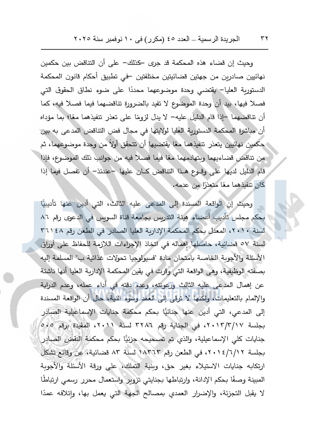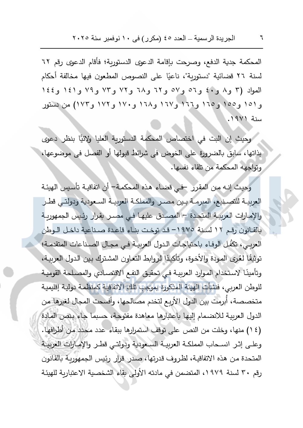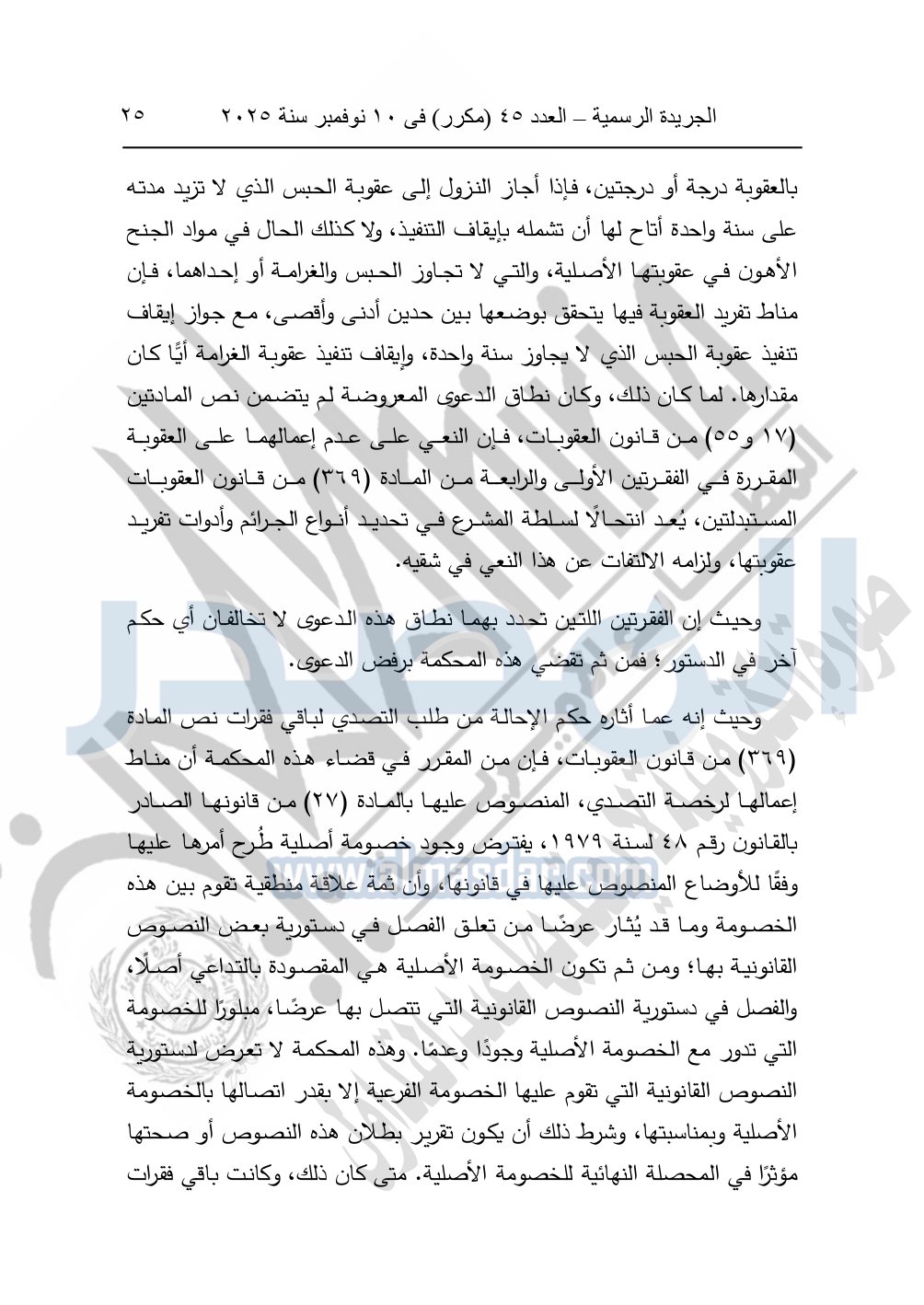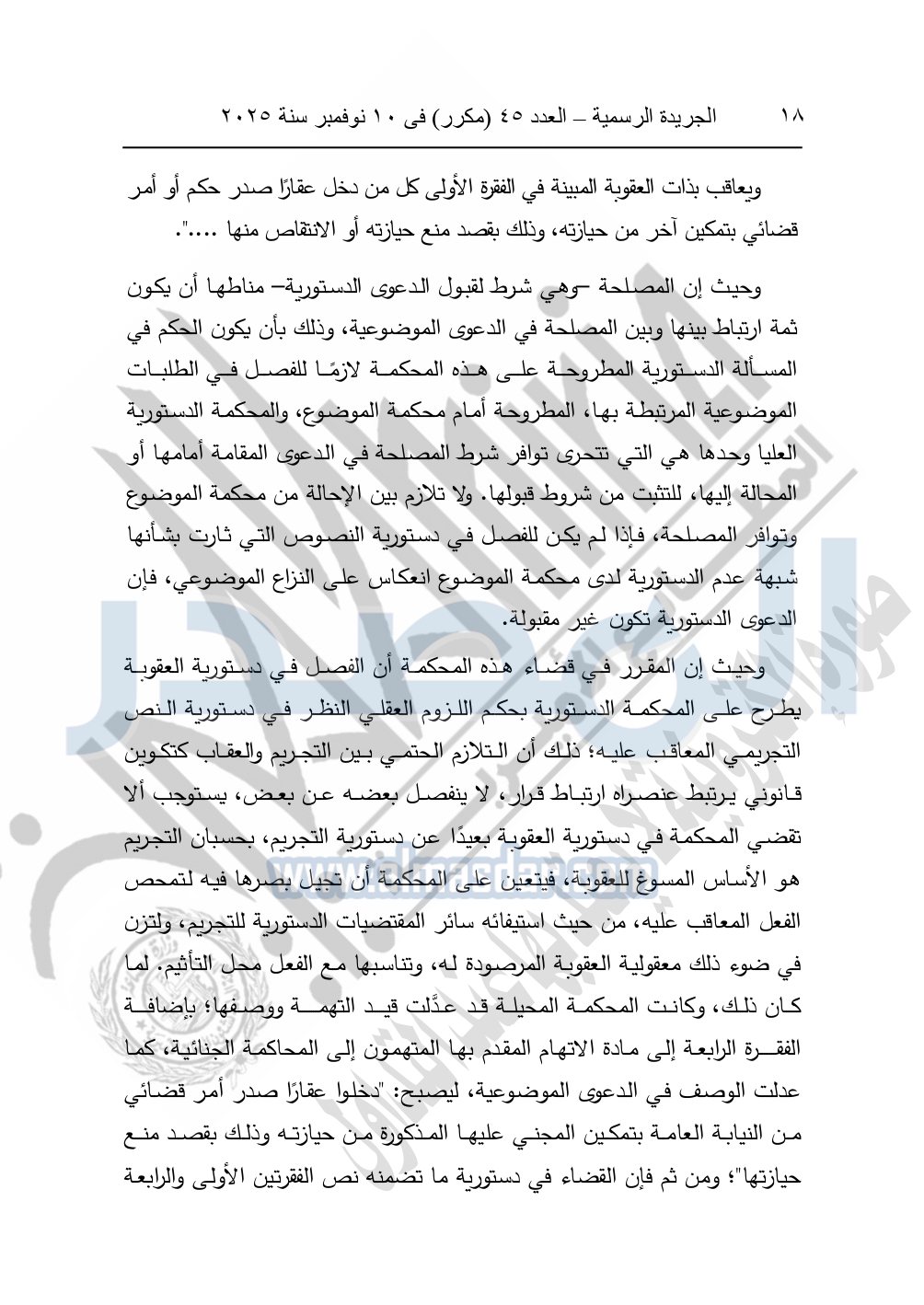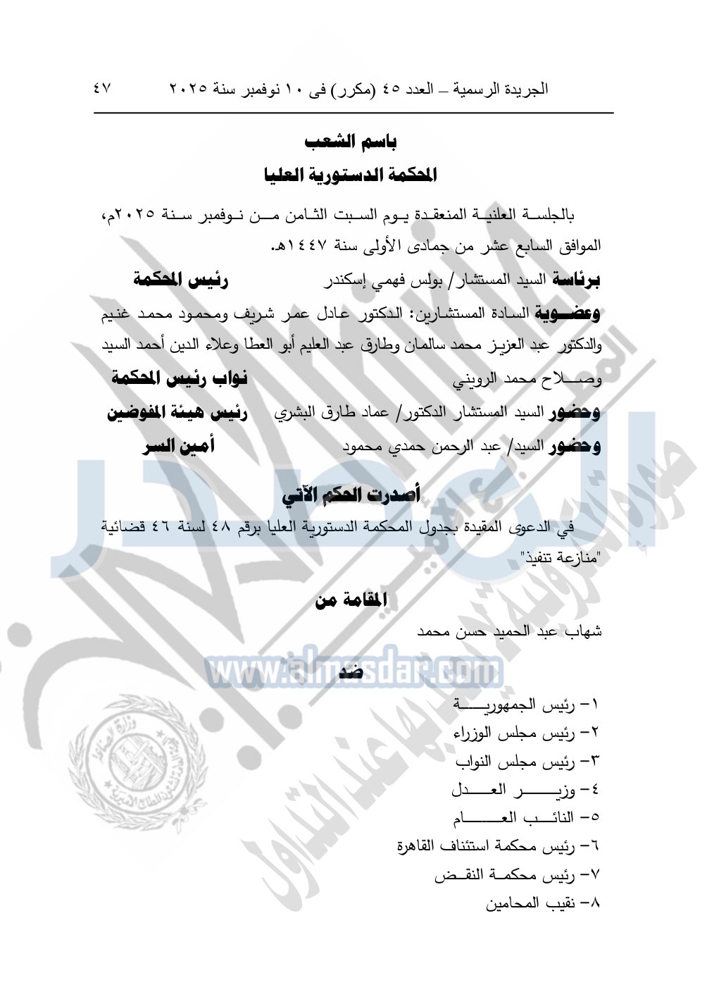 ونشرت الجريدة الرسمية في العدد 45 "مكرر"، في 10 نوفمبر سنة 2025، الأحكام الصادرة من المحكمة الدستورية العليا في عدد من الدعاوي القضائية بجلسة 8 نوفمبر 2025.