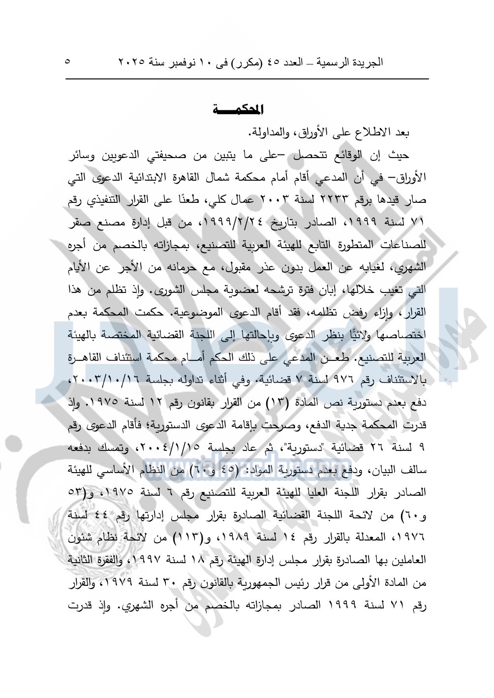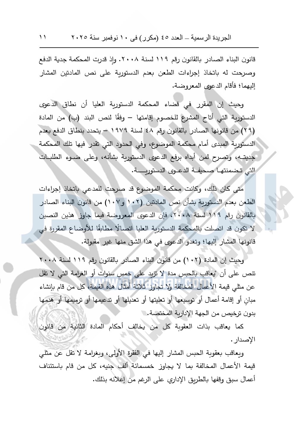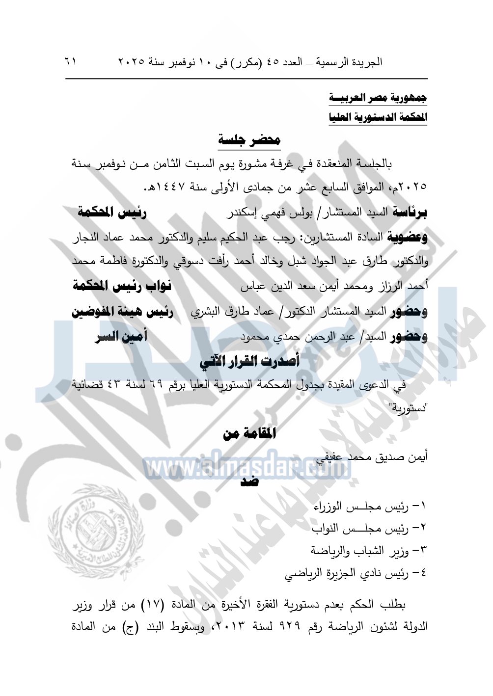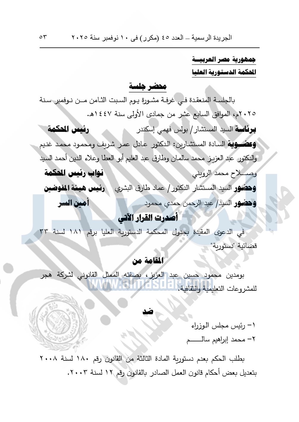 ونشرت الجريدة الرسمية في العدد 45 "مكرر"، في 10 نوفمبر سنة 2025، الأحكام الصادرة من المحكمة الدستورية العليا في عدد من الدعاوي القضائية بجلسة 8 نوفمبر 2025.