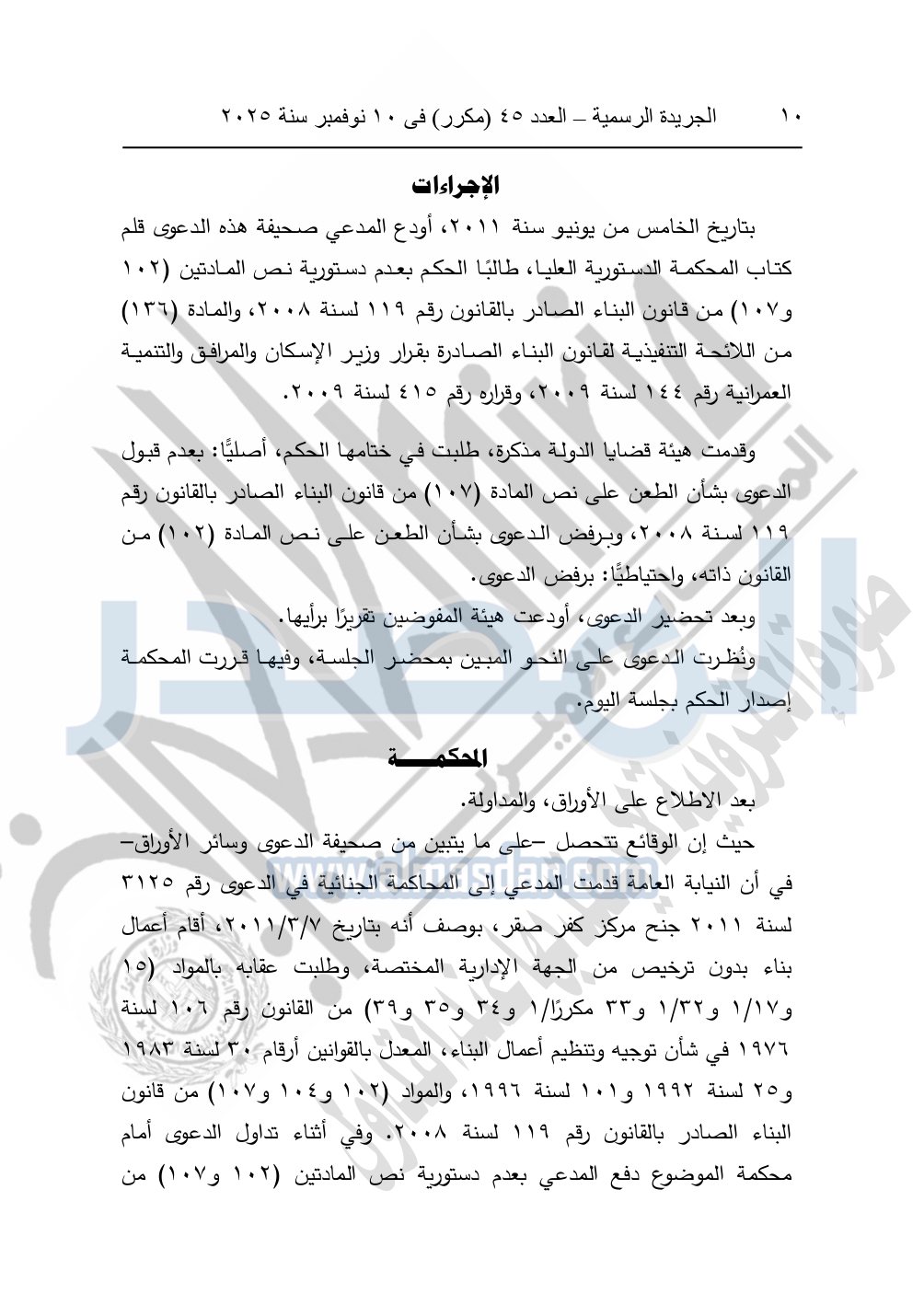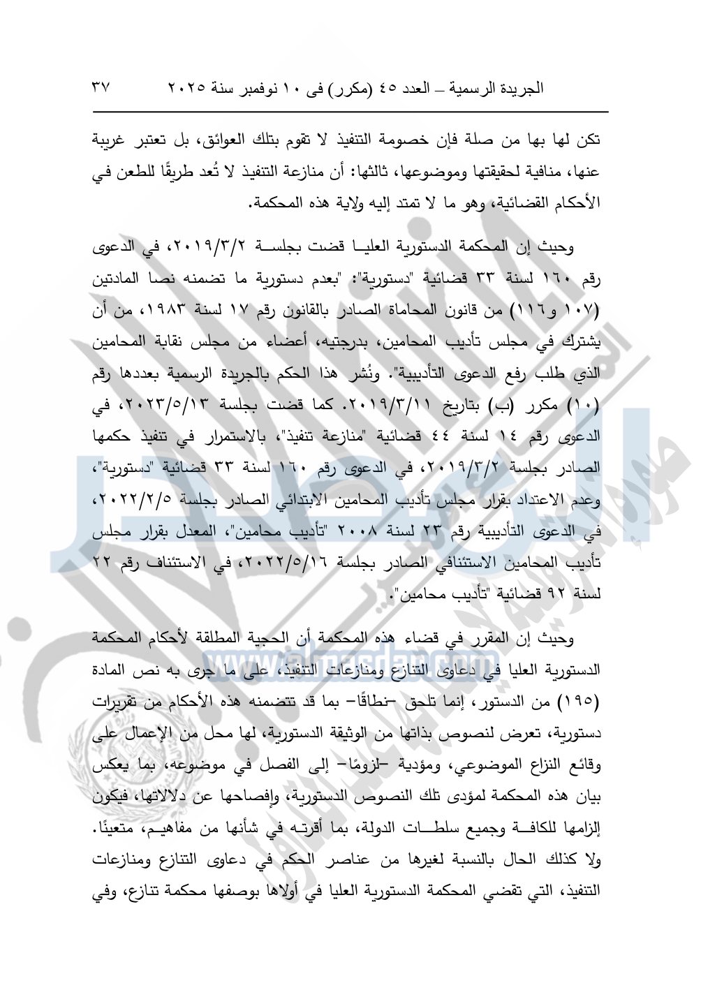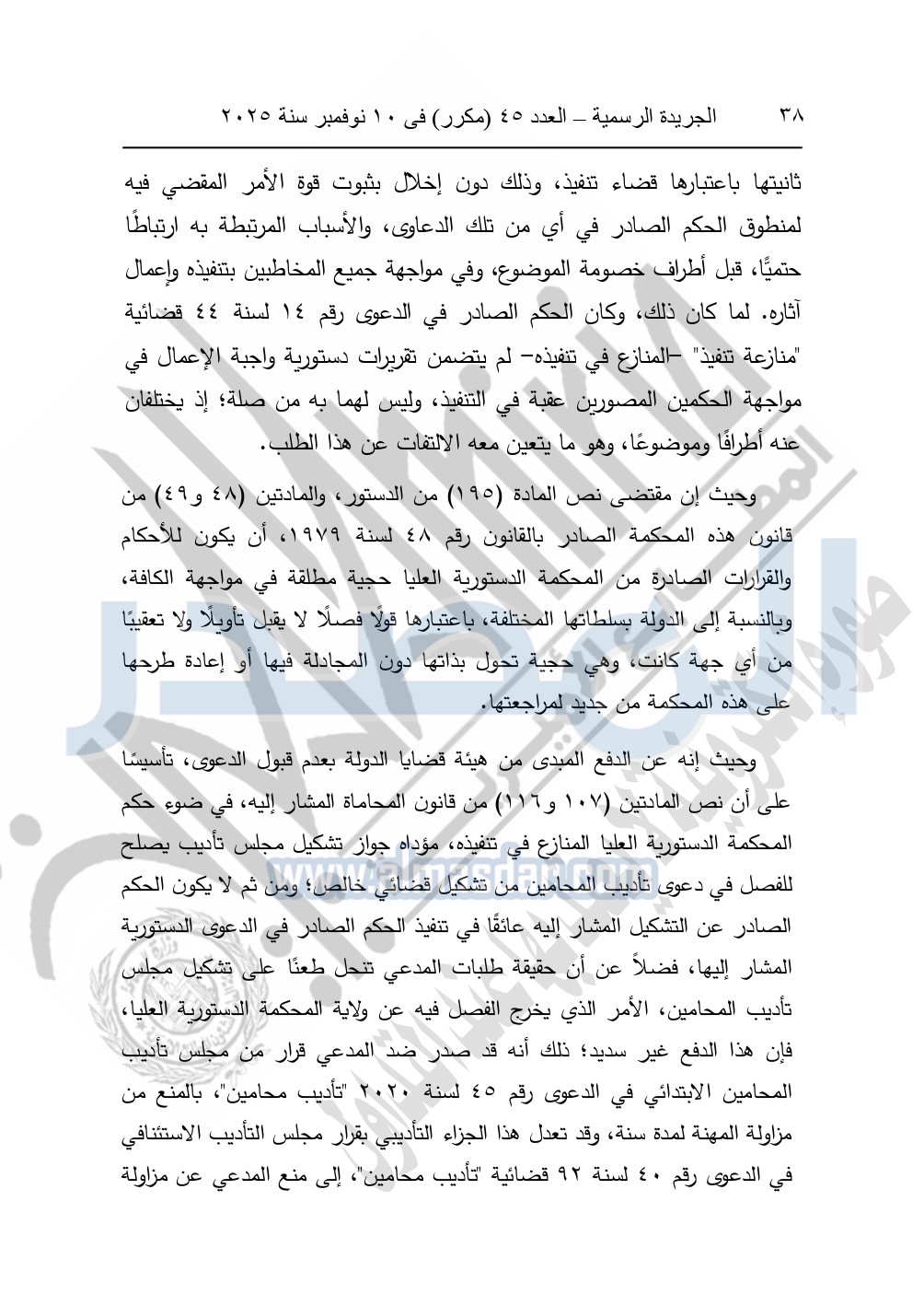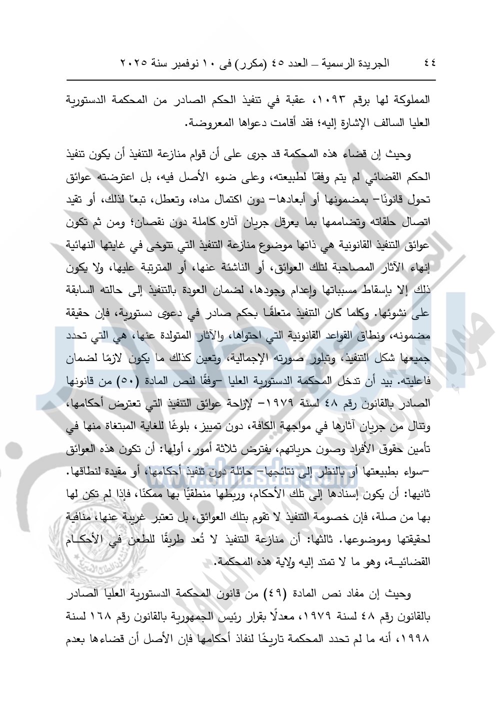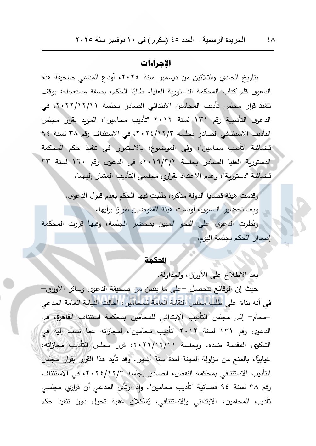 ونشرت الجريدة الرسمية في العدد 45 "مكرر"، في 10 نوفمبر سنة 2025، الأحكام الصادرة من المحكمة الدستورية العليا في عدد من الدعاوي القضائية بجلسة 8 نوفمبر 2025.
