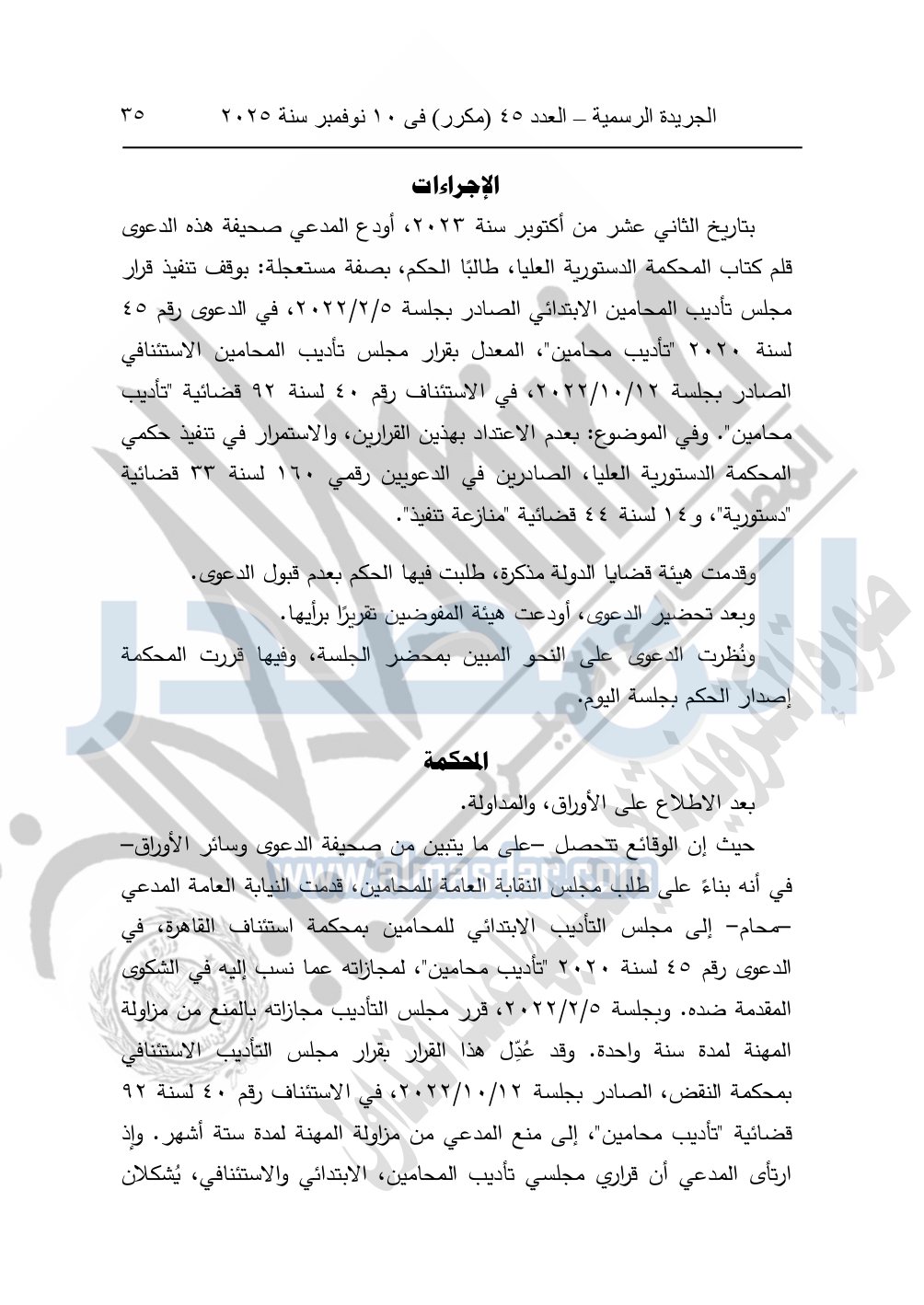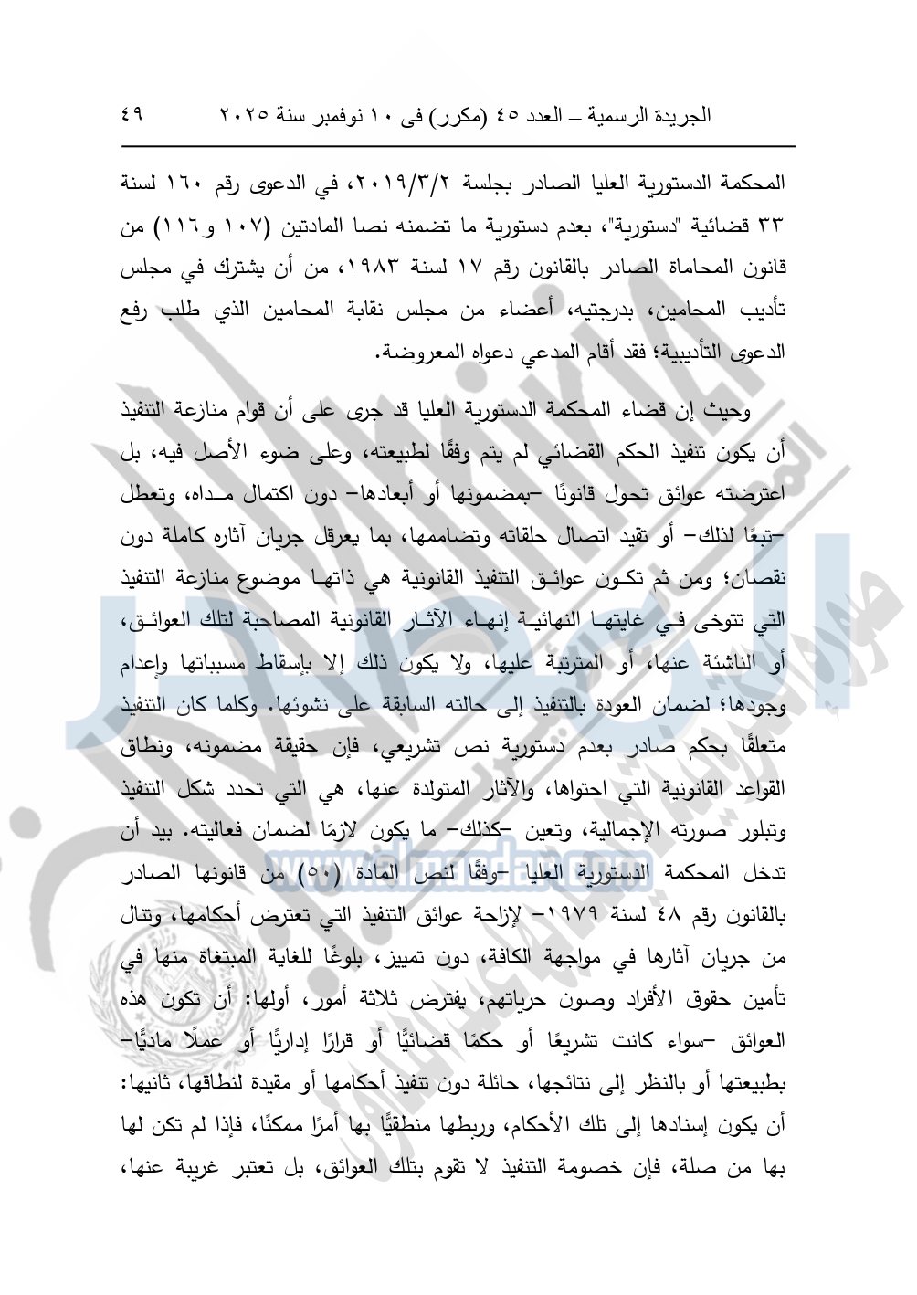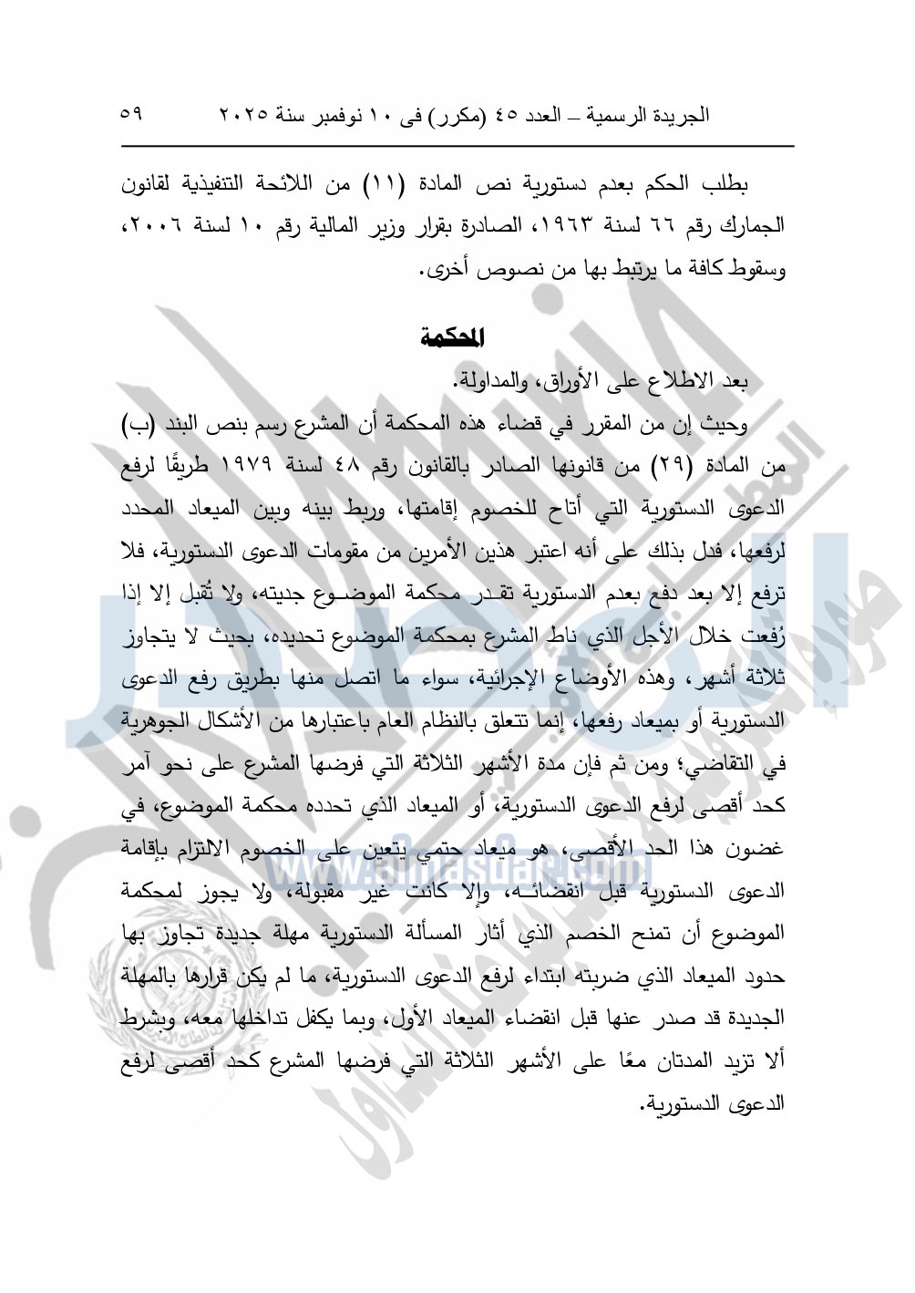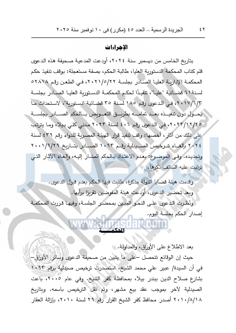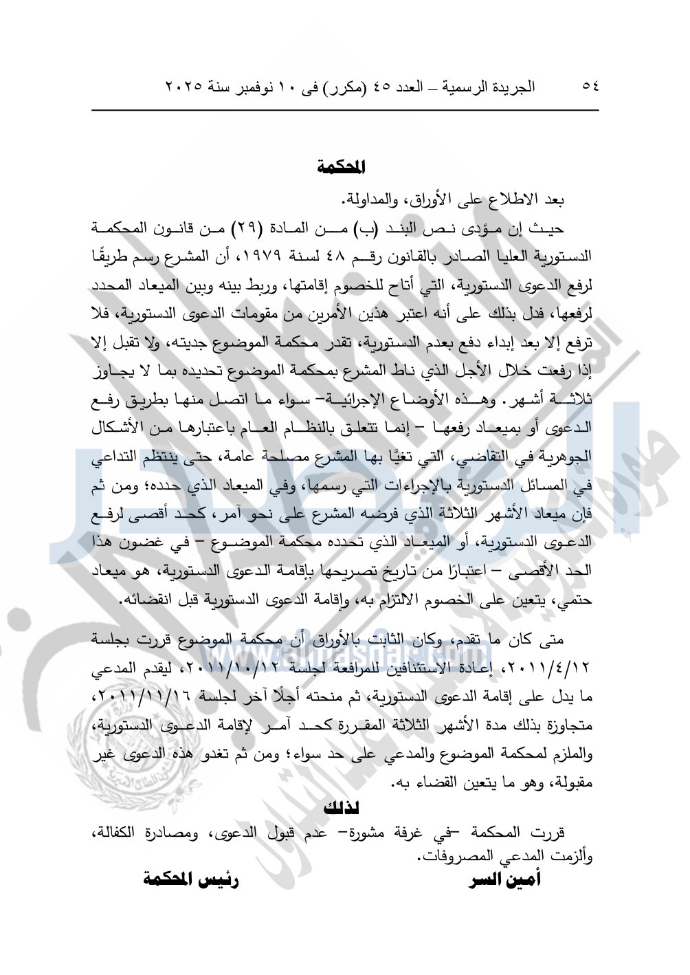 ونشرت الجريدة الرسمية في العدد 45 "مكرر"، في 10 نوفمبر سنة 2025، الأحكام الصادرة من المحكمة الدستورية العليا في عدد من الدعاوي القضائية بجلسة 8 نوفمبر 2025.