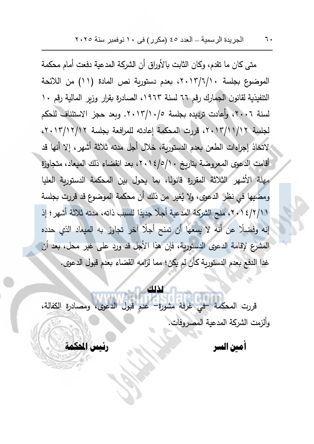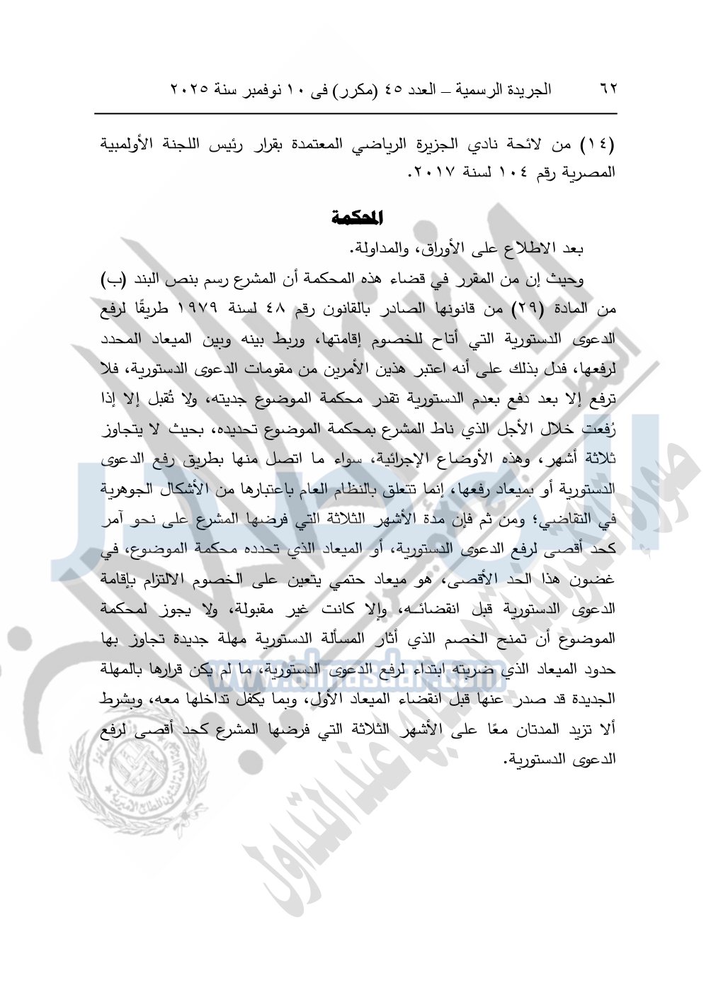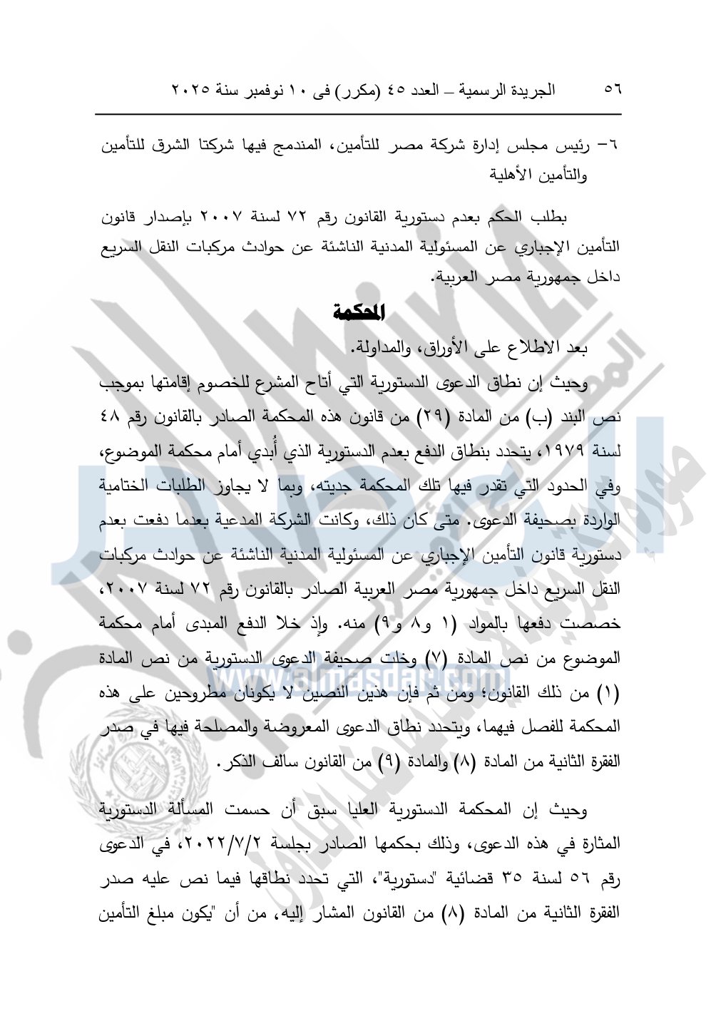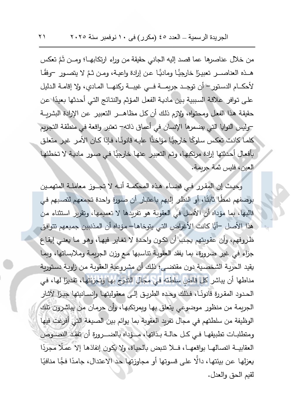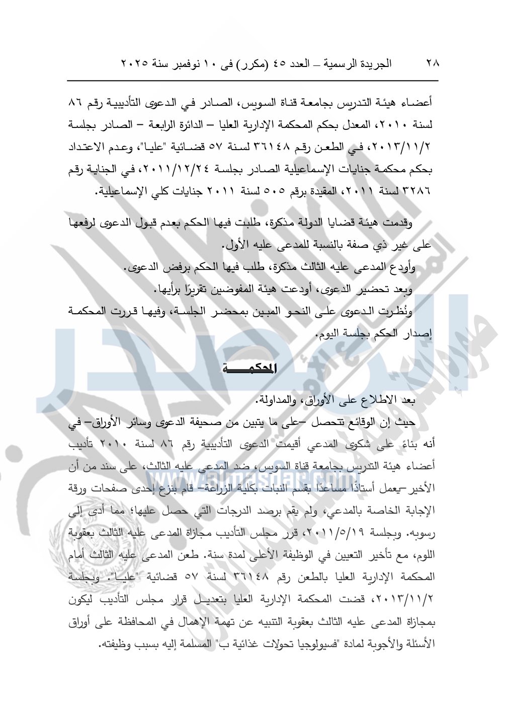 ونشرت الجريدة الرسمية في العدد 45 "مكرر"، في 10 نوفمبر سنة 2025، الأحكام الصادرة من المحكمة الدستورية العليا في عدد من الدعاوي القضائية بجلسة 8 نوفمبر 2025.