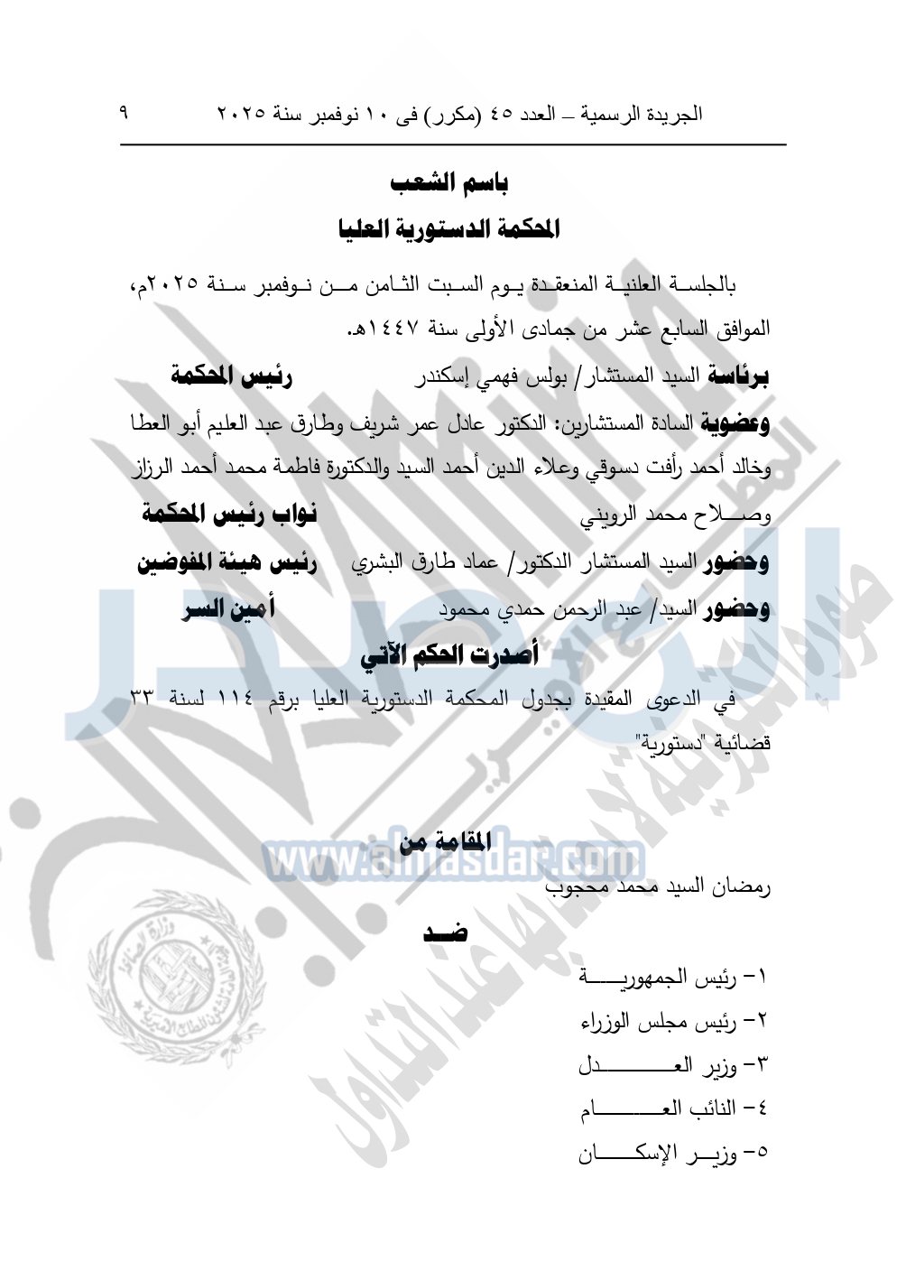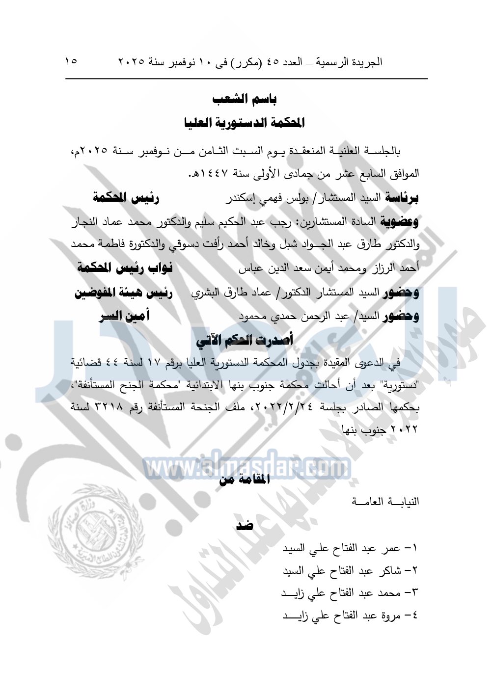 وأصدرت المحكمة الدستورية العليا حكمها في الدعوى المقامة من النيابة العامة ضد كل من: