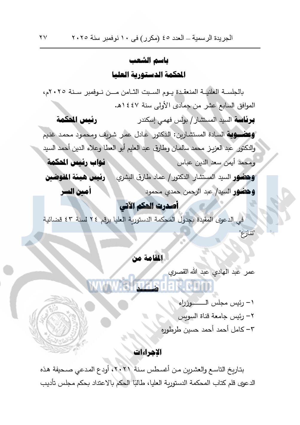 وأصدرت المحكمة الدستورية العليا حكمها في الدعوى المقامة من عمر عبد الهادي عبد الله القصري ضد كل من: