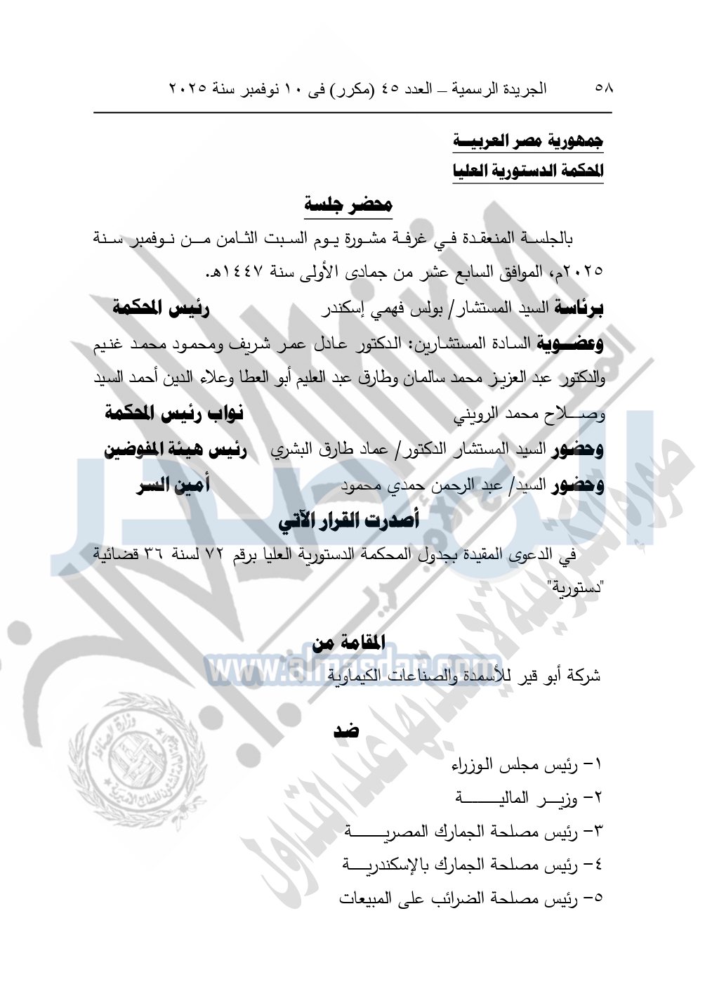 وأصدرت المحكمة الدستورية العليا حكمها في الدعوى المقامة من شركة أبو قير للأسمدة والصناعات الكيماوية ضد كل من: