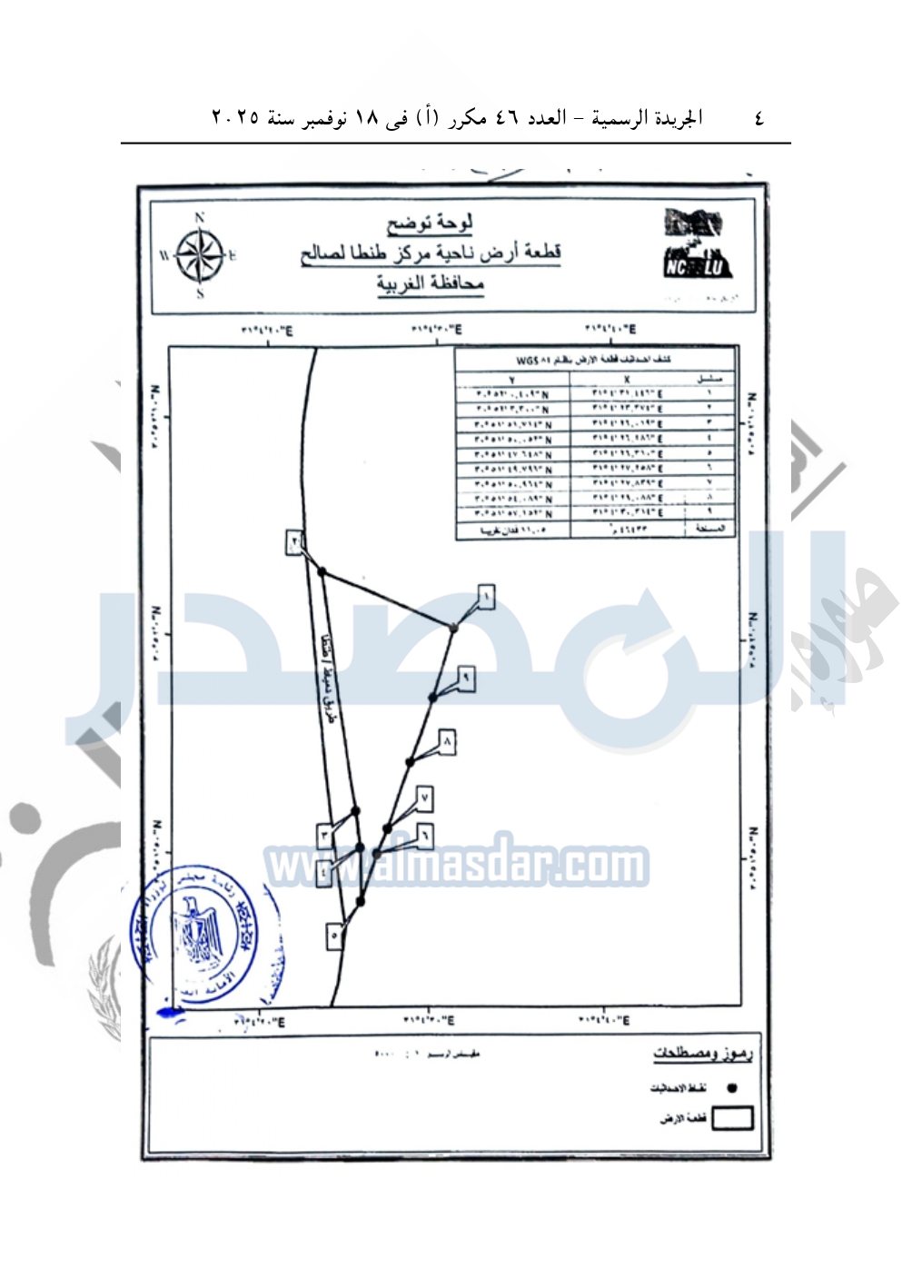 ينقل الإشراف الإداري على مساحة 11.05 فدان تقريبًا تعادل 46433 مترًا مربعًا ناحية مركز ومدينة طنطا من مركز البحوث الزراعية التابع لوزارة الزراعة واستصلاح الأراضى إلى محافظة الغربية وفقًا للوحة وجدول الإحداثيات المرفقين، لاستخدامها إقامة سوق للخضار والفاكهة.