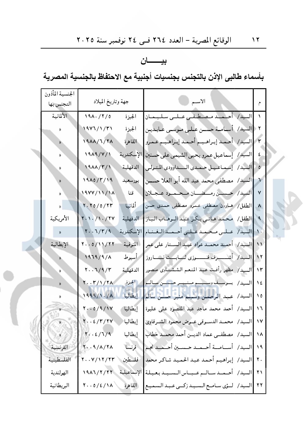 كما نشرت الوقائع المصرية في العدد 264 الصادر في 24 نوفمبر سنة 2025، قرار وزارة الداخلية، رقم 1906 لسنة 2025، بشأن الإذن للواحد والعشرين مواطن بالحصول على الجنسية الأجنبية مع احتفاظهم بالجنسية المصرية.