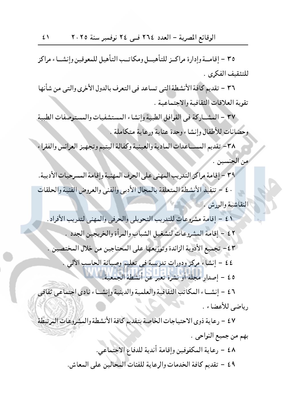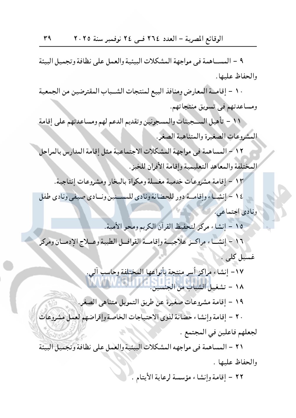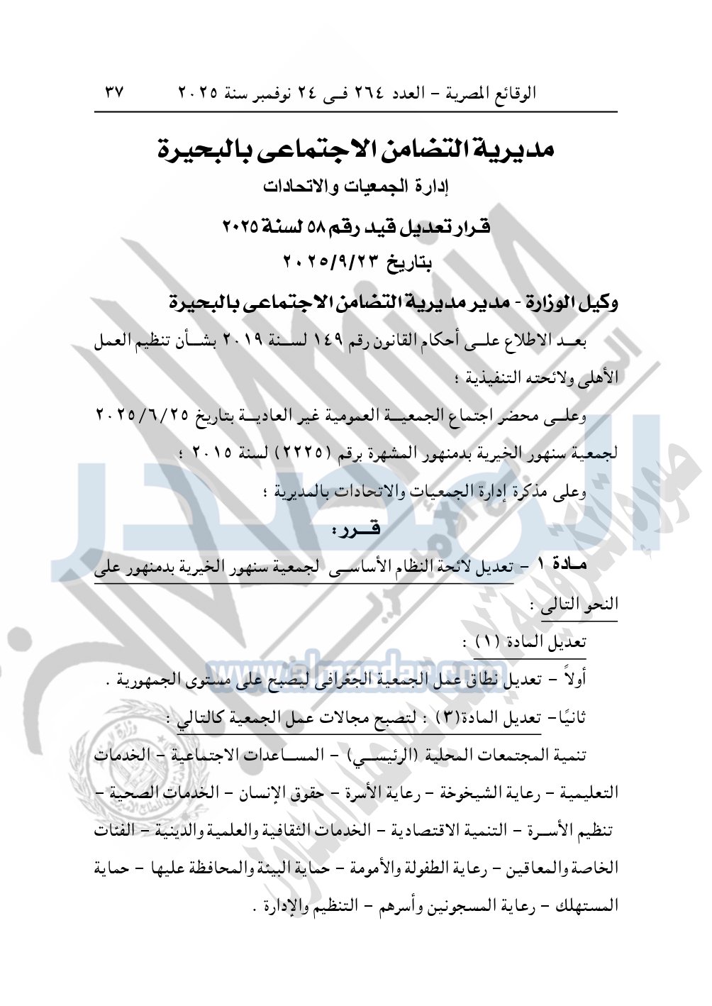 كما نشرت الوقائع المصرية في العدد 264، بتاريخ 24 نوفمبر 2025، قرار مديرية التضامن الاجتماعي بالبحيرة، قرار تعديل رقم 58 لسنة 2025، بتاريخ 23-9-2025، بشأن تعديل قيد جمعية سنهور الخيرية بدمنهور.