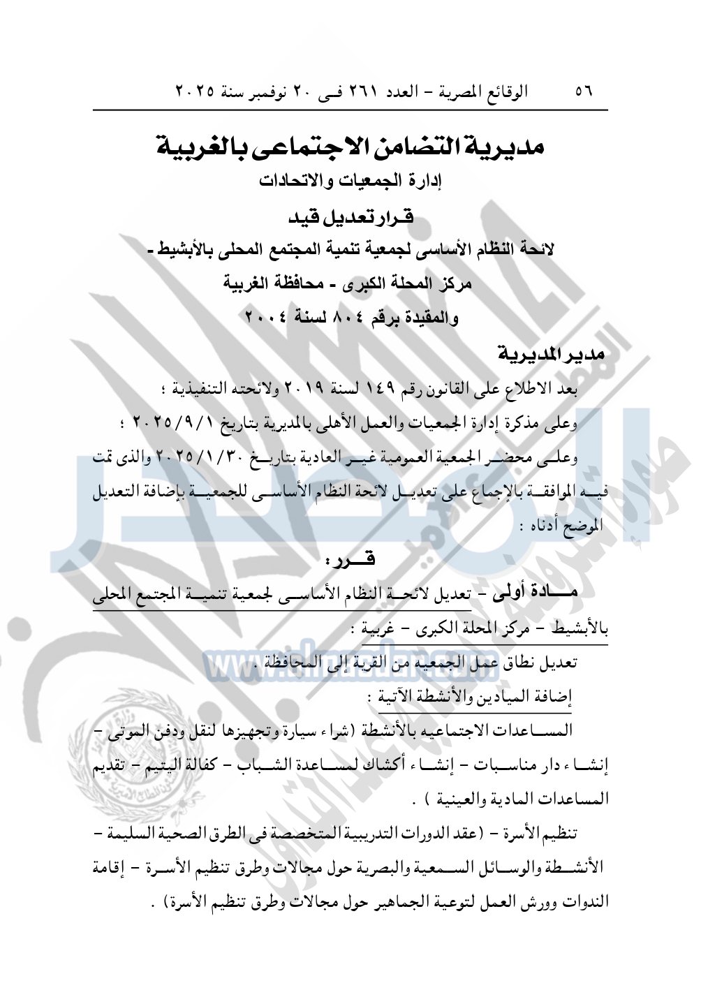 وأيضا نشرت الوقائع المصرية في العدد 261، بتاريخ 20 نوفمبر 2025، قرار مديرية التضامن الاجتماعي بالغربية، قرار تعديل رقم 804 لسنة 2004، بشأن تعديل قيد لائحة النظام الأساسي لجمعية تنمية المجتمع المحلى بالأبشيط - مركز المحلة الكبرى - محافظة الغربية.