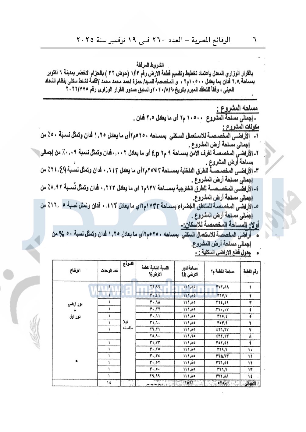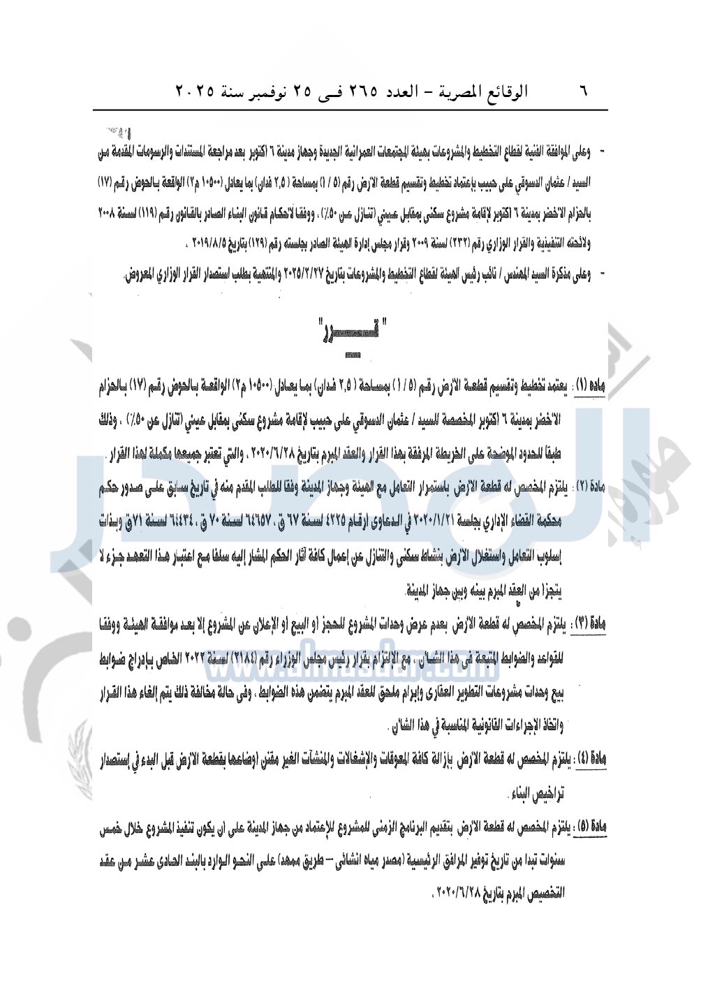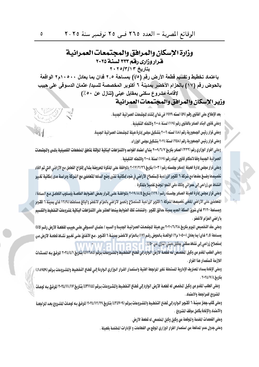 نشرت الوقائع المصرية، في العدد 265، الصادر في في 25 نوفمبر سنة 2025، قرار وزارة الإسكان والمرافق والمجتمعات العمرانية، رقم 333 لسنة 2025، بتاريخ 13-3-2025، بشأن اعتماد تخطيط وتقسيم قطعة الأرض رقم "5/ أ" بمساحة 2.5 فدان بما يعادل 10500م2 الواقعة بالحوض رقم "17" بالحزام الأخضر بمدينة 6 أكتوبر المخصصة لـ عثمان الدسوقى على حبيب لإقامة مشروع سكنى بمقابل عينى "تنازل عن 50%".
