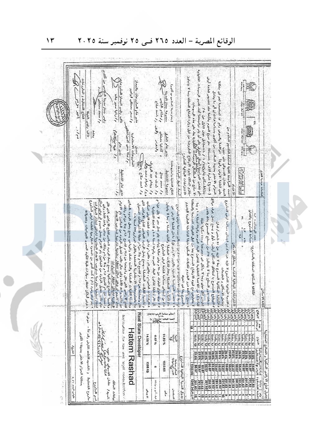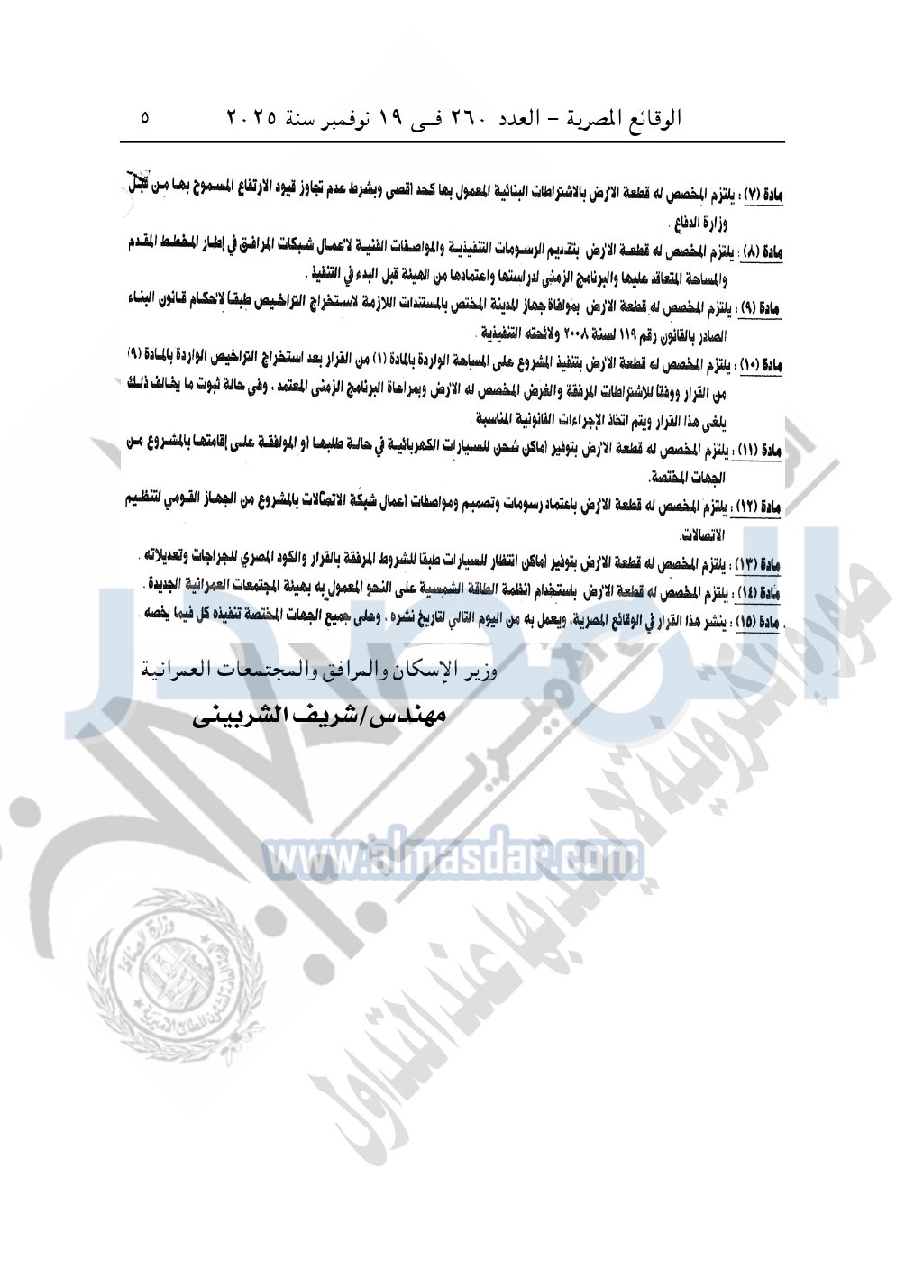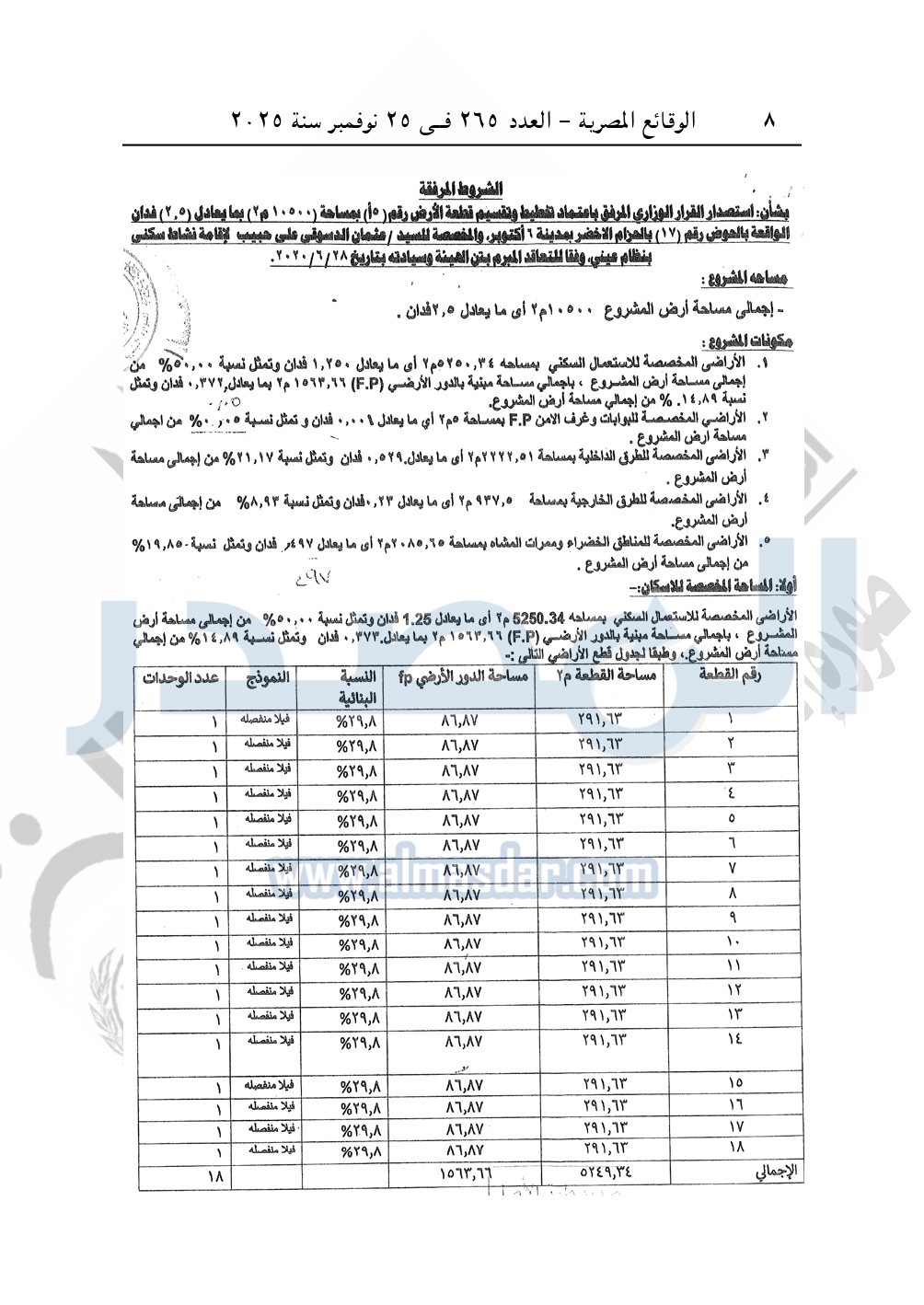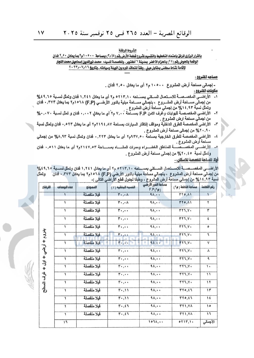 نشرت الوقائع المصرية، في العدد 265، الصادر في في 25 نوفمبر سنة 2025، قرار وزارة الإسكان والمرافق والمجتمعات العمرانية، رقم 333 لسنة 2025، بتاريخ 13-3-2025، بشأن اعتماد تخطيط وتقسيم قطعة الأرض رقم "5/ أ" بمساحة 2.5 فدان بما يعادل 10500م2 الواقعة بالحوض رقم "17" بالحزام الأخضر بمدينة 6 أكتوبر المخصصة لـ عثمان الدسوقى على حبيب لإقامة مشروع سكنى بمقابل عينى "تنازل عن 50%".