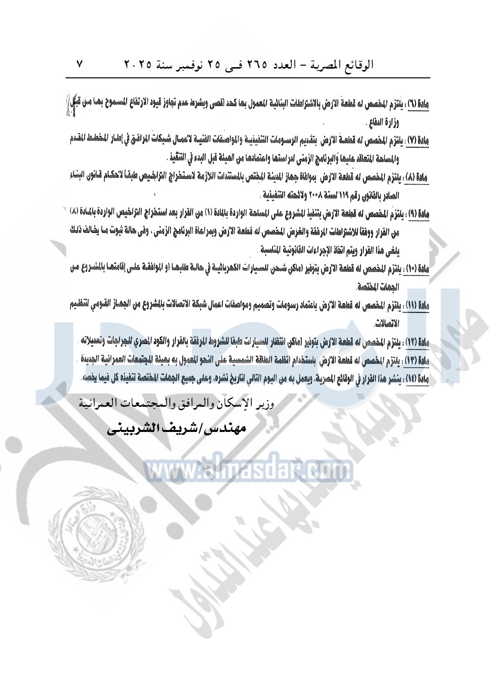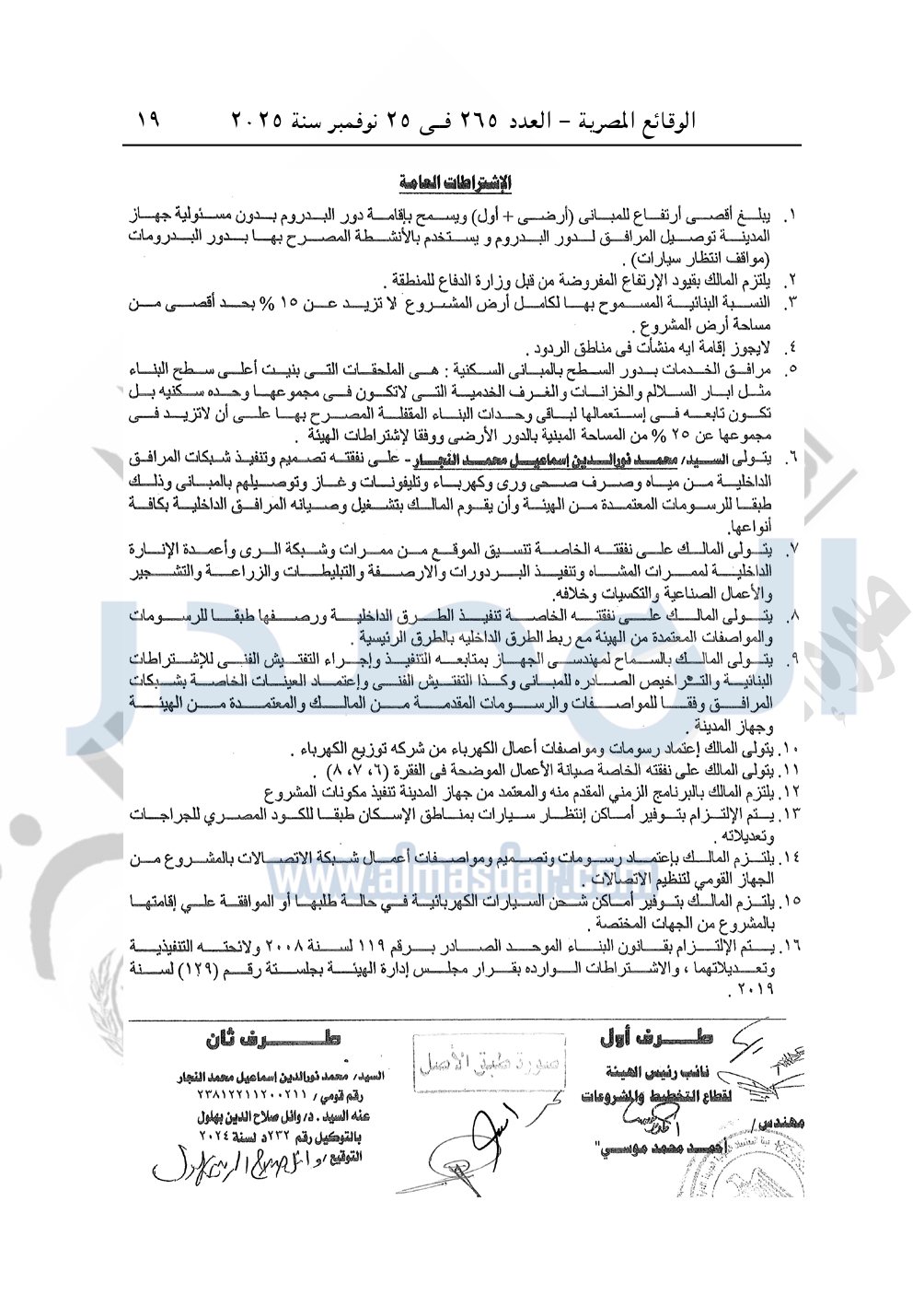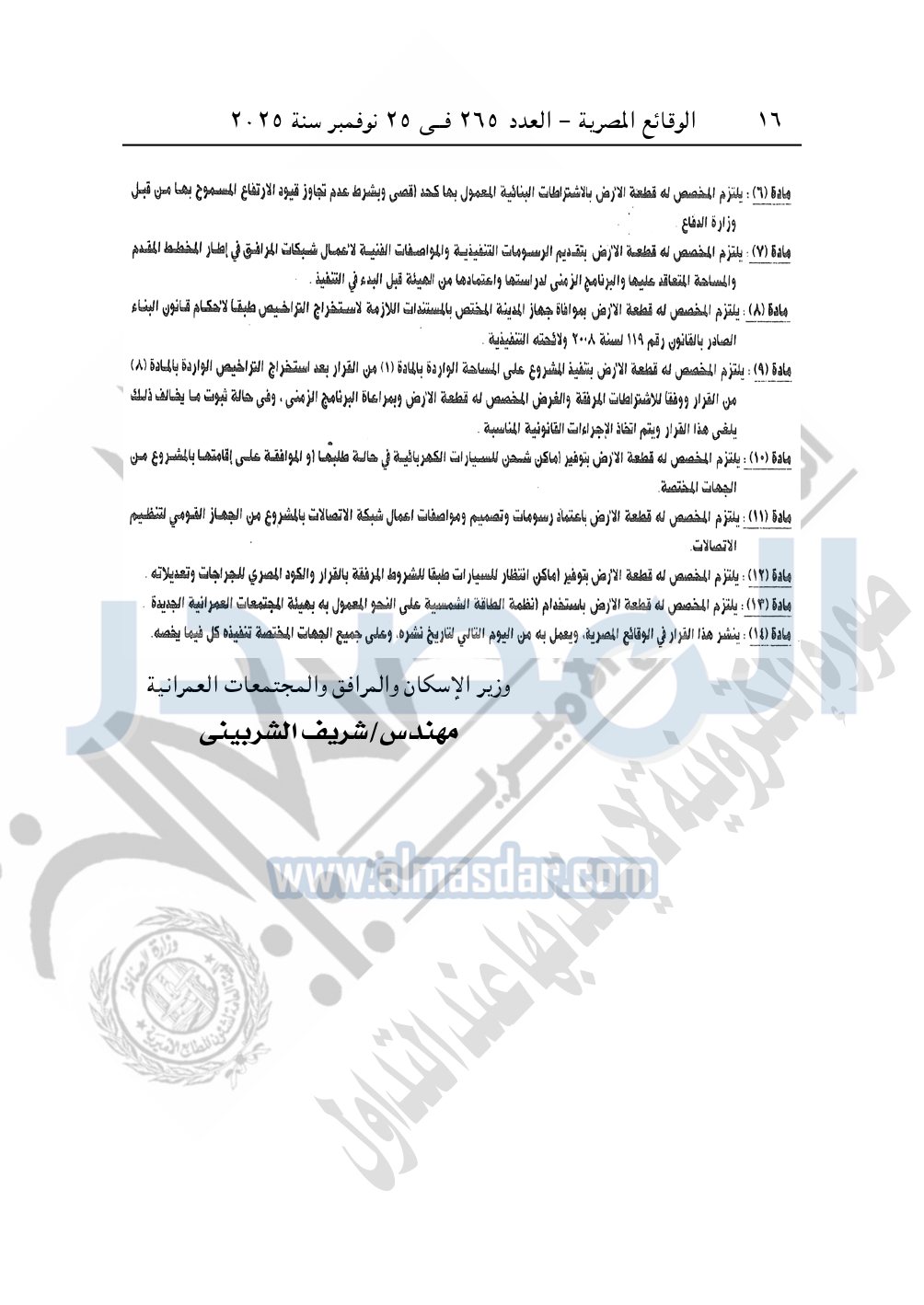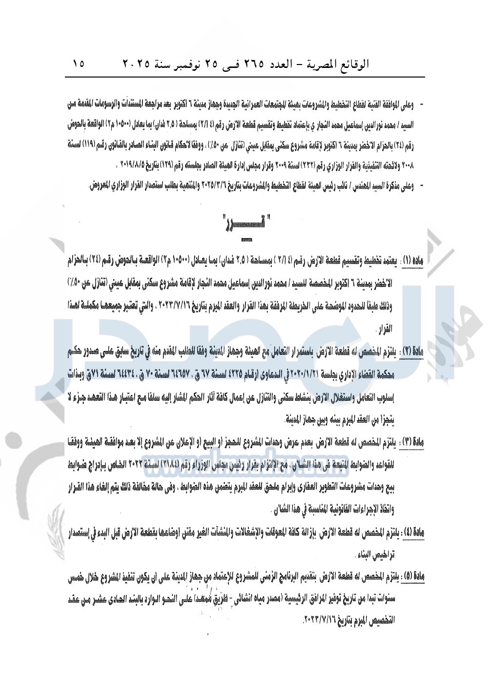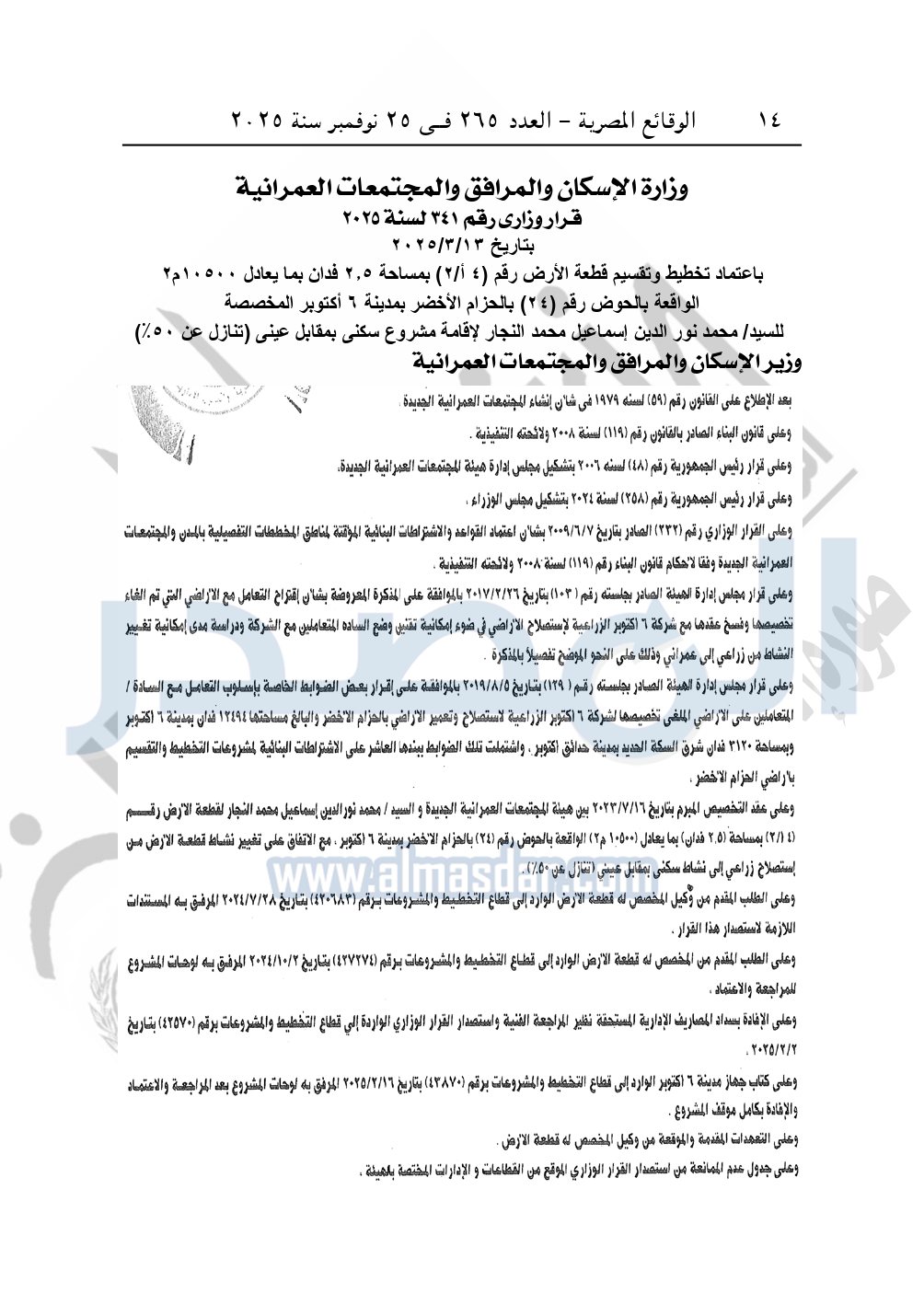كما نشرت الوقائع المصرية، في العدد 265، الصادر في في 25 نوفمبر سنة 2025، قرار وزارة الإسكان والمرافق والمجتمعات العمرانية، رقم 341 لسنة 2025، بتاريخ 13-3-2025، بشأن اعتماد تخطيط وتقسيم قطعة الأرض رقم "4أ / 2" بمساحة 2.5 فدان بما يعادل 10500م2 الواقعة بالحوض رقم "24" بالحزام الأخضر بمدينة 6 أكتوبر المخصصة لـ محمد نور الدين إسماعيل محمد النجار لإقامة مشروع سكنى بمقابل عينى "تنازل عن 50%".