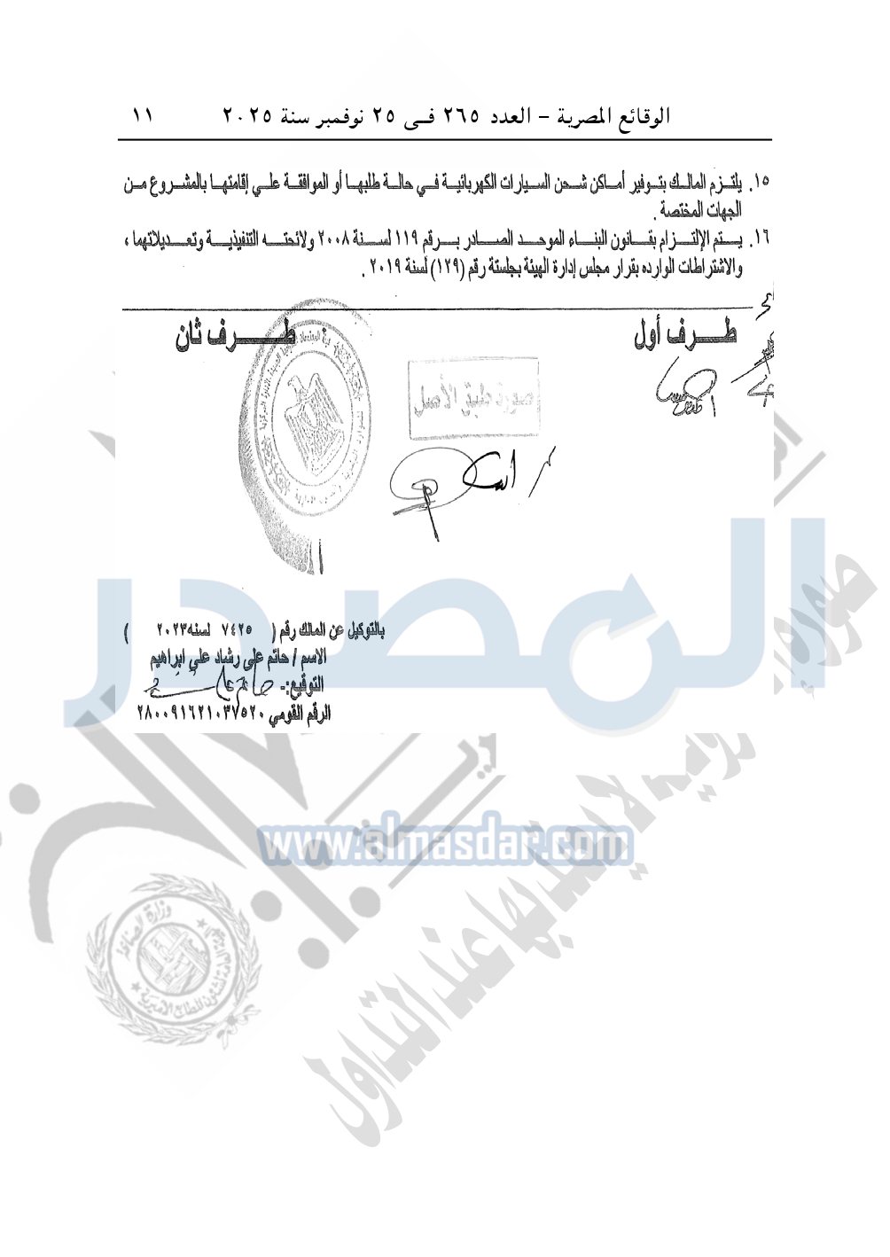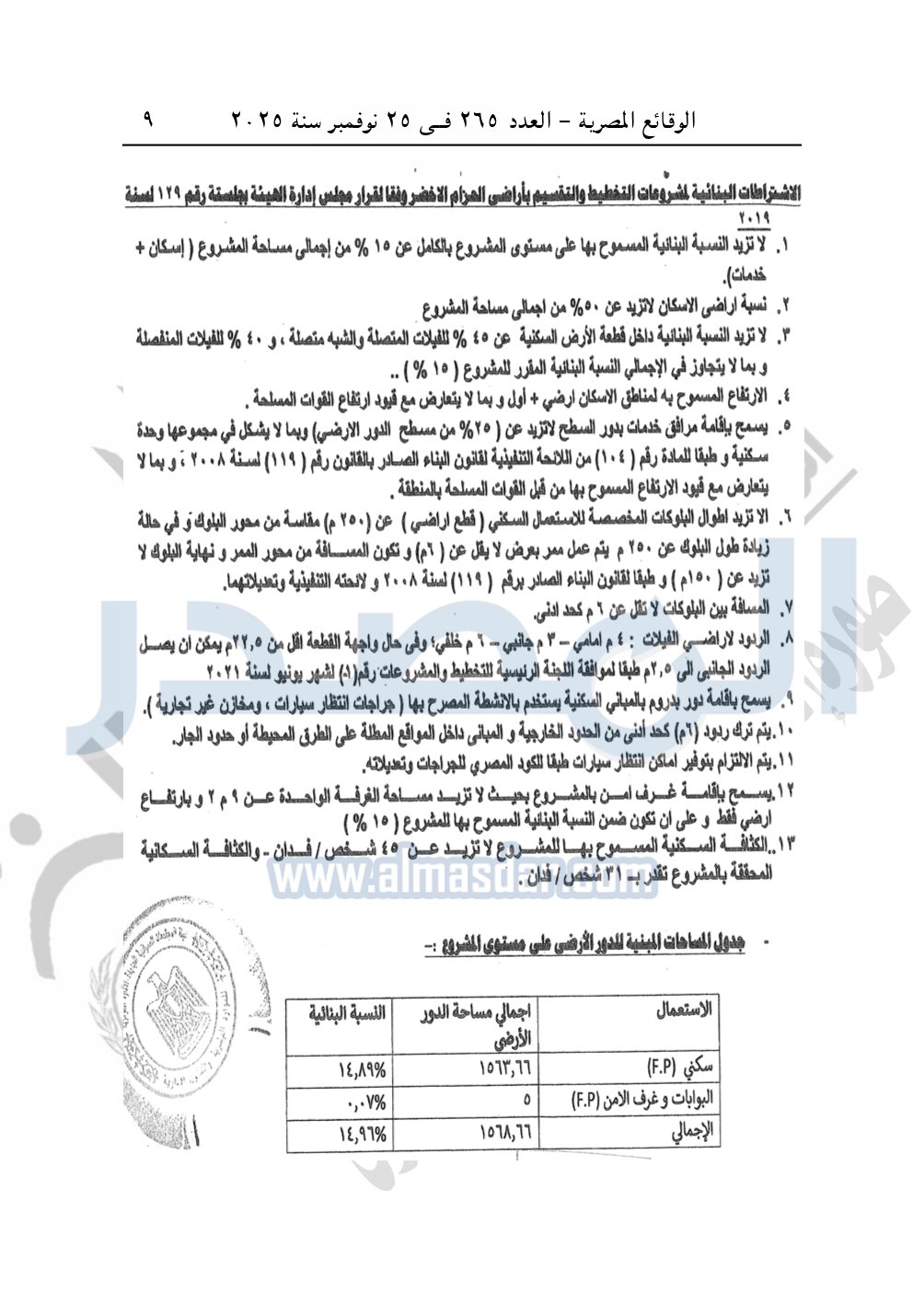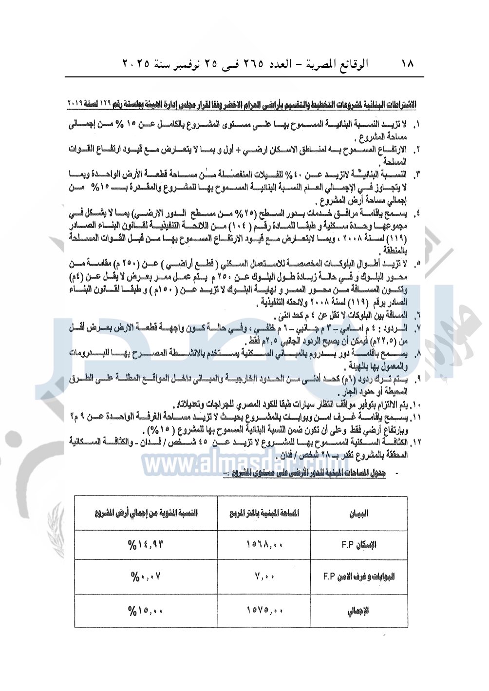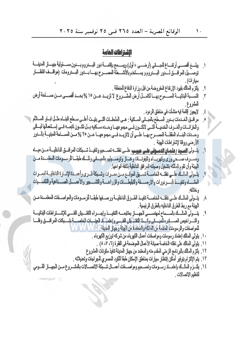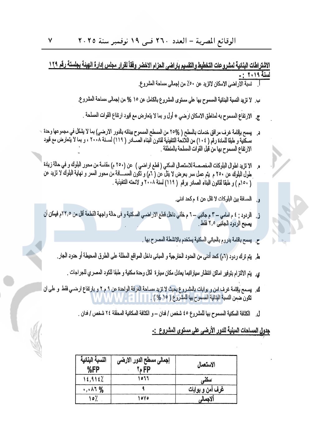 كما نشرت الوقائع المصرية، في العدد 265، الصادر في في 25 نوفمبر سنة 2025، قرار وزارة الإسكان والمرافق والمجتمعات العمرانية، رقم 341 لسنة 2025، بتاريخ 13-3-2025، بشأن اعتماد تخطيط وتقسيم قطعة الأرض رقم "4أ / 2" بمساحة 2.5 فدان بما يعادل 10500م2 الواقعة بالحوض رقم "24" بالحزام الأخضر بمدينة 6 أكتوبر المخصصة لـ محمد نور الدين إسماعيل محمد النجار لإقامة مشروع سكنى بمقابل عينى "تنازل عن 50%".