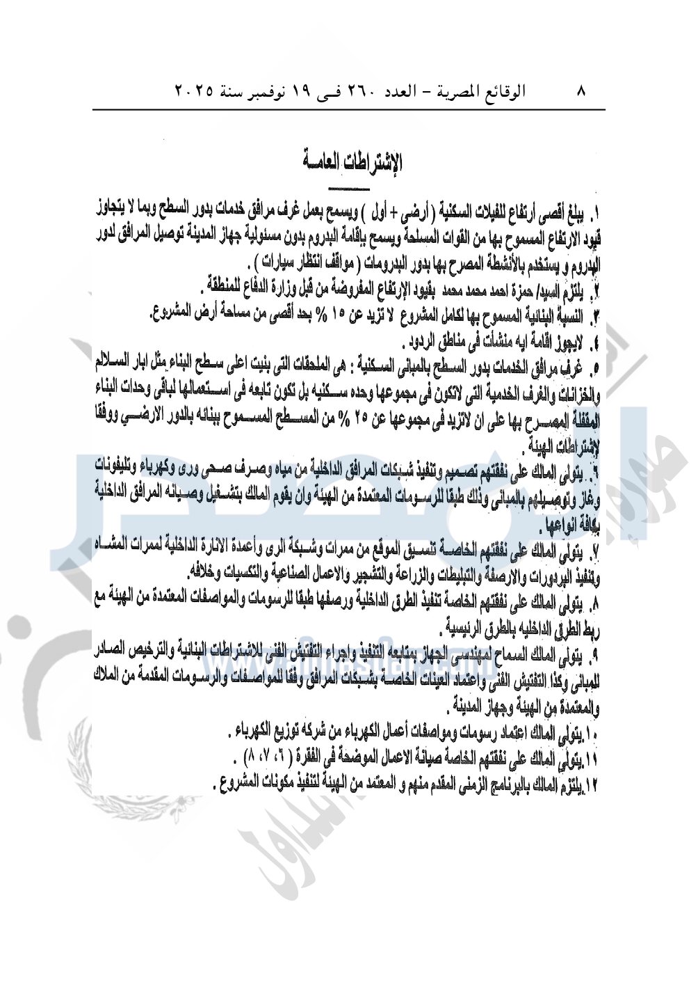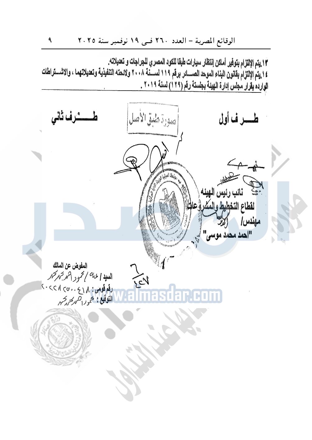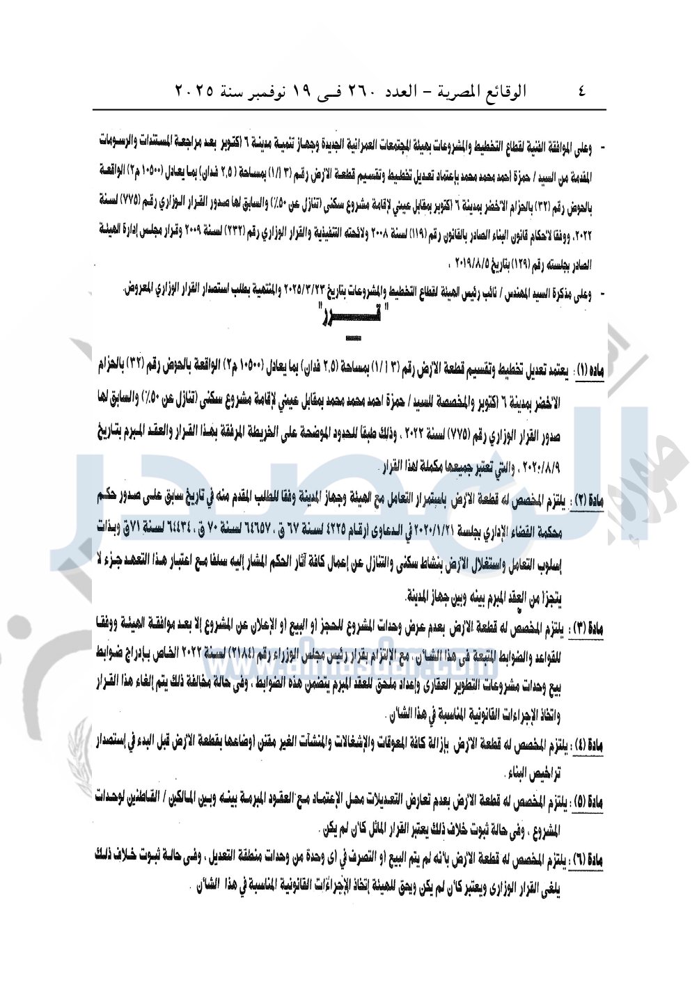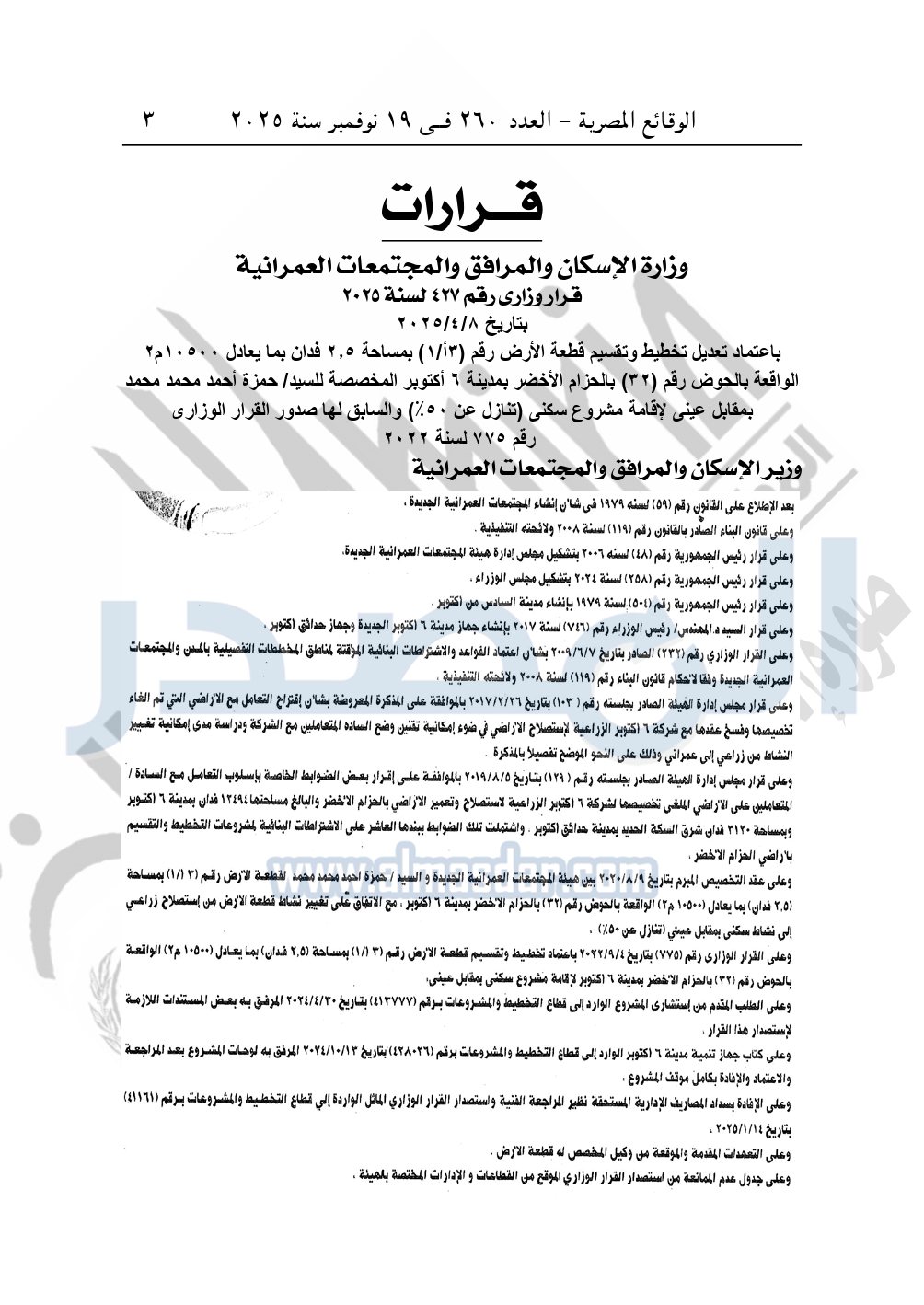 وأيضا نشرت الوقائع المصرية، في العدد 260، الصادر في في 19 نوفمبر سنة 2025، قرار وزارة الإسكان والمرافق والمجتمعات العمرانية، رقم 427 لسنة 2025، بتاريخ 8-4-2025، بشأن اعتماد تعديل تخطيط وتقسيم قطعة الأرض رقم "3أ /1" بمساحة 2.5 فدان بما يعادل 10500م2 الواقعة بالحوض رقم "32" بالحزام الأخضر بمدينة 6 أكتوبر المخصصة لـ حمزة أحمد محمد محمد بمقابل عيني لإقامة مشروع سكنى "تنازل عن 50%" والسابق لها صدور القرار الوزارى رقم 775 لسنة 2022.