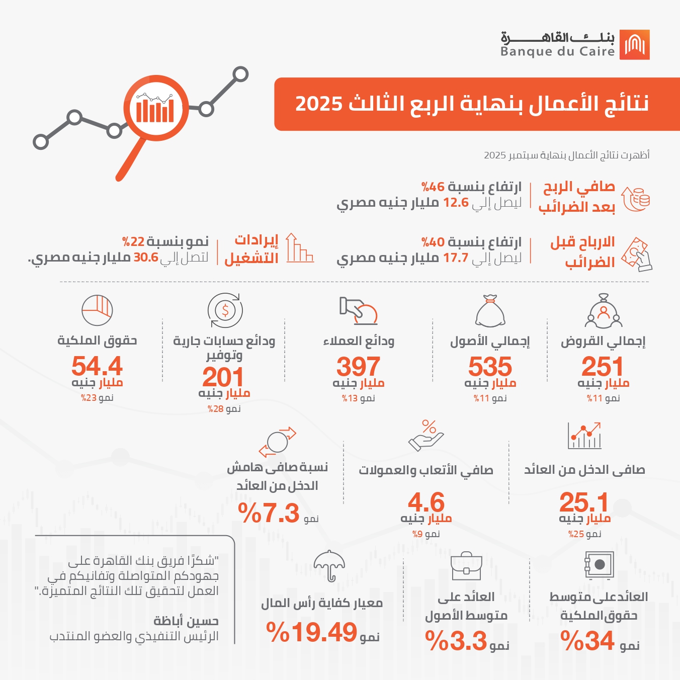وارتفعت الأرباح قبل الضرائب لبنك القاهرة بنهاية سبتمبر 2025، بنسبة 40% مدفوعة بتحسن نتائج أعمال البنك في مختلف القطاعات ومن أبرزها التجزئة المصرفية، الخزانة، ائتمان الشركات، والمشروعات الصغيرة والمتوسطة.