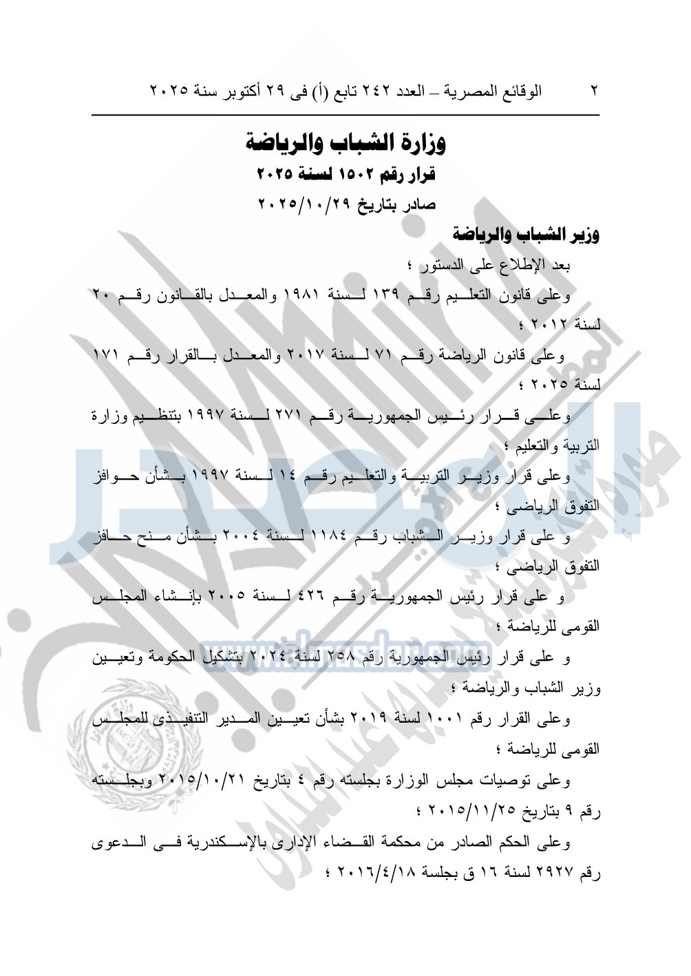 نشرت الوقائع المصرية، في العدد 242 تابع "أ"، الصادر في 29 أكتوبر سنة 2025، قرار وزارة الشباب والرياضة، رقم 1502 لسنة 2025، بتاريخ 29-10-2025، بشأن إلغاء القرار الوزاری رقم 130 لسنة 2017 والمعدل بالقرار الوزارى رقم 308 لسنة 2020 المنظم لمنح درجات التفوق الرياضي.