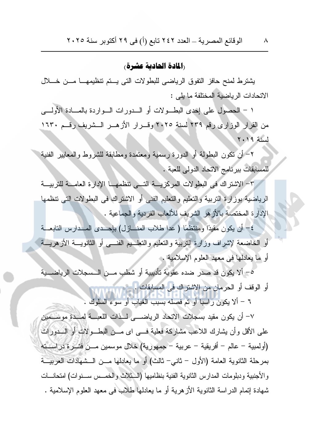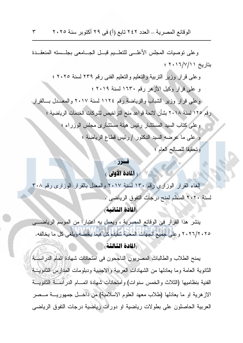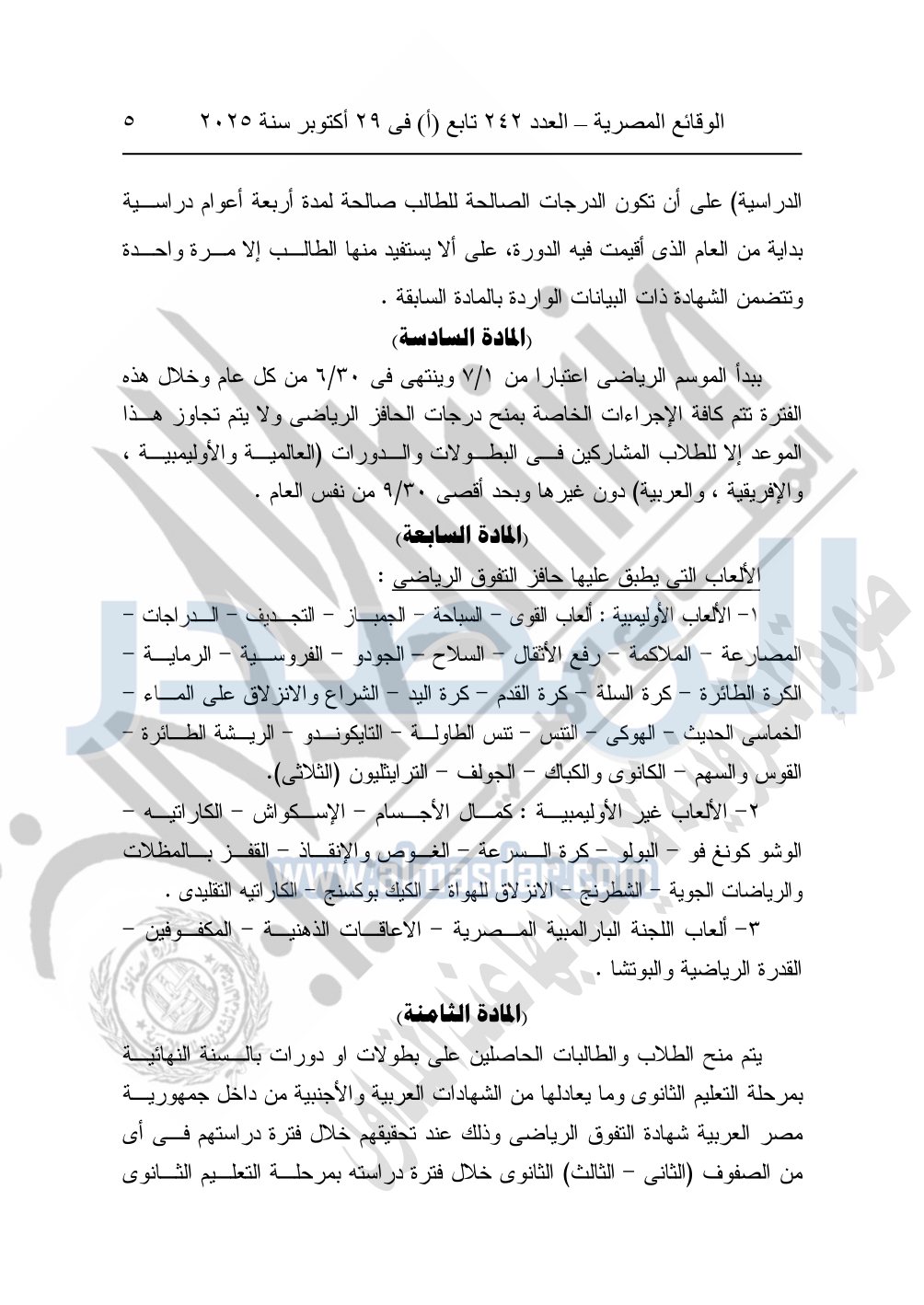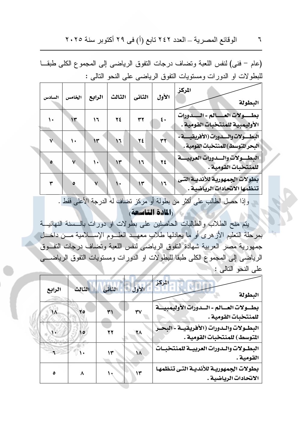 يمنح الطلاب والطالبات المصريون الناجحون في امتحانات شهادة اتمام الدراسة الثانوية العامة وما يعادلها من الشهادات العربية والاجنبية ودبلومات المدارس الثانوية الفنية بنظاميها "الثلاث والخمس سنوات" والشهادة اتمام الدراسة الثانوية الازهرية او ما يعادلها "طلاب معهد العلوم الاسلامية" من داخل جمهوريــة مـصـر العربية الحاصلون على بطولات رياضية او دورات رياضية درجات التفوق الرياضي وتضاف إلى المجموع الكلى طبقا لبطولات او الدورات المبينة بالمادة الأولى من قرار وزير التربية والتعليم رقم 239 لسنة 2025 وقرار الأزهر الشريف رقم 1630 لسنة 2019.