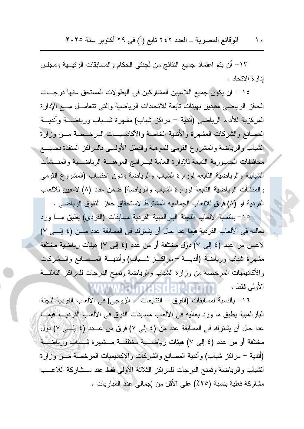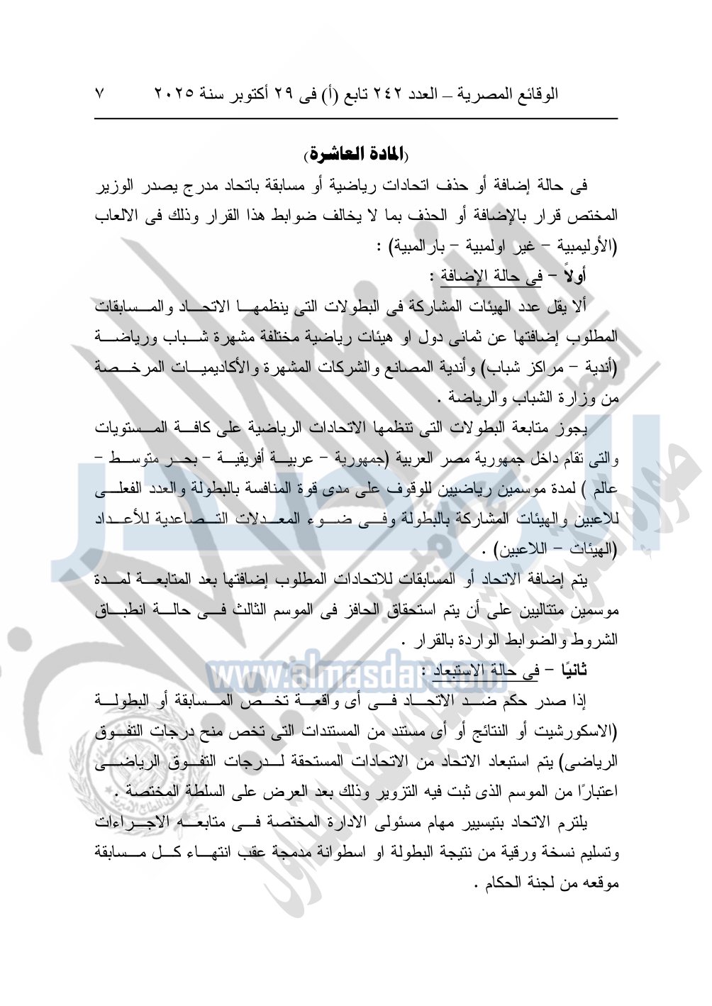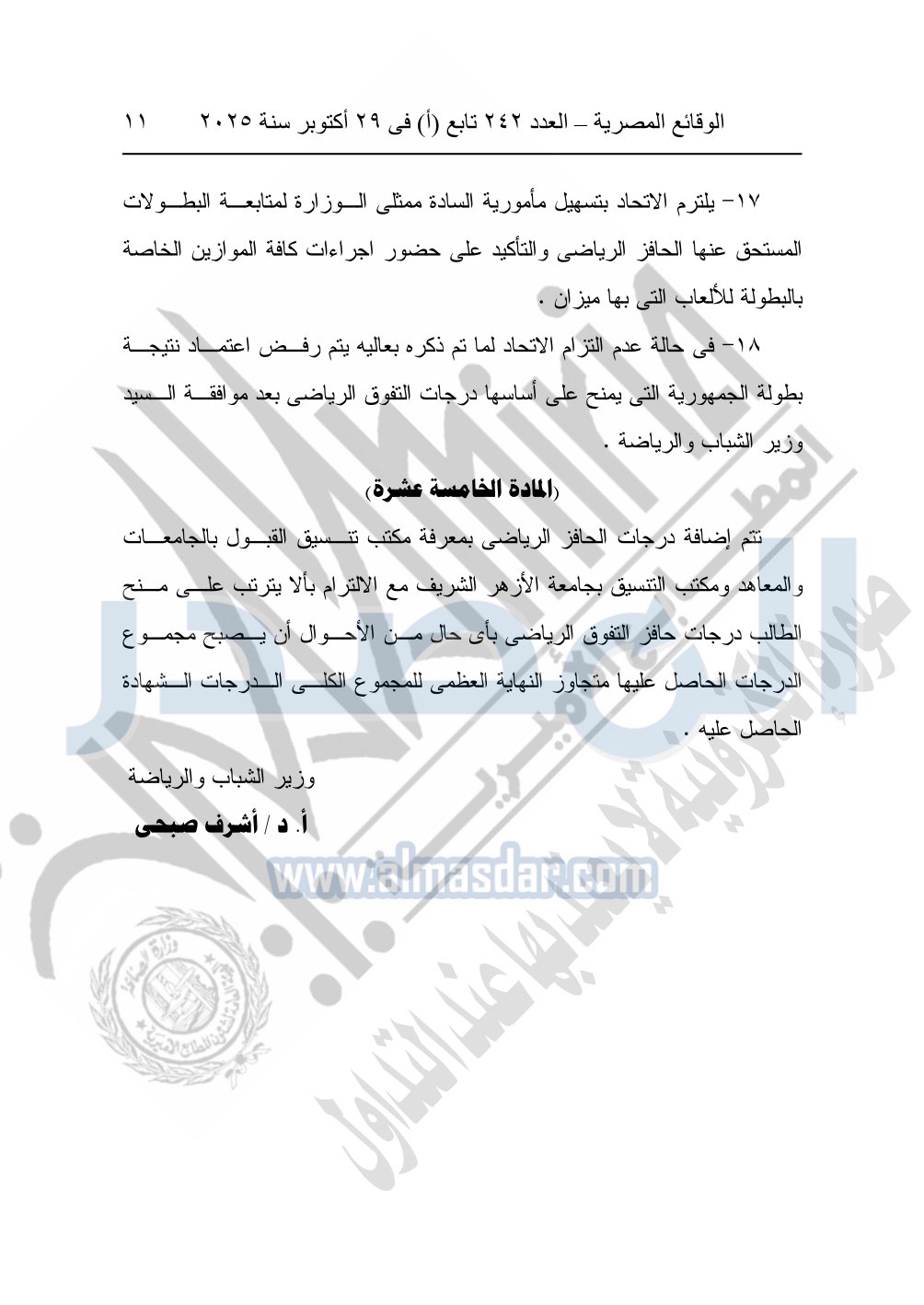 ينشر هذا القرار فى الوقائع المصرية ، ويعمل به اعتبارا من الموسم الرياضـي 2025-2026 وعلى جميع الجهات المعنية تنفيذه كل فيما يخصه ويلغى كل ما يخالفه.