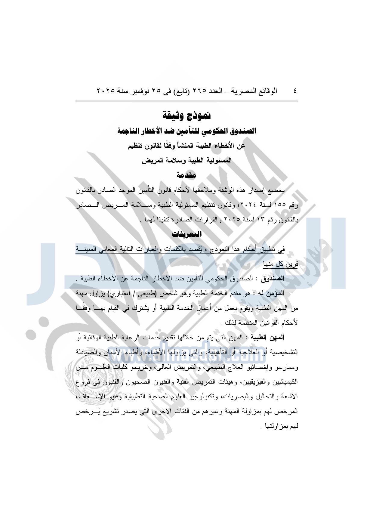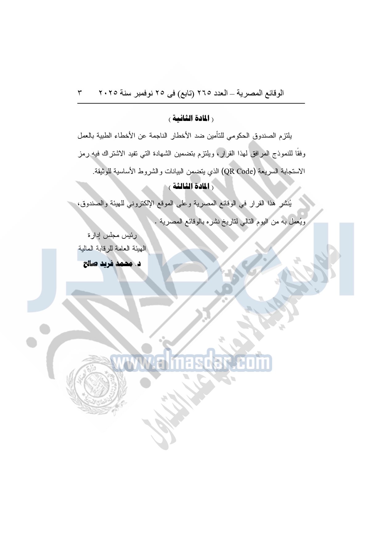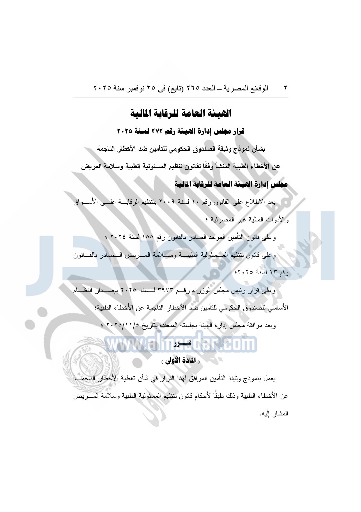 نشرت الوقائع المصرية، في العدد 265 "تابع"، الصادر في 25 نوفمبر سنة 2025، قرار الهيئة العامة للرقابة المالية، رقم 272 لسنة 2025، بشأن نموذج وثيقة الصندوق الحكومي للتأمين ضد الأخطار الناجمة عن الأخطاء الطبية المنشأ وفقًا لقانون تنظيم المسئولية الطبية وسلامة المريض.