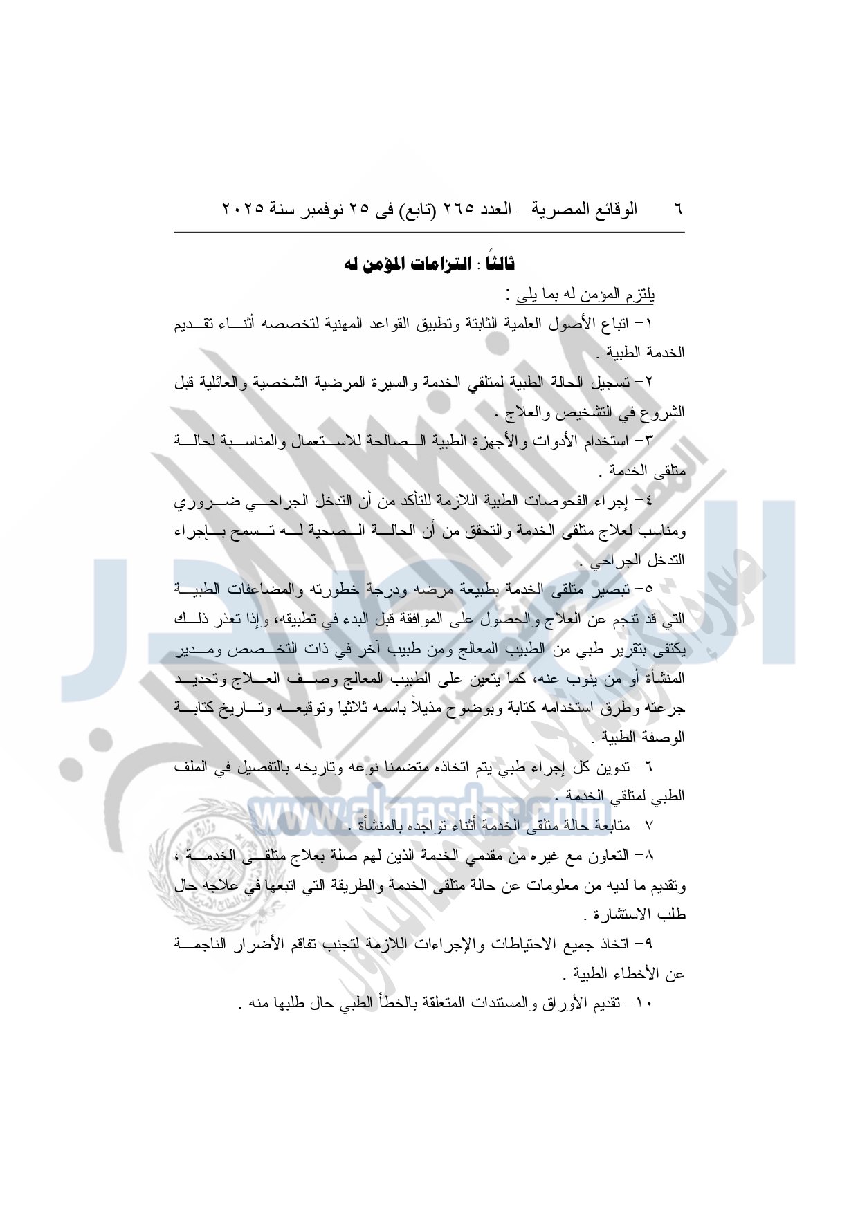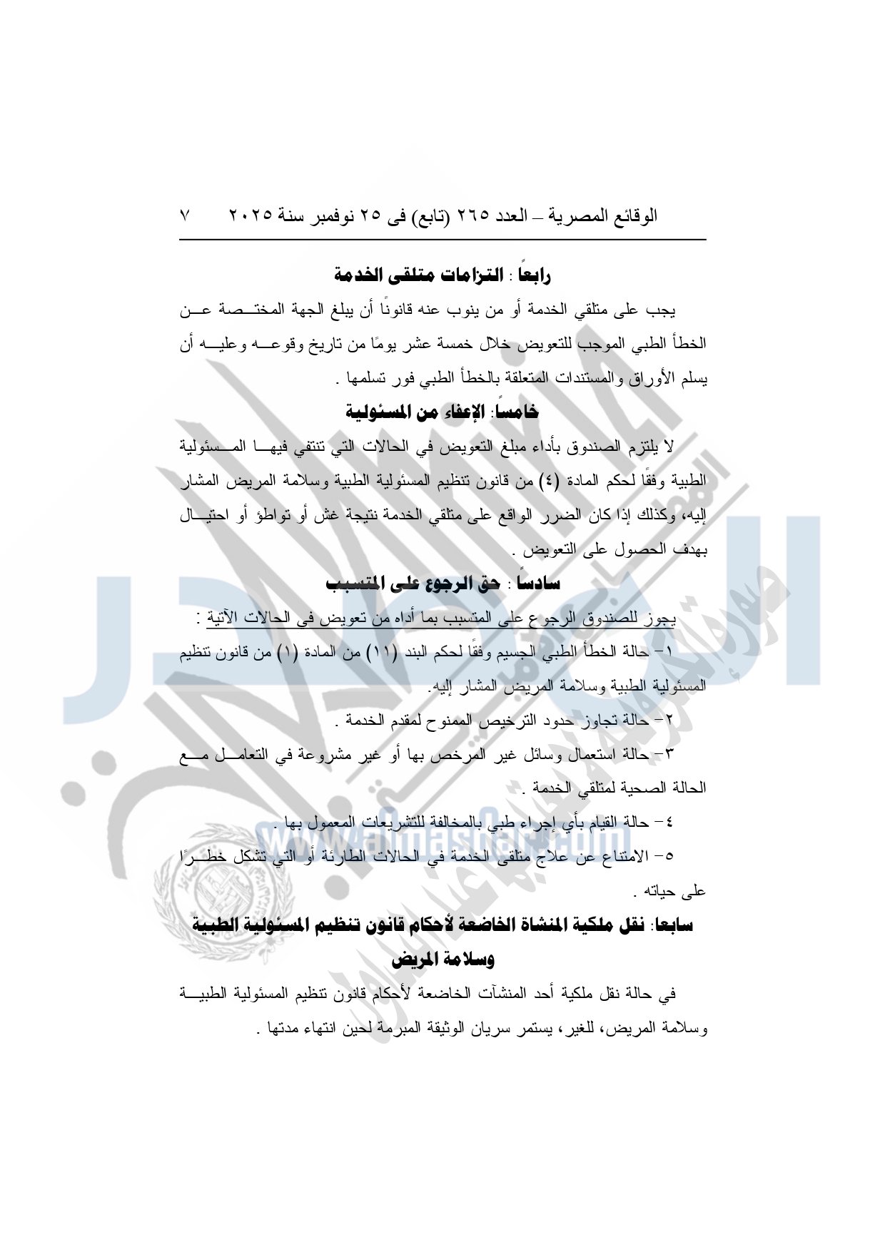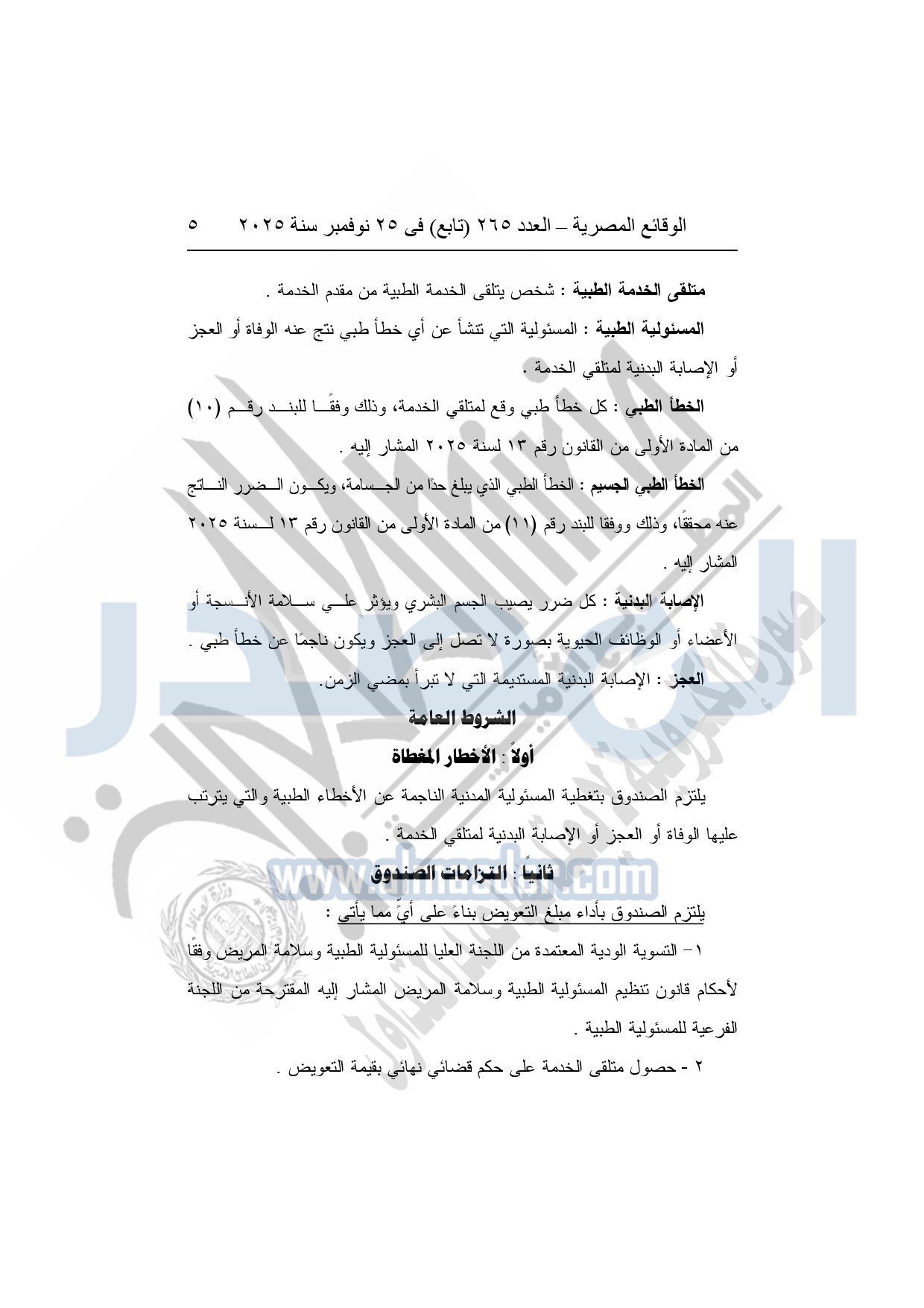نشرت الوقائع المصرية، في العدد 265 "تابع"، الصادر في 25 نوفمبر سنة 2025، قرار الهيئة العامة للرقابة المالية، رقم 272 لسنة 2025، بشأن نموذج وثيقة الصندوق الحكومي للتأمين ضد الأخطار الناجمة عن الأخطاء الطبية المنشأ وفقًا لقانون تنظيم المسئولية الطبية وسلامة المريض.