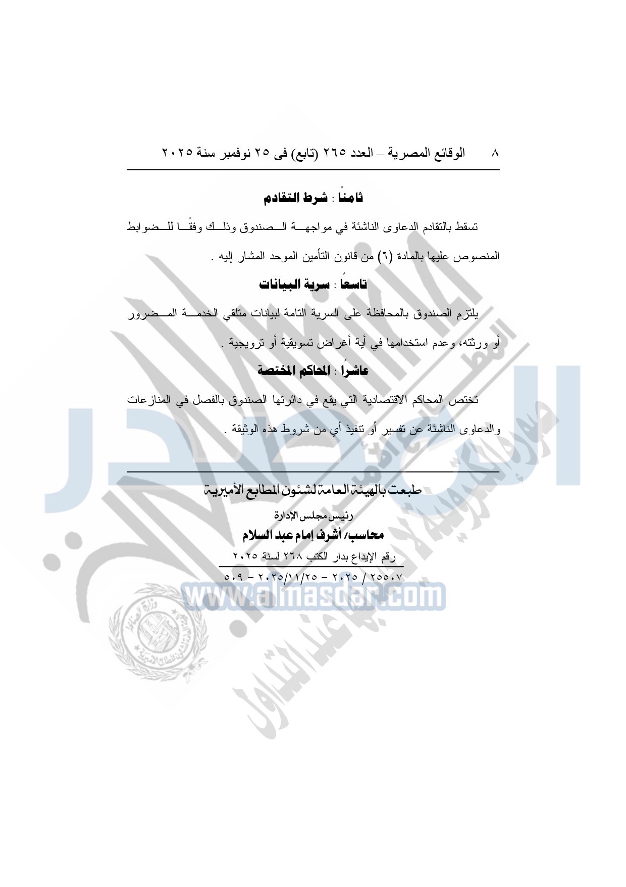 يُنشر هذا القرار في الوقائع المصرية وعلى الموقع الإلكتروني للهيئة والصندوق، ويُعمل به من اليوم التالي لتاريخ نشره بالوقائع المصرية.