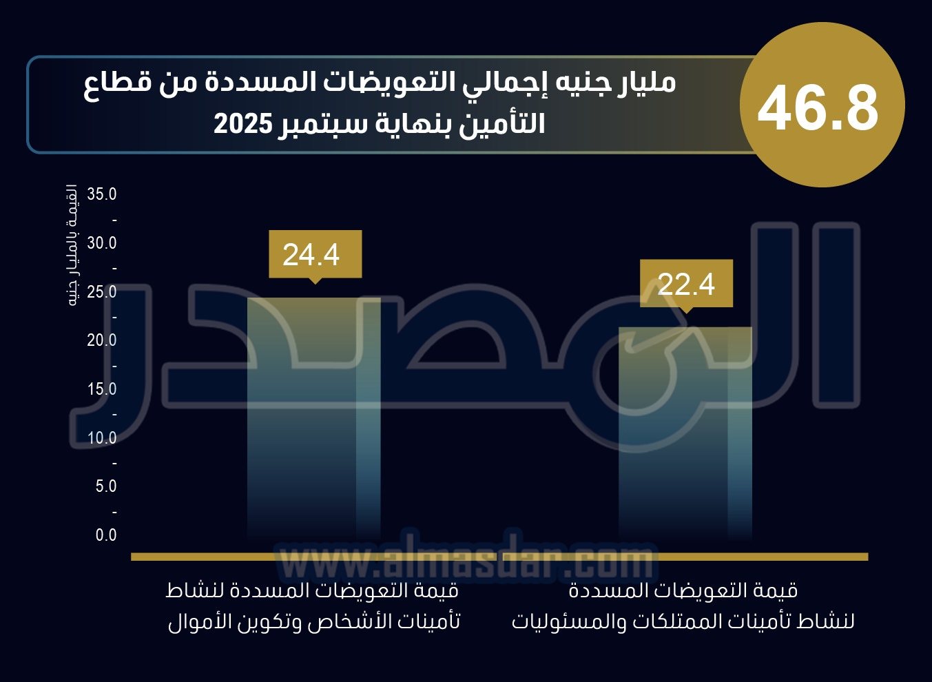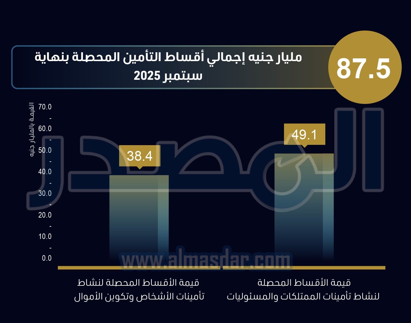 وبلغ إجمالي أقساط التأمين المحصلة 87.5 مليار جنيه بنهاية سبتمبر 2025، بينما إجمالي التعويضات المسددة من قطاع التأمين سجل 46.8 مليار جنيه، فيما سجلت استثمارات صناديق التأمين الخاصة 22.9 مليار جنيه.