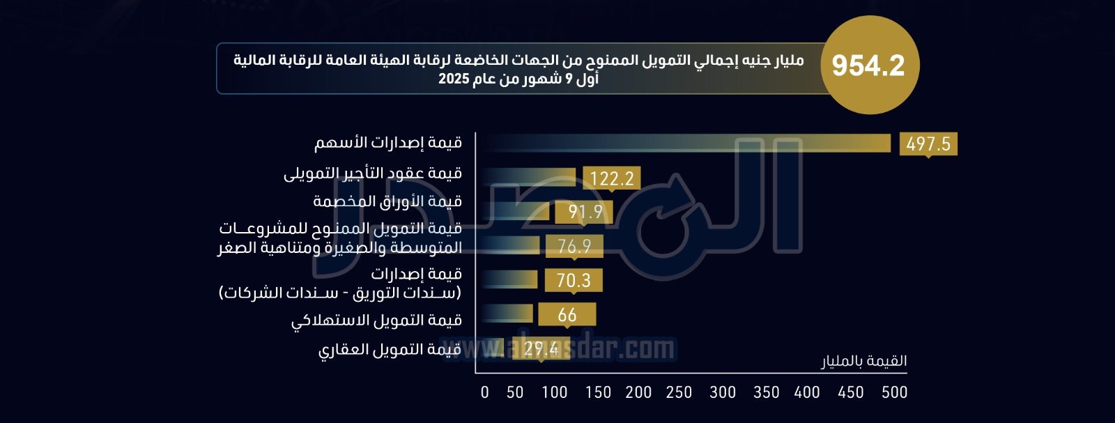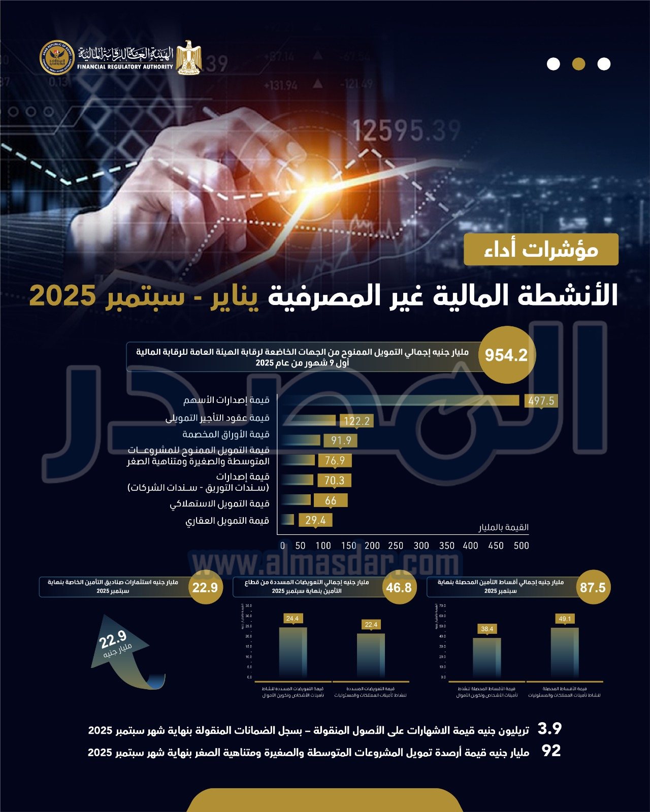 كشفت الهيئة العامة للرقابة المالية، عن وصول إجمالي التمويل الممنوح من خلال الجهات الخاضعة لرقابة الهيئة "أنشطة سوق رأس المال، أنشطة التمويل غير المصرفي" إلى نحو 954.2 مليار جنيه خلال الفترة من يناير إلى سبتمبر 2025.