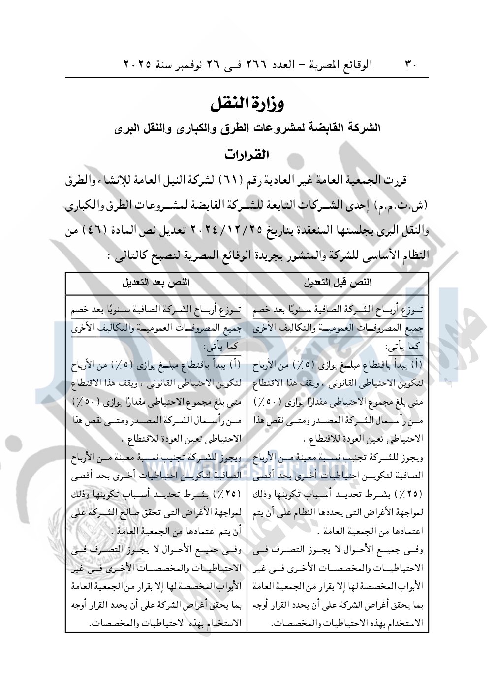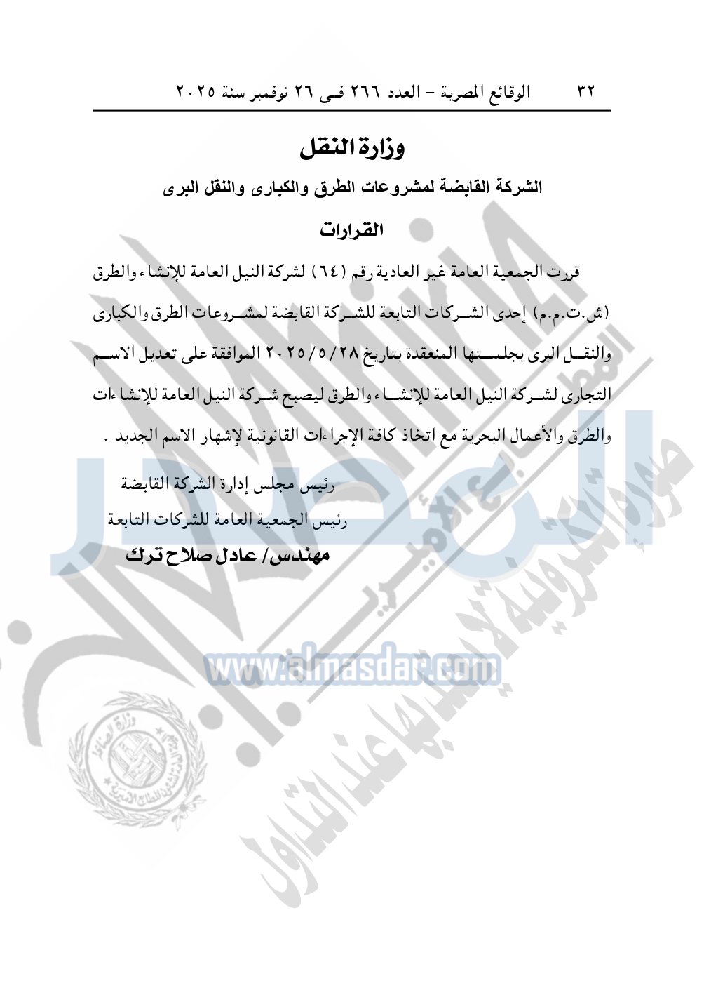 نشرت الوقائع المصرية في العدد 266، بتاريخ 26 نوفمبر 2025، قرار وزارة النقل، الشركة القابضة لمشروعات الطرق والكبارى والنقل البرى.