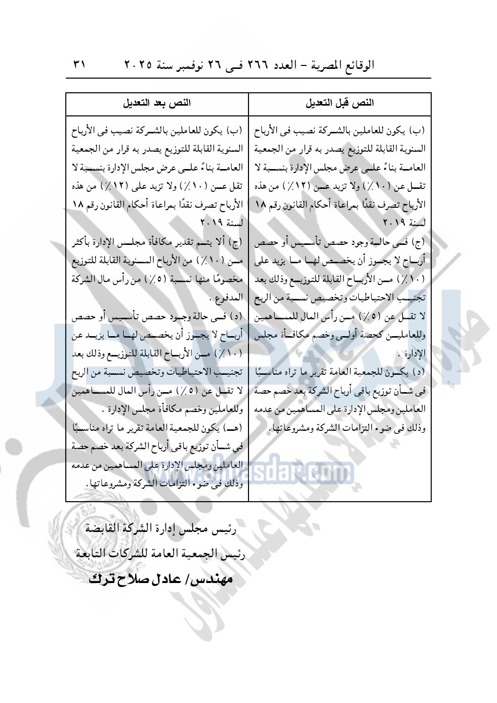 "ب" يكون للعاملين بالشركة نصيب في الأرباح السنوية القابلة للتوزيع يصدر به قرار من الجمعية العامة بناءً على عرض مجلس الإدارة بنسبة لا تقل عن "10%" ولا تزيد على "12%" من هذه الأرباح تصرف نقدًا بمراعاة أحكام القانون رقم 18 لسنة 2019.