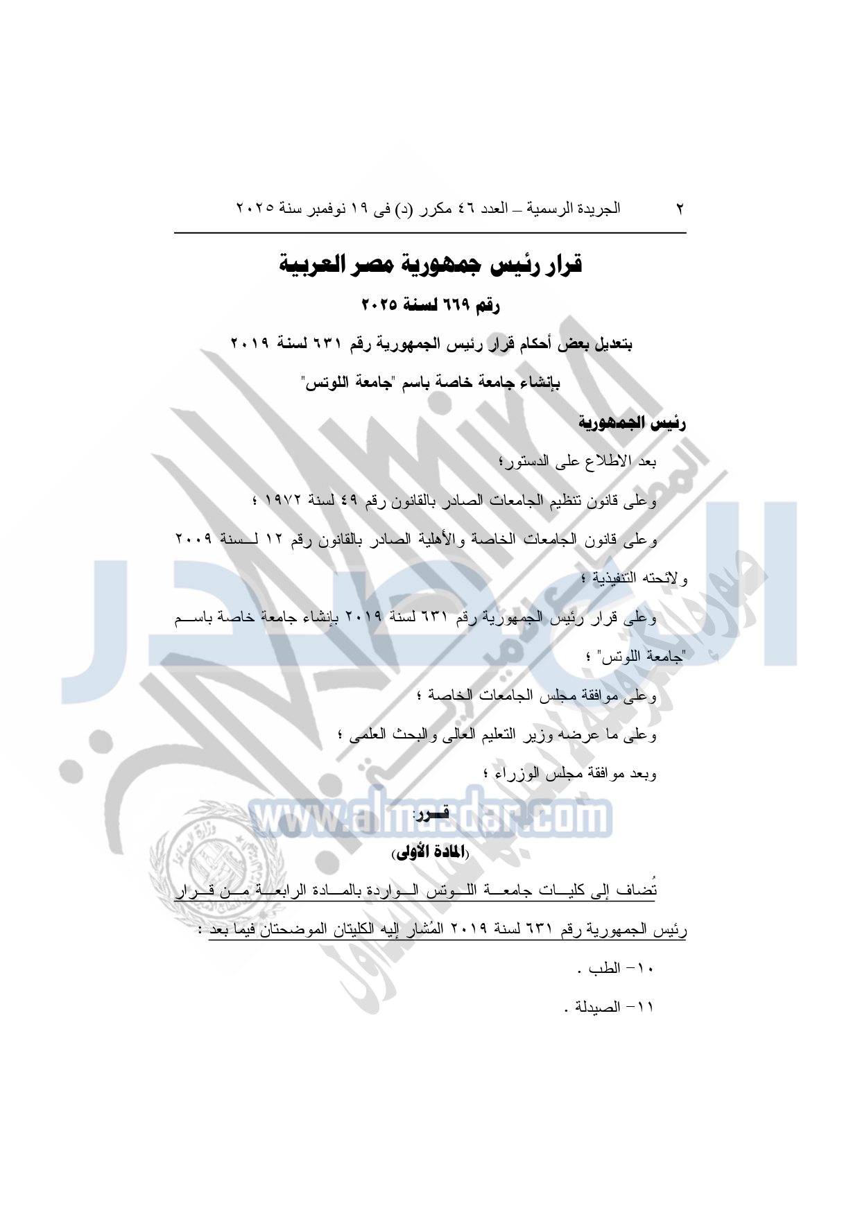 نشرت الجريدة الرسمية، في العدد 266 تابع "د"، الصادر في 19 نوفمبر سنة 2025، قرار رئيس جمهورية مصر العربية، رقم 669 لسنة 2025، بتعديل بعض أحكام قرار رئيس الجمهورية رقم 631 لسنة 2019، بشأن إنشاء جامعة خاصة باسم "جامعة اللوتس".