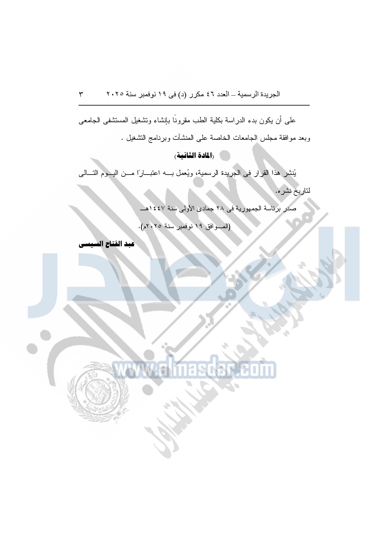 على أن يكون بدء الدراسة بكلية الطب مقرونا بإنشاء وتشغيل المستشفى الجامعي وبعد موافقة مجلس الجامعات الخاصة على المنشآت وبرنامج التشغيل.
