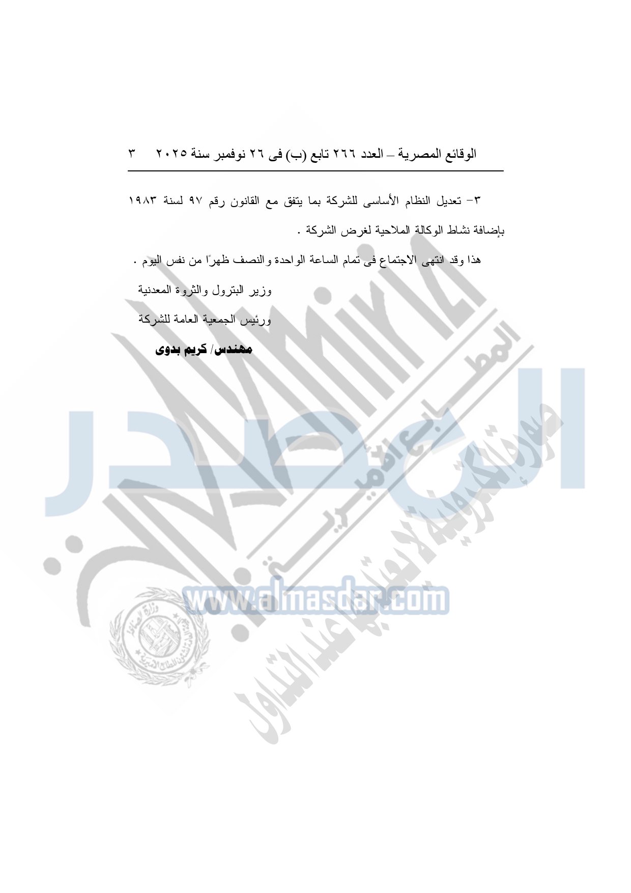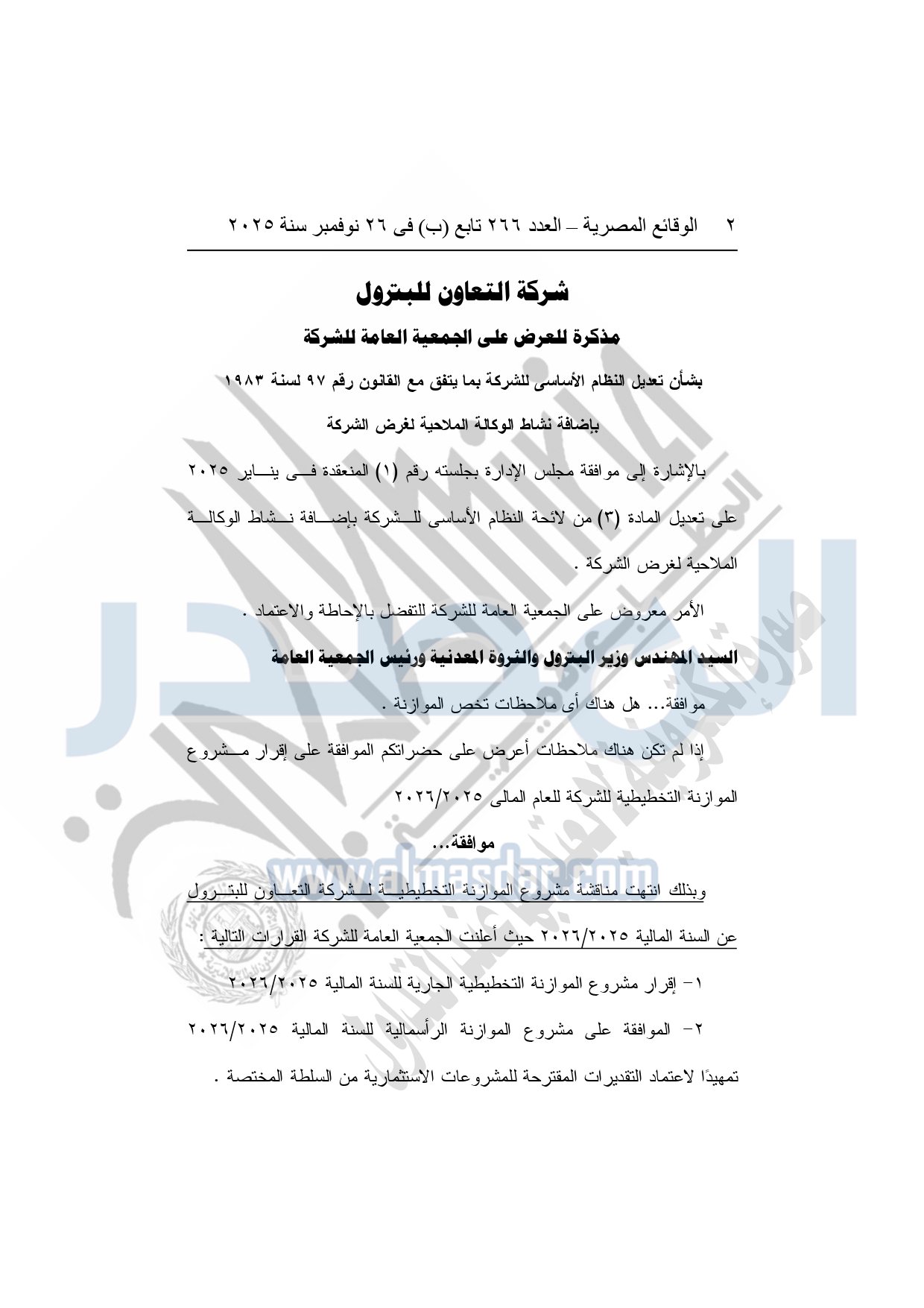 نشرت الوقائع المصرية، في العدد 266 تابع "ب"، الصادر في 26 نوفمبر سنة 2025، شركة التعاون للبترول، مذكرة للعرض على الجمعية العامة للشركة، بشأن تعديل النظام الأساسي للشركة بما يتفق مع القانون رقم 97 لسنة 1983 بإضافة نشاط الوكالة الملاحية لغرض الشركة.