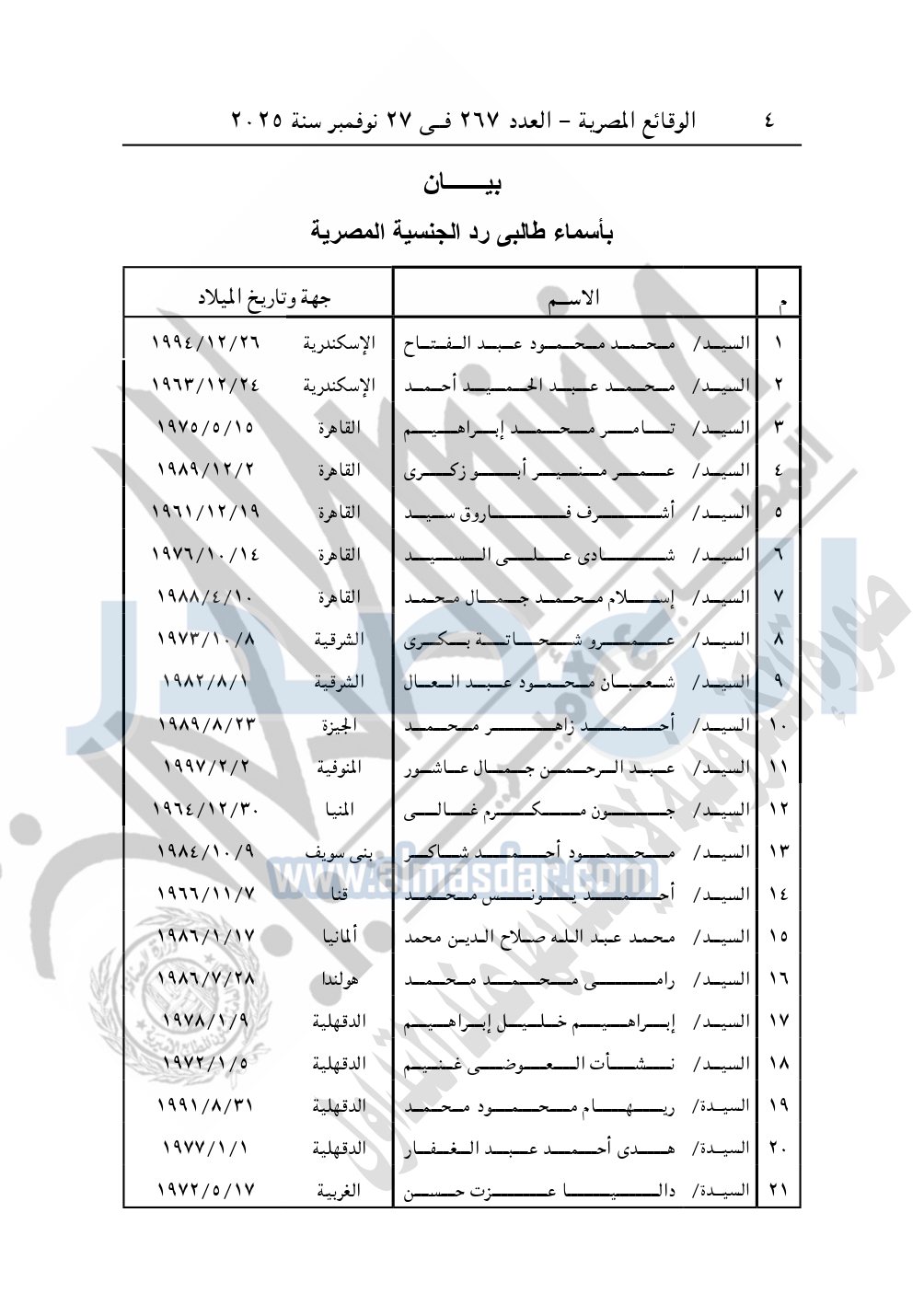 نشرت الوقائع المصرية في العدد 267 الصادر في 27 نوفمبر سنة 2025، قرار وزارة الداخلية، رقم 1965 لسنة 2025، بشأن رد الجنسية المصرية لـ21 أشخاص.
