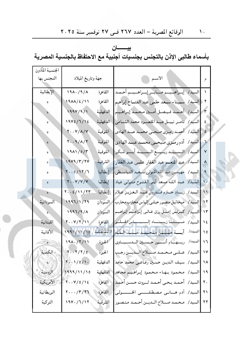كما نشرت الوقائع المصرية في العدد 267 الصادر في 27 نوفمبر سنة 2025، قرار وزارة الداخلية، رقم 1982 لسنة 2025، بشأن الإذن للاثنين والعشرين مواطن بالحصول على الجنسية الأجنبية مع احتفاظهم بالجنسية المصرية.