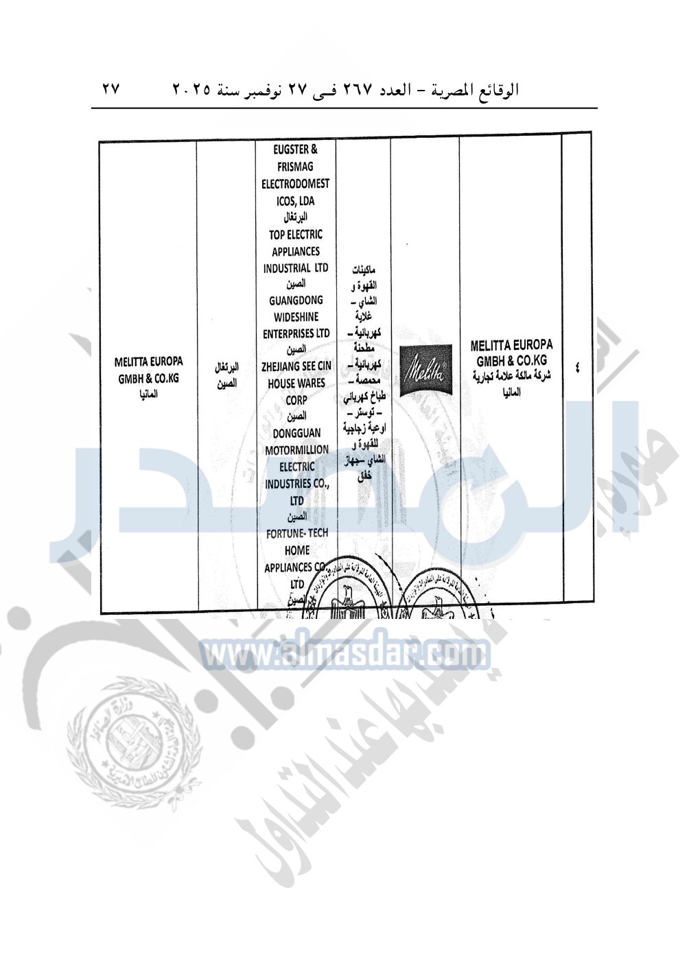 كما نشرت الوقائع المصرية في العدد 267، الصادر في 27 نوفمبر 2025، قرار الهيئة العامة للرقابة على الصادرات والواردات رقم 1299 لسنة 2025، بشأن قيد بعض المصانع والشركات مالكة العلامات التجارية المستوفاة لقواعد تسجيل المصانع المؤهلة لتصدير منتجاتها إلى جمهورية مصر العربية.