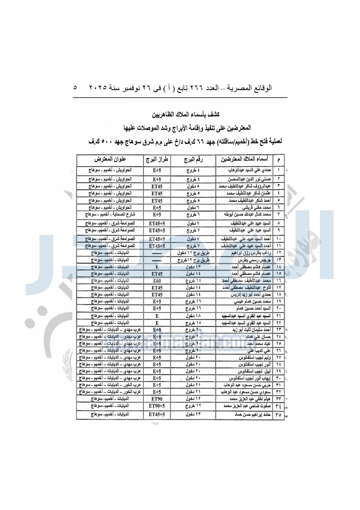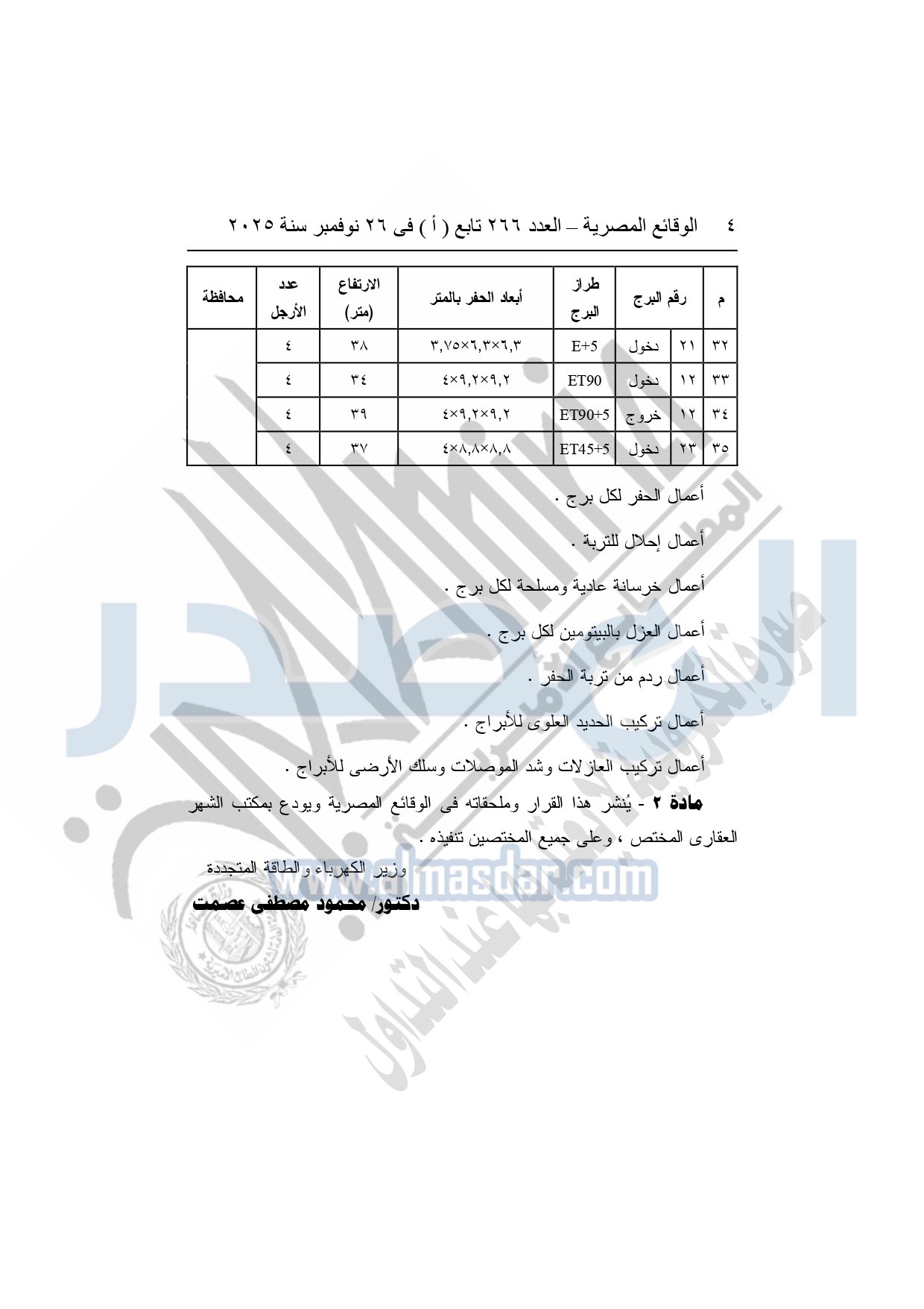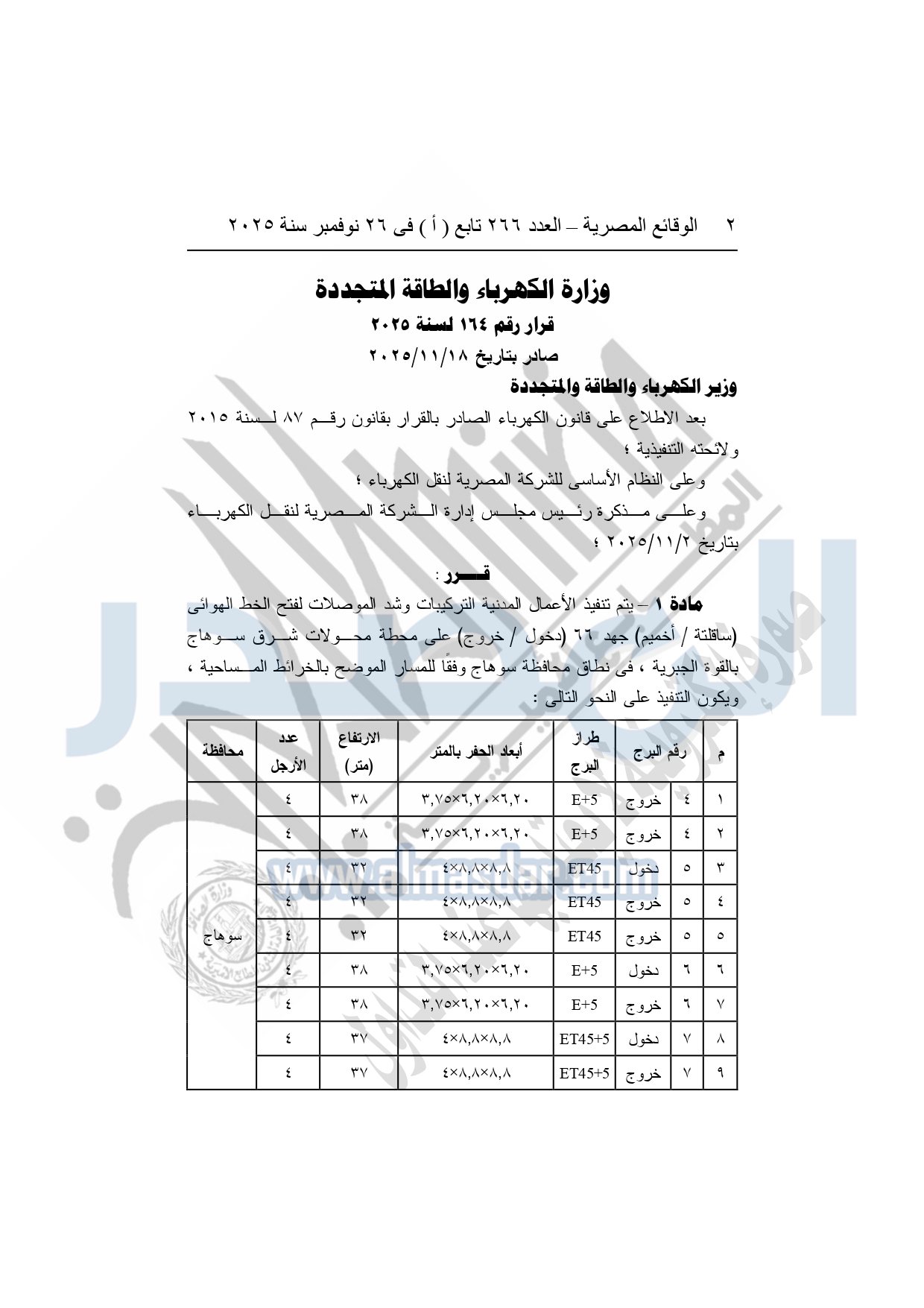 نشرت الوقائع المصرية في العدد 266 تابع "أ"، الصادر في 26 نوفمبر سنة 2025، قرار وزارة الكهرباء والطاقة المتجددة، رقم 164 لسنة 2025، بتاريخ 18-11-2025، بشأن تنفيذ الأعمال المدنية التركيبات وشد الموصلات لفتح الخط الهوائي على محطة محولات شرق سوهاج بالقوة الجبرية.