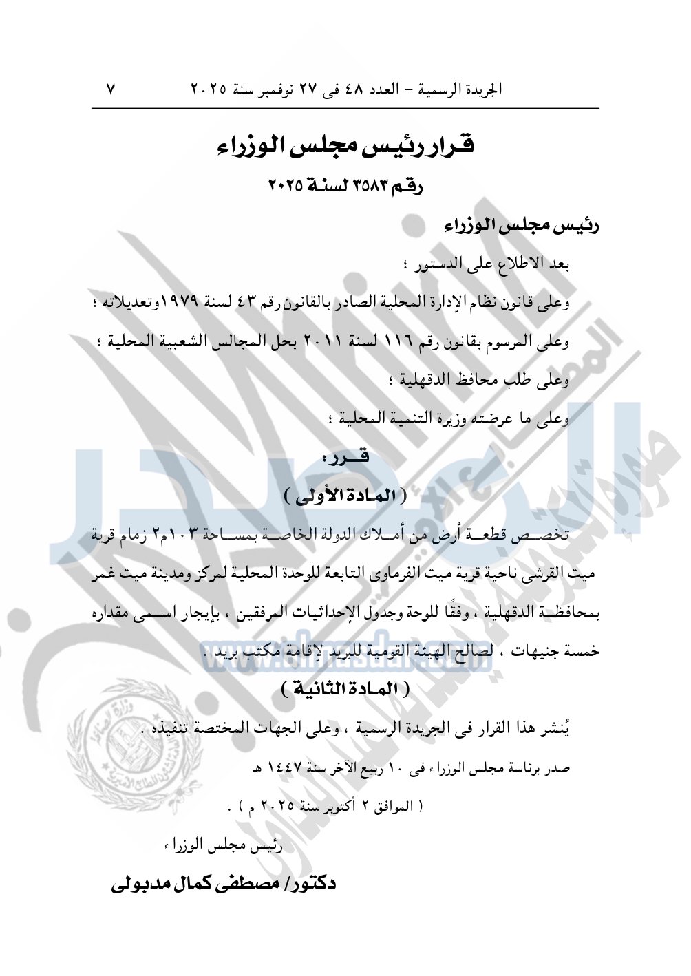نشرت الجريدة الرسمية في العدد 48، الصادر في 27 نوفمبر سنة 2025، قرار رئيس مجلس الوزراء، رقم 3583 لسنة 2025، بشأن تخصيص قطعة أرض لإقامة مكتب بريد بمحافظة الدقهلية.